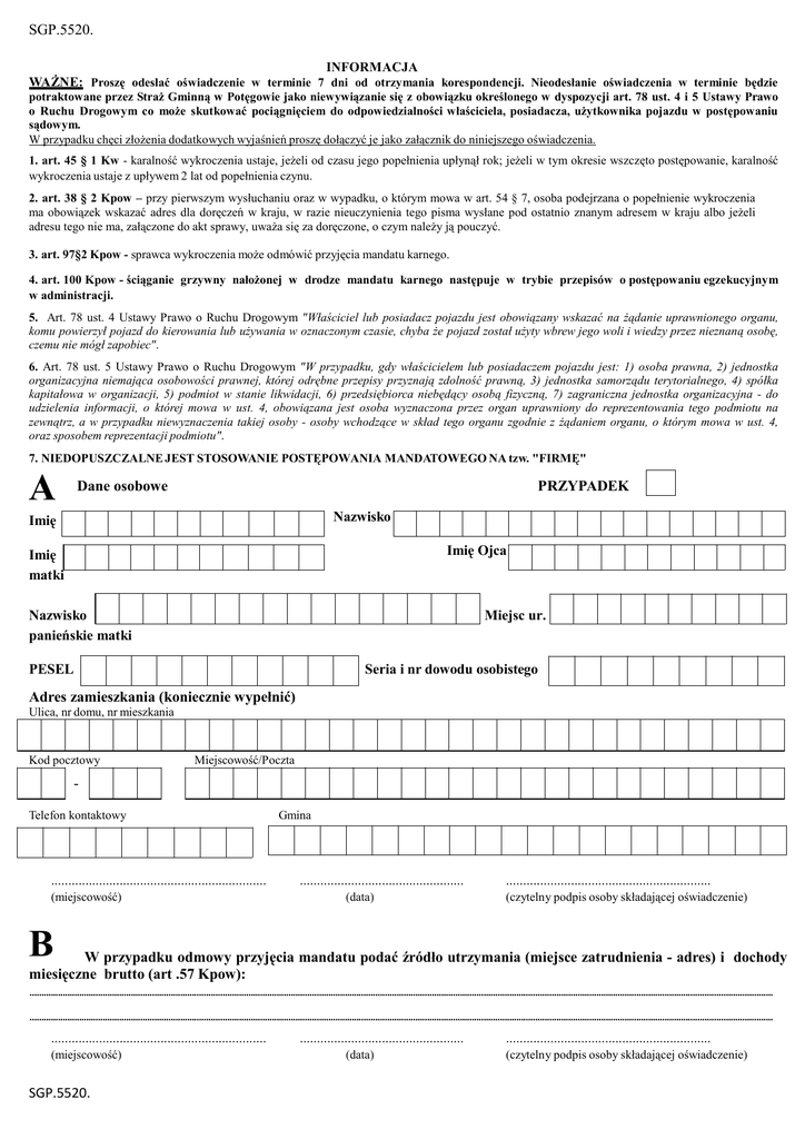 SGP.5520. INFORMACJA WAŻNE: Proszę odesłać oświadczenie w terminie 7 dni od otrzymania korespondencji. Nieodesłanie oświadczenia w terminie będzie potraktowane przez Straż Gminną w Potęgowie jako niewywiązanie się z obowiązku określonego w dyspozycji art. 78 ust. 4 i 5 Ustawy Prawo o Ruchu Drogowym co może skutkować pociągnięciem do odpowiedzialności właściciela, posiadacza, użytkownika pojazdu w postępowaniu sądowym. W przypadku chęci złożenia dodatkowych wyjaśnień proszę dołączyć je jako załącznik do niniejszego oświadczenia. 1. art. 45 § 1 Kw - karalność wykroczenia ustaje, jeżeli od czasu jego popełnienia upłynął rok; jeżeli w tym okresie wszczęto postępowanie, karalność wykroczenia ustaje z upływem 2 lat od popełnienia czynu. 2. art. 38 § 2 Kpow – przy pierwszym wysłuchaniu oraz w wypadku, o którym mowa w art. 54 § 7, osoba podejrzana o popełnienie wykroczenia ma obowiązek wskazać adres dla doręczeń w kraju, w razie nieuczynienia tego pisma wysłane pod ostatnio znanym adresem w kraju albo jeżeli adresu tego nie ma, załączone do akt sprawy, uważa się za doręczone, o czym należy ją pouczyć. 3. art. 97§2 Kpow - sprawca wykroczenia może odmówić przyjęcia mandatu karnego. 4. art. 100 Kpow - ściąganie grzywny nałożonej w drodze mandatu karnego następuje w trybie przepisów o postępowaniu egzekucyjnym w administracji. 5. Art. 78 ust. 4 Ustawy Prawo o Ruchu Drogowym "Właściciel lub posiadacz pojazdu jest obowiązany wskazać na żądanie uprawnionego organu, komu powierzył pojazd do kierowania lub używania w oznaczonym czasie, chyba że pojazd został użyty wbrew jego woli i wiedzy przez nieznaną osobę, czemu nie mógł zapobiec". 6. Art. 78 ust. 5 Ustawy Prawo o Ruchu Drogowym "W przypadku, gdy właścicielem lub posiadaczem pojazdu jest: 1) osoba prawna, 2) jednostka organizacyjna niemająca osobowości prawnej, której odrębne przepisy przyznają zdolność prawną, 3) jednostka samorządu terytorialnego, 4) spółka kapitałowa w organizacji, 5) podmiot w stanie likwidacji, 6) przedsiębiorca niebędący osobą fizyczną, 7) zagraniczna jednostka organizacyjna - do udzielenia informacji, o której mowa w ust. 4, obowiązana jest osoba wyznaczona przez organ uprawniony do reprezentowania tego podmiotu na zewnątrz, a w przypadku niewyznaczenia takiej osoby - osoby wchodzące w skład tego organu zgodnie z żądaniem organu, o którym mowa w ust. 4, oraz sposobem reprezentacji podmiotu". 7. NIEDOPUSZCZALNE JEST STOSOWANIE POSTĘPOWANIA MANDATOWEGO NA tzw. "FIRMĘ" A Dane osobowe PRZYPADEK Nazwisko Imię Imię Ojca Imię matki Nazwisko panieńskie matki Miejsc ur. PESEL Seria i nr dowodu osobistego Adres zamieszkania (koniecznie wypełnić) Ulica, nr domu, nr mieszkania Kod pocztowy Miejscowość/Poczta Telefon kontaktowy ............................................................... (miejscowość) Gmina ................................................ (data) ............................................................ (czytelny podpis osoby składającej oświadczenie) B W przypadku odmowy przyjęcia mandatu podać źródło utrzymania (miejsce zatrudnienia - adres) i dochody miesięczne brutto (art .57 Kpow): ............................................................................................................................................................................................................................................................................................................................ ............................................................................................................................................................................................................................................................................................................................ ............................................................... (miejscowość) SGP.5520. ................................................ (data) ............................................................ (czytelny podpis osoby składającej oświadczenie)