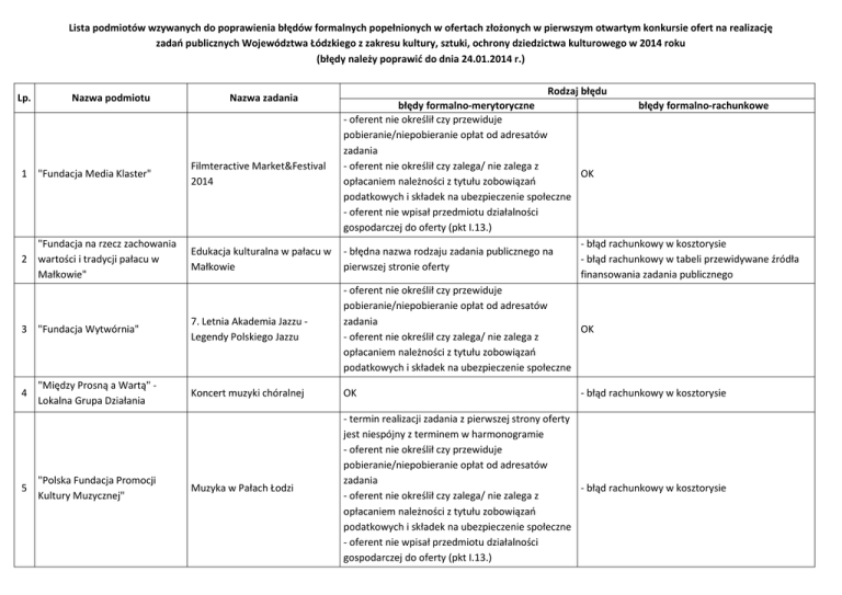Lista podmiotów wzywanych do poprawienia błędów formalnych popełnionych w ofertach złożonych w pierwszym otwartym konkursie ofert na realizację zadań publicznych Województwa Łódzkiego z zakresu kultury, sztuki, ochrony dziedzictwa kulturowego w 2014 roku (błędy należy poprawić do dnia 24.01.2014 r.) Lp. Nazwa podmiotu Nazwa zadania 1 "Fundacja Media Klaster" Filmteractive Market&Festival 2014 "Fundacja na rzecz zachowania 2 wartości i tradycji pałacu w Małkowie" Edukacja kulturalna w pałacu w Małkowie 3 "Fundacja Wytwórnia" 7. Letnia Akademia Jazzu Legendy Polskiego Jazzu 4 5 "Między Prosną a Wartą" Lokalna Grupa Działania "Polska Fundacja Promocji Kultury Muzycznej" Rodzaj błędu błędy formalno-merytoryczne błędy formalno-rachunkowe - oferent nie określił czy przewiduje pobieranie/niepobieranie opłat od adresatów zadania - oferent nie określił czy zalega/ nie zalega z OK opłacaniem należności z tytułu zobowiązań podatkowych i składek na ubezpieczenie społeczne - oferent nie wpisał przedmiotu działalności gospodarczej do oferty (pkt I.13.) - błąd rachunkowy w kosztorysie - błędna nazwa rodzaju zadania publicznego na - błąd rachunkowy w tabeli przewidywane źródła pierwszej stronie oferty finansowania zadania publicznego - oferent nie określił czy przewiduje pobieranie/niepobieranie opłat od adresatów zadania OK - oferent nie określił czy zalega/ nie zalega z opłacaniem należności z tytułu zobowiązań podatkowych i składek na ubezpieczenie społeczne Koncert muzyki chóralnej OK - błąd rachunkowy w kosztorysie Muzyka w Pałach Łodzi - termin realizacji zadania z pierwszej strony oferty jest niespójny z terminem w harmonogramie - oferent nie określił czy przewiduje pobieranie/niepobieranie opłat od adresatów zadania - błąd rachunkowy w kosztorysie - oferent nie określił czy zalega/ nie zalega z opłacaniem należności z tytułu zobowiązań podatkowych i składek na ubezpieczenie społeczne - oferent nie wpisał przedmiotu działalności gospodarczej do oferty (pkt I.13.) - błędna nazwa rodzaju zadania publicznego - brak dat dziennych zakończenia i rozpoczęcia realizacji zadania w harmonogramie oferty - oferta niepodpisana przez upoważnione osoby - błąd rachunkowy w kosztorysie - oferent nie określił czy zalega/ nie zalega z opłacaniem należności z tytułu zobowiązań podatkowych i składek na ubezpieczenie społeczne - oferent nie określił czy przewiduje pobieranie/niepobieranie opłat od adresatów zadania OK - oferent nie określił czy zalega/ nie zalega z opłacaniem należności z tytułu zobowiązań podatkowych i składek na ubezpieczenie społeczne "Stowarzyszenie Rozwoju i 6 Promocji Wsi Trzepnica oraz okolic" "Dla kultury, dla ludzi - dla regionu" "Stowarzyszenie Rozwoju 7 Opoczyńskiej Wsi" Wielkanoc w Opocznie wokół baby się toczy - świąteczne tradycje, obrzędy i smaki 8 Caritas Archidiecezji Łódzkiej Trójstyk - cykl działań z zakresu edukacji regionalnej i dziedzictwa kulturowego - brak wyciągu z KRS-u Dziedzictwo filmowe województwa łódzkiego - termin realizacji zadania z pierwszej strony oferty OK jest niespójny z terminem w harmonogramie 10 Fabryka Sztuki Nie boję się muzyki OK - błąd rachunkowy w tabeli przewidywane źródła finansowania zadania publicznego 11 Fundacja "Afryka Connect" Pod powiekami miasta - błędna nazwa rodzaju zadania publicznego - brak statutu oferenta - błąd rachunkowy w kosztorysie Akademia Aktywnego współtworzenia, współgrania, współdziałania - oferent nie określił czy przewiduje pobieranie/niepobieranie opłat od adresatów zadania OK - oferent nie określił czy zalega/ nie zalega z opłacaniem należności z tytułu zobowiązań podatkowych i składek na ubezpieczenie społeczne 9 Centrum Inicjatyw na rzecz Rozwoju "Regio" Fundacja "Aktywne Centrum 12 Edukacji Uniwersytet Otwarty Dla Każdego" OK 13 Fundacja "Dom Muzyki" 14 Fundacja "Dom w Łodzi" 15 Fundacja "Generator Kultury" 16 Fundacja "Generator Kultury" 17 Fundacja "Ocalić od zapomnienia" Widowisko muzyczno-taneczne "Łajza" Konkurs plastyczny "Mój dom, moja rodzina" oraz dedykowany spektakl w teatrze dla uczestników konkursu Realizacja filmu dokumentalnego "Moje spotkania z historią wspomnienia" Realizacja filmu fabularnego historycznego pod tytułem "Dzik" "W Łodzi i regionie - śladami XIX-wiecznych papierni" 18 Fundacja "Pierwiastek Trzeciego EtnoLodzkie Stopnia" 19 Fundacja Artystyczna Erina B "Nagranie wywiadów z Powstańcami Warszawskimi w Łodzi" - termin realizacji zadania z pierwszej strony oferty jest niespójny z terminem w harmonogramie - oferent nie określił czy przewiduje pobieranie/niepobieranie opłat od adresatów OK zadania - oferent nie określił czy zalega/ nie zalega z opłacaniem należności z tytułu zobowiązań podatkowych i składek na ubezpieczenie społeczne - błędna nazwa rodzaju zadania publicznego na pierwszej stronie oferty - błąd rachunkowy w kosztorysie - błąd rachunkowy w tabeli przewidywane źródła finansowania zadania publicznego - wskazano błędną datę związania ofertą - statut niepotwierdzony za zgodność z oryginałem OK - wskazano błędną datę związania ofertą - statut niepotwierdzony za zgodność z oryginałem OK - błędna nazwa rodzaju zadania publicznego na pierwszej stronie oferty - oferent nie określił czy przewiduje pobieranie/niepobieranie opłat od adresatów zadania OK - oferent nie określił czy zalega/ nie zalega z opłacaniem należności z tytułu zobowiązań podatkowych i składek na ubezpieczenie społeczne - oferent nie wpisał przedmiotu działalności gospodarczej do oferty (pkt I.13.) OK - błąd rachunkowy w tabeli przewidywane źródła finansowania zadania publicznego - błędna nazwa rodzaju zadania publicznego - wskazano błędną datę związania ofertą - błąd rachunkowy w kosztorysie - błąd rachunkowy w tabeli przewidywane źródła finansowania zadania pu