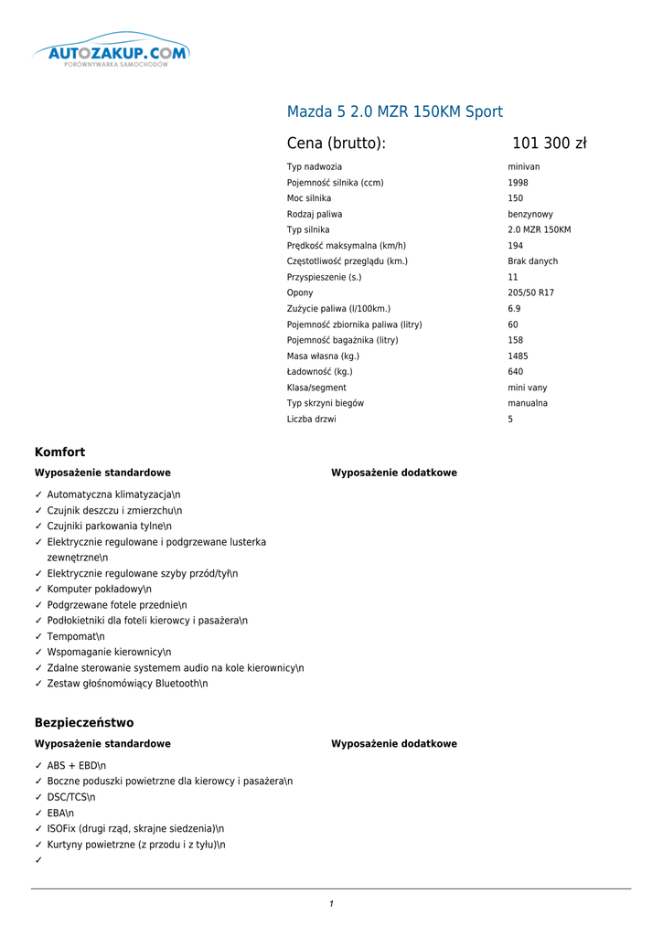 Mazda 5 2.0 MZR 150KM Sport Cena (brutto): 101 300 zł Typ nadwozia minivan Pojemność silnika (ccm) 1998 Moc silnika 150 Rodzaj paliwa benzynowy Typ silnika 2.0 MZR 150KM Prędkość maksymalna (km/h) 194 Częstotliwość przeglądu (km.) Brak danych Przyspieszenie (s.) 11 Opony 205/50 R17 Zużycie paliwa (l/100km.) 6.9 Pojemność zbiornika paliwa (litry) 60 Pojemność bagażnika (litry) 158 Masa własna (kg.) 1485 Ładowność (kg.) 640 Klasa/segment mini vany Typ skrzyni biegów manualna Liczba drzwi 5 Komfort Wyposażenie standardowe Wyposażenie dodatkowe ✓ Automatyczna klimatyzacja\n ✓ Czujnik deszczu i zmierzchu\n ✓ Czujniki parkowania tylne\n ✓ Elektrycznie regulowane i podgrzewane lusterka zewnętrzne\n ✓ Elektrycznie regulowane szyby przód/tył\n ✓ Komputer pokładowy\n ✓ Podgrzewane fotele przednie\n ✓ Podłokietniki dla foteli kierowcy i pasażera\n ✓ Tempomat\n ✓ Wspomaganie kierownicy\n ✓ Zdalne sterowanie systemem audio na kole kierownicy\n ✓ Zestaw głośnomówiący Bluetooth\n Bezpieczeństwo Wyposażenie standardowe Wyposażenie dodatkowe ✓ ABS + EBD\n ✓ Boczne poduszki powietrzne dla kierowcy i pasażera\n ✓ DSC/TCS\n ✓ EBA\n ✓ ISOFix (drugi rząd, skrajne siedzenia)\n ✓ Kurtyny powietrzne (z przodu i z tyłu)\n ✓ 1 Przednie poduszki powietrzne kierowcy i pasażera\n 2 ✓ Reflektory ksenonowe\n ✓ Reflektory przeciwmgielne\n ✓ System monitorowania ciśnienia w oponach - TPMS\n ✓ System sygnalizacji nagłego hamowania\n Dodatki Wyposażenie standardowe Wyposażenie dodatkowe ✓ Audio AM/ FM, RDS CD/ MP3 6 głośników ✕ Lakier metaliczny/mika 1900 PLN ✓ Automatyczne włączanie świateł mijania\n ✓ Elektrycznie sterowane przesuwne tylne drzwi boczne\n ✓ Koła 205/50 R17 na felgach aluminiowych\n ✓ Podłokietniki (skrajne fotele drugiego rzędu)\n ✓ Przesuwane fotele w drugim rzędzie, regulacja nachylenia oparcia\n ✓ Przesuwne tylne drzwi boczne\n ✓ Przyciemniane szyby: tylna oraz tylne boczne\n ✓ Roleta bagażnika\n ✓ Skórzana kierownica oraz gałka dźwigni zmiany biegów\n ✓ Skórzana tapicerka\n ✓ Składane siedzenia w 3-cim rzędzie (płaska podłoga)\n ✓ Spryskiwacze reflektorów\n ✓ Stoliki w oparciach przednich foteli\n ✓ System siedzeń i schowki Karakuri\n ✓ Wbudowana zmieniarka na 6CD\n ✓ Wejście AUX\n ✓ Zdalnie sterowany centralny zamek (składany kluczyk)\n ✓ Zestaw Sports Appearance Pack\n Doprecyzowanie oferty Kontakt: Nazwa użytkownika: admin Nazwa firmy: qqq Adres: qqq 12, 41-706 qqq1, NIP: 954 REGON: 1 Telefon: 123, 1 Fax: 1 Email: 1 www: 3
