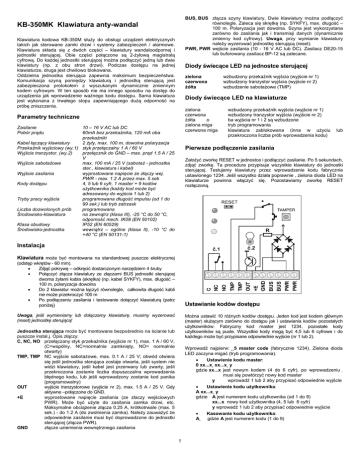 BUS, BUS złącza szyny klawiatury. Dwie klawiatury można podłączyć równolegle. Zaleca się skrętkę (np. SYKFY), max. długość – 100 m. Polaryzacja jest dowolna. Szyna jest wykorzystana zarówno do zasilania jak i transmisji danych (dynamicznie zmienny kod cyfrowy). Uwaga, przy wymianie klawiatury należy wyzerować jednostkę sterującą (reset). PWR, PWR wejście zasilania (10 - 16 V AC lub DC). Zasilacz DE20-15 lub buforowany zasilacz BP-12 są zalecane. KB-350MK Klawiatura anty-wandal Klawiatura kodowa KB-350M służy do obsługi urządzeń elektrycznych takich jak sterowane zamki drzwi i systemy zabezpieczeń / alarmowe. Klawiatura składa się z dwóch części – klawiatury wandaloodpornej i jednostki sterującej. Obie części połączone są 2-żyłową magistralą cyfrową. Do każdej jednostki sterującej można podłączyć jedną lub dwie klawiatury (np. z obu stron drzwi). Podczas dostępu na jednej klawiaturze, druga jest chwilowo blokowana. Oddzielna jednostka sterująca zapewnia maksimum bezpieczeństwa. Komunikacja szyną pomiędzy klawiaturą i jednostką sterującą jest zabezpieczona protokołem z wyszukanym dynamicznie zmiennym kodem cyfrowym. W ten sposób nie ma innego sposobu na dostęp do urządzenia jak wprowadzenie ważnego kodu dostępu. Sama klawiatura jest wykonana z trwałego stopu zapewniającego dużą odporność na próbę zniszczenia. Diody świecące LED na jednostce sterującej zielona czerwona żółta wzbudzony przekaźnik wyjścia (wyjście nr 1) wzbudzony tranzystor wyjścia (wyjście nr 2) wzbudzenie sabotażowe (TMP) Diody świecące LED na klawiaturze zielona czerwona żółta o zielona miga czerwona miga Parametry techniczne Zasilanie Pobór prądu 10 – 16 V AC lub DC 60mA bez przekaźnika, 120 mA oba przekaźniki Kabel łączący klawiatury 2 żyły, max. 100 m, dowolna polaryzacja Przekaźnik wyjściowy (wy.1) styk przełączalny 1 A / 60 V Wyjście tranzystor. (wy.2) przełącznik do GND – max. prąd 1.5 A / 25 V Wyjście sabotażowe max. 100 mA / 25 V (sabotaż - jednostka ster., klawiatura i kabel) Wyjście zasilania wyprostowane napięcie ze złączy wej. PWR - max. 1.2 A przez max. 5 sek Kody dostępu 4, 5 lub 6 cyfr, 1 master + 9 kodów użytkownika (każdy kod może być adresowany do wyjścia 1 lub 2) Tryby pracy wyjścia programowana długość impulsu (od 1 do 99 sek.) lub tryb zatrzask Liczba dozwolonych prób programowana Środowisko-klawiatura na zewnątrz (klasa III), -25 °C do 50 °C, odporność mech. IK08 (EN 50102) Klasa obudowy IP52 (EN 60529) Środowisko-jednostka wewnątrz – ogólne (klasa II), -10 °C do +40 °C (EN 50131-1) wzbudzony przekaźnik wyjścia (wyjście nr 1) wzbudzony tranzystor wyjścia (wyjście nr 2) ba wyjścia nr 1 i 2 są wzbudzone tryb programowania klawiatura zablokowana (inna w użyciu przekroczona liczba prób wprowadzenia kodu) lub Pierwsze podłączenie zasilania Założyć zworkę RESET w jednostce i podłączyć zasilanie. Po 5 sekundach, zdjąć zworkę. Ta procedura przypisuje wszystkie klawiatury do jednostki sterującej. Testujemy klawiatury przez wprowadzenie kodu fabrycznie ustawionego 1234. Jeśli wszystko działa poprawnie , zielona dioda LED na klawiaturze powinna włączyć się. Pozostawiamy zworkę RESET rozłączoną. Instalacja Klawiatura może być montowana na standardowej puszcze elektrycznej (odstęp wkrętów - 60 mm). • Zdjąć pokrywę – odkręcić dostarczonym narzędziem 4 śruby • Połączyć złącza klawiatury ze złączami BUS jednostki sterującej dwoma żyłami kabla (skrętka) (np. kabel SYKFY), max. długość – 100 m, polaryzacja dowolna • Do 2 klawiatur można łączyć równolegle, całkowita długość kabli nie może przekroczyć 100 m • Po podłączeniu zasilania i testowanie dołączyć klawiaturą (patrz poniżej) Ustawianie kodów dostępu Uwaga, jeśli wymieniamy lub dołączamy klawiaturę, musimy wyzerować (reset) jednostkę sterującą! Można ustawić 10 różnych kodów dostępu. Jeden kod jest kodem głównym (master) służącym zarówno do dostępu jak i ustawiania kodów pozostałych użytkowników. Fabryczny kod master jest 1234, pozostałe kody użytkowników są puste. Wszystkie kody mogą być 4,5 lub 6 cyfrowe i do każdego może być przypisane odpowiednie wyjście (nr 1 lub 2). Jednostka sterująca może być montowana bezpośrednio na ścianie lub puszcze instal.j. Opis złączy: C, NC, NO przełączany styk przekaźnika (wyjście nr 1), max. 1 A / 60 V, (C=wspólny, NC=normalnie zamknięty, NO= normalnie otwarty) TMP, TMP NC wyjście sabotażowe, max. 0.1 A / 25 V; obwód otwiera się jeśli jednostka sterująca zostaje otwarta, jeśli system nie widzi klawiatury, jeśli kabel jest przerwany lub zwarty, jeśli przekroczona zostanie liczba dopuszczalna wprowadzenia błędnego kodu, lub jeśli wprowadzony zostanie kod panika (programowalny) OUT wyjście tranzystorowe (wyjście nr 2), max. 1.5 A / 25 V. Gdy aktywne –połączone do GND. +E wyprostowane napięcie zasilania (ze złaczy wejściowych PWR). Może być użyte do zasilania zamka drzwi, etc. Maksymalne obciążenie złącza 0.25 A, krótkotrwale (max. 5 sek.) - do 1.2 A (do zwolnienia zamka). Należy zauważyć że odpowiednie zasilanie musi być doprowadzone do jednostki sterującej (złącza PWR). GND złącze uziemienia wewnętrznego zasilania Wprowadź najpierw: 5 master code (fabrycznie 1234). Zielona dioda LED zaczyna migać (tryb programowania). • Ustawienie kodu master: 0 xx...x xx...x y gdzie xx...x jest nowym kodem (4 do 6 cyfr), po wprowadzeniu musi się powtórzyć nowy kod master y wprowadź 1 lub 2 aby przypisać odpowiednie wyjście • Ustawienie kodu użytkownika: A xx...x y gdzie A jest numerem kodu użytkownika (od 1 do 9) xx...x nowy kod użytkownika (4, 5 lub 6 cyfr) y wprowadź 1 lub 2 aby przypisać odpowiednie wyjście • Kasowanie kodu użytkownika: A gdzie A jest numerem kodu (1 do 9) 1 Aby upuścić tryb ustawiania 