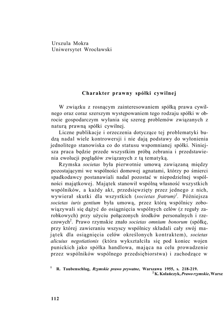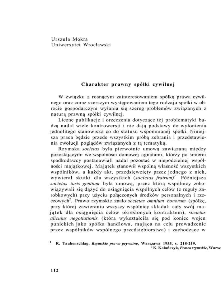 Urszula Mokra Uniwersytet Wrocławski Charakter prawny spółki cywilnej W związku z rosnącym zainteresowaniem spółką prawa cywilnego oraz coraz szerszym występowaniem tego rodzaju spółki w obrocie gospodarczym wyłania się szereg problemów związanych z naturą prawną spółki cywilnej. Liczne publikacje i orzeczenia dotyczące tej problematyki budzą nadal wiele kontrowersji i nie dają podstawy do wyłonienia jednolitego stanowiska co do statusu wspomnianej spółki. Niniejsza praca będzie przede wszystkim próbą zebrania i przedstawienia ewolucji poglądów związanych z tą tematyką. Rzymska societas była pierwotnie umową zawiązaną między pozostającymi we wspólności domowej agnatami, którzy po śmierci spadkodawcy postanawiali nadal pozostać w niepodzielnej wspólności majątkowej. Majątek stanowił wspólną własność wszystkich wspólników, a każdy akt, przedsięwzięty przez jednego z nich, wywierał skutki dla wszystkich (societas fratrum)1. Późniejsza societas iuris gentium była umową, przez którą wspólnicy zobowiązywali się dążyć do osiągnięcia wspólnych celów (z reguły zarobkowych) przy użyciu połączonych środków personalnych i rzeczowych2. Prawo rzymskie znało societas omnium bonorum (spółkę, przy której zawieraniu wszyscy wspólnicy składali cały swój maj ą t e k dla osiągnięcia celów określonych kontraktem), societas alicuius negotiationis (która wykształciła się pod koniec wojen punickich jako spółka handlowa, mająca na celu prowadzenie przez wspólników wspólnego przedsiębiorstwa) i zachodzące w 1 R. Taubenschlag, Rzymskie prawo prywatne, Warszawa 1955, s. 218-219. 2 K. Kolańczyk, Prawo rzymskie, Warsza 112 Charakter prawny spółki cywilnej epoce klasycznej: societas ąuaestus (obejmującą jako udział to wszystko, co wspólnicy swoją pracą, a więc odpłatnie, nabędą w przyszłości) oraz societas unius rei (odnoszącą się tylko do jednorazowej czynności)3. Spółka rzymska nie była odrębnym od wspólników podmiotem prawa. Na zewnątrz występowali wspólnicy, a nie spółka i nie można było mówić o prawach i obowiązkach spółki jako odrębnego podmiotu, ale o prawach i obowiązkach wspólników. Współcześnie w nauce prawa wyróżnić można dwie grupy poglądów na temat charakteru prawnego spółki cywilnej. Do pierwszej z nich należą koncepcje, mające zresztą najdłuższą tradycję, które odmawiają jej przymiotu samodzielnej podmiotowości prawnej. W drugiej zaś grupie mieszczą się poglądy uznające spółkę cywilną za odrębny od wspólników podmiot prawa. Przyjrzyjmy się najpierw pierwszej grupie poglądów. Zgodnie z art. 860 § 1 k.c. „przez umową spółki wspólnicy zobowiązują się dążyć do osiągnięcia wspólnego celu gospodarczego przez działanie w sposób oznaczony, w szczególności przez wniesienie wkładów". Według jednej z koncepcji jest to zatem umowa konsensualna, dwu lub wielostronnna, losowa. Zdaniem niektórych jest ona umową wzajemną. Wprawdzie wspólnicy, dążąc do osiągnięcia wspólnego celu nie wykonują swych zobowiązań jeden wobec drugiego, lecz działają razem, obok siebie i przez to wspólne działanie wykonują swe zobowiązania, uzyskując zarazem zaspokojenie przez osiągnięcie wspólnego celu, to jednak każdy ze wspólników dlatego zobowiązuje się do działania, ponieważ inni także się do tego zobowiązują i o tyle ich świadczenia są odpowiednikami 4 . Pomiędzy wspólnikami istnieje szczególnego rodzaju wspólność prawna, której wyrazem jest m a j ą t e k spółki (tzw. wspólność do niepodzielnej ręki), będący majątkiem wspólnym, obok którego każdy z nich może mieć swój majątek osobisty. Istnienie tego rodzaju wspólności prawnej nie decyduje jednak o istnieniu jednostki organizacyjnej, która po spełnieniu warunków przewidzianych w 3 4 W. Osuchowski, Zarys rzymskiego prawa prywatnego, Warszawa 1962, s. 391. R. Longchamps de Berier, Zobowiązania, Poznań 1948, s. 587-589; inaczej K. Kruczalak, Spółki prawa handlowego i cywilnego, Gdańsk 1992, W. Czachórski, Prawo zobowiązań w zarysie, Warszawa 1968. 113 REJENT Nr 1 - styczeń 1995 r. art. 2 ust. 1 u.o d.g. stanie się podmiotem gospodarczym. Podmiotami praw i obowiązków w sferze zewnętrznej są bowiem wspólnicy, a nie spółka jako taka 5 . Nie będąc podmiotem gospodarczym nie ma ona zdolności upadłościowej (skoro według art. 1 § 1 pr. upadł., postawionym w stan upadłości może być jedynie podmiot gospodarczy, który zaprzestał płacenia długów), a ponieważ nie uznaje się jej za odrębny podmiot prawa, nie posiada ona zdolności sądowej, która, będąc atrybutem zdolności prawnej, umożliwia podmiotom praw i obowiązków materialnoprawnych obronę praw i realizację odpowiadających im obowiązków na drodze sądowej. Tym bardziej nie można uznać spółki cywilnej za osobę prawną, bowiem osobowości prawnej nie domniemywa się. Jest ona cechą normatywną, podczas gdy brak jest przepisu przyznającego ten przymiot spółce cywilnej. Nie zmienia to jednak faktu, że będąc zespołem osób zjednoczonych we wspólnym celu i posiadając majątek zbliża się ona do osoby prawnej. Zwolennicy powyższej koncepcji wskazują jednak na szereg różnic pomiędzy spółką cywilną a osobą prawną (np. na istnienie szeregu wymogów co do powstania osoby prawnej, typu, wielkości kapitału zakładowego, minimalnej ilości założycieli; majątek osoby prawnej, będący jej majątkiem, którym ona sama za swe zobowiązania odpowiada; osoba prawna może istnieć nawet z jednym członkiem)6. Z brzmienia art. 33 k.c. wynika, że ustawodawca w sposób wyczerpujący i dość precyzyjny określił, jaki jednostki mogą być uznane za osoby prawne. Zasada, że osobami prawnymi mogą być tylko te z nich, którym ów przymiot nadają właściwe przepisy prawne, a których organizacja i ustrój są przez te p