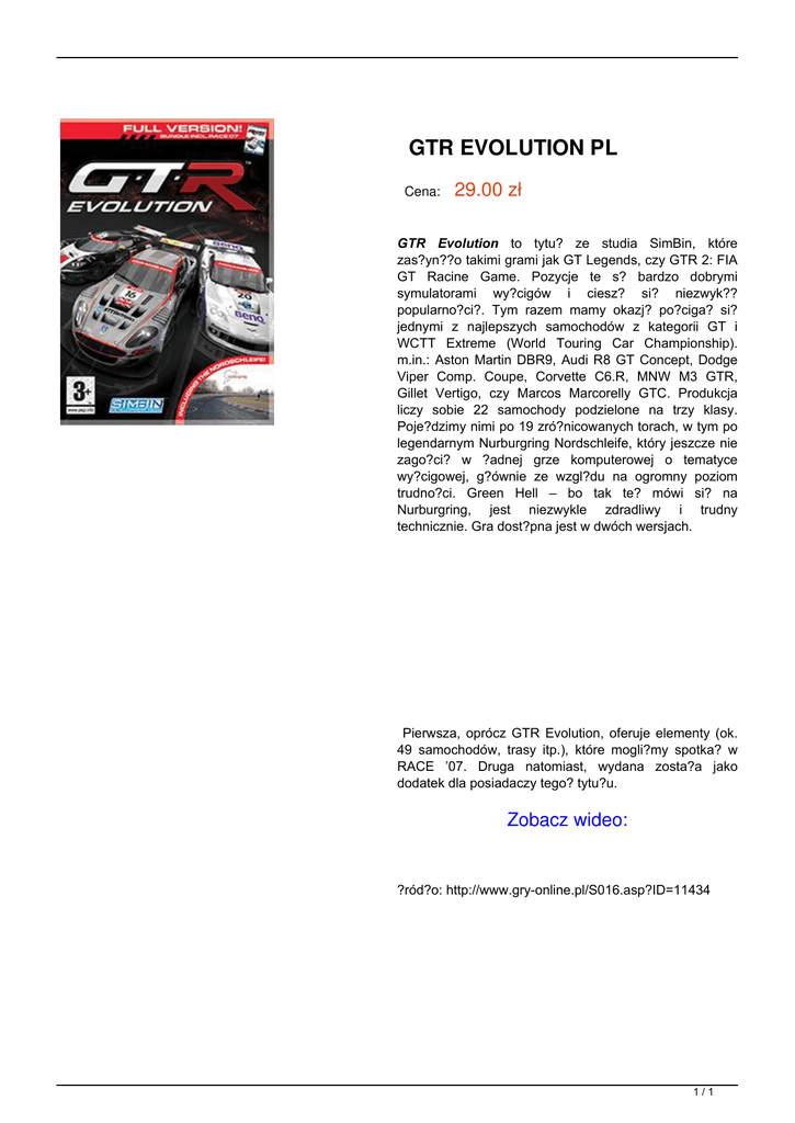 GTR EVOLUTION PL Cena: 29.00 zł GTR Evolution to tytu? ze studia SimBin, które zas?yn??o takimi grami jak GT Legends, czy GTR 2: FIA GT Racine Game. Pozycje te s? bardzo dobrymi symulatorami wy?cigów i ciesz? si? niezwyk?? popularno?ci?. Tym razem mamy okazj? po?ciga? si? jednymi z najlepszych samochodów z kategorii GT i WCTT Extreme (World Touring Car Championship). m.in.: Aston Martin DBR9, Audi R8 GT Concept, Dodge Viper Comp. Coupe, Corvette C6.R, MNW M3 GTR, Gillet Vertigo, czy Marcos Marcorelly GTC. Produkcja liczy sobie 22 samochody podzielone na trzy klasy. Poje?dzimy nimi po 19 zró?nicowanych torach, w tym po legendarnym Nurburgring Nordschleife, który jeszcze nie zago?ci? w ?adnej grze komputerowej o tematyce wy?cigowej, g?ównie ze wzgl?du na ogromny poziom trudno?ci. Green Hell – bo tak te? mówi si? na Nurburgring, jest niezwykle zdradliwy i trudny technicznie. Gra dost?pna jest w dwóch wersjach. Pierwsza, oprócz GTR Evolution, oferuje elementy (ok. 49 samochodów, trasy itp.), które mogli?my spotka? w RACE ’07. Druga natomiast, wydana zosta?a jako dodatek dla posiadaczy tego? tytu?u. Zobacz wideo: ?ród?o: http://www.gry-online.pl/S016.asp?ID=11434 1/1 Powered by TCPDF (www.tcpdf.org)