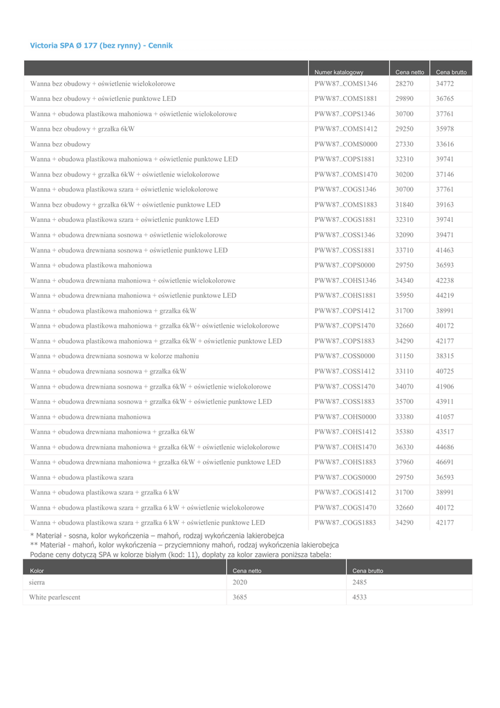 Victoria SPA Ø 177 (bez rynny) - Cennik Numer katalogowy Cena netto Cena brutto Wanna bez obudowy + oświetlenie wielokolorowe PWW87..COMS1346 28270 34772 Wanna bez obudowy + oświetlenie punktowe LED PWW87..COMS1881 29890 36765 Wanna + obudowa plastikowa mahoniowa + oświetlenie wielokolorowe PWW87..COPS1346 30700 37761 Wanna bez obudowy + grzałka 6kW PWW87..COMS1412 29250 35978 Wanna bez obudowy PWW87..COMS0000 27330 33616 Wanna + obudowa plastikowa mahoniowa + oświetlenie punktowe LED PWW87..COPS1881 32310 39741 Wanna bez obudowy + grzałka 6kW + oświetlenie wielokolorowe PWW87..COMS1470 30200 37146 Wanna + obudowa plastikowa szara + oświetlenie wielokolorowe PWW87..COGS1346 30700 37761 Wanna bez obudowy + grzałka 6kW + oświetlenie punktowe LED PWW87..COMS1883 31840 39163 Wanna + obudowa plastikowa szara + oświetlenie punktowe LED PWW87..COGS1881 32310 39741 Wanna + obudowa drewniana sosnowa + oświetlenie wielokolorowe PWW87..COSS1346 32090 39471 Wanna + obudowa drewniana sosnowa + oświetlenie punktowe LED PWW87..COSS1881 33710 41463 Wanna + obudowa plastikowa mahoniowa PWW87..COPS0000 29750 36593 Wanna + obudowa drewniana mahoniowa + oświetlenie wielokolorowe PWW87..COHS1346 34340 42238 Wanna + obudowa drewniana mahoniowa + oświetlenie punktowe LED PWW87..COHS1881 35950 44219 Wanna + obudowa plastikowa mahoniowa + grzałka 6kW PWW87..COPS1412 31700 38991 Wanna + obudowa plastikowa mahoniowa + grzałka 6kW+ oświetlenie wielokolorowe PWW87..COPS1470 32660 40172 Wanna + obudowa plastikowa mahoniowa + grzałka 6kW + oświetlenie punktowe LED PWW87..COPS1883 34290 42177 Wanna + obudowa drewniana sosnowa w kolorze mahoniu PWW87..COSS0000 31150 38315 Wanna + obudowa drewniana sosnowa + grzałka 6kW PWW87..COSS1412 33110 40725 Wanna + obudowa drewniana sosnowa + grzałka 6kW + oświetlenie wielokolorowe PWW87..COSS1470 34070 41906 Wanna + obudowa drewniana sosnowa + grzałka 6kW + oświetlenie punktowe LED PWW87..COSS1883 35700 43911 Wanna + obudowa drewniana mahoniowa PWW87..COHS0000 33380 41057 Wanna + obudowa drewniana mahoniowa + grzałka 6kW PWW87..COHS1412 35380 43517 Wanna + obudowa drewniana mahoniowa + grzałka 6kW + oświetlenie wielokolorowe PWW87..COHS1470 36330 44686 Wanna + obudowa drewniana mahoniowa + grzałka 6kW + oświetlenie punktowe LED PWW87..COHS1883 37960 46691 Wanna + obudowa plastikowa szara PWW87..COGS0000 29750 36593 Wanna + obudowa plastikowa szara + grzałka 6 kW PWW87..COGS1412 31700 38991 Wanna + obudowa plastikowa szara + grzałka 6 kW + oświetlenie wielokolorowe PWW87..COGS1470 32660 40172 Wanna + obudowa plastikowa szara + grzałka 6 kW + oświetlenie punktowe LED PWW87..COGS1883 34290 42177 * Materiał - sosna, kolor wykończenia – mahoń, rodzaj wykończenia lakierobejca ** Materiał - mahoń, kolor wykończenia – przyciemniony mahoń, rodzaj wykończenia lakierobejca Podane ceny dotyczą SPA w kolorze białym (kod: 11), dopłaty za kolor zawiera poniższa tabela: Kolor Cena netto Cena brutto sierra 2020 2485 White pearlescent 3685 4533