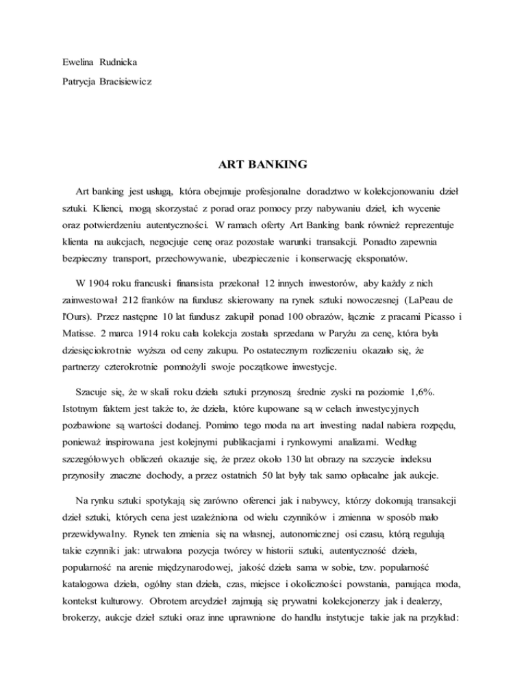Ewelina Rudnicka Patrycja Bracisiewicz ART BANKING Art banking jest usługą, która obejmuje profesjonalne doradztwo w kolekcjonowaniu dzieł sztuki. Klienci, mogą skorzystać z porad oraz pomocy przy nabywaniu dzieł, ich wycenie oraz potwierdzeniu autentyczności. W ramach oferty Art Banking bank również reprezentuje klienta na aukcjach, negocjuje cenę oraz pozostałe warunki transakcji. Ponadto zapewnia bezpieczny transport, przechowywanie, ubezpieczenie i konserwację eksponatów. W 1904 roku francuski finansista przekonał 12 innych inwestorów, aby każdy z nich zainwestował 212 franków na fundusz skierowany na rynek sztuki nowoczesnej (LaPeau de l'Ours). Przez następne 10 lat fundusz zakupił ponad 100 obrazów, łącznie z pracami Picasso i Matisse. 2 marca 1914 roku cała kolekcja została sprzedana w Paryżu za cenę, która była dziesięciokrotnie wyższa od ceny zakupu. Po ostatecznym rozliczeniu okazało się, że partnerzy czterokrotnie pomnożyli swoje początkowe inwestycje. Szacuje się, że w skali roku dzieła sztuki przynoszą średnie zyski na poziomie 1,6%. Istotnym faktem jest także to, że dzieła, które kupowane są w celach inwestycyjnych pozbawione są wartości dodanej. Pomimo tego moda na art investing nadal nabiera rozpędu, ponieważ inspirowana jest kolejnymi publikacjami i rynkowymi analizami. Według szczegółowych obliczeń okazuje się, że przez około 130 lat obrazy na szczycie indeksu przynosiły znaczne dochody, a przez ostatnich 50 lat były tak samo opłacalne jak aukcje. Na rynku sztuki spotykają się zarówno oferenci jak i nabywcy, którzy dokonują transakcji dzieł sztuki, których cena jest uzależniona od wielu czynników i zmienna w sposób mało przewidywalny. Rynek ten zmienia się na własnej, autonomicznej osi czasu, którą regulują takie czynniki jak: utrwalona pozycja twórcy w historii sztuki, autentyczność dzieła, popularność na arenie międzynarodowej, jakość dzieła sama w sobie, tzw. popularność katalogowa dzieła, ogólny stan dzieła, czas, miejsce i okoliczności powstania, panująca moda, kontekst kulturowy. Obrotem arcydzieł zajmują się prywatni kolekcjonerzy jak i dealerzy, brokerzy, aukcje dzieł sztuki oraz inne uprawnione do handlu instytucje takie jak na przykład: muzea i fundacje. Ważną role odgrywa tu przede wszystkim dobór odpowiedniego środowiska, w którym zamierza się ulokować swoje pieniądze. Art Banking zalicza się do alternatywnej formy inwestowania wobec tradycyjnych metod pomnażania kapitału(fundusze inwestycyjne, inwestowanie w nieruchomości). Zysk zależy w dużej mierze od ceny rynkowej dzieła, momentu sprzedaży tzw. Timing oraz od kosztów manipulacyjnych, które czasem osiągają wysokość 20% transakcji (ochrona, konserwacja, odnowienie, transport, wycena, ubezpieczenie, weryfikacja autentyczności). Optymistyczna wersja przewiduje, że sztuka jest dlatego opłacalną inwestycją, ponieważ ceny nie są uzależnione od lokalnej gospodarki, roszad cenowych na giełdach, a poza tym dzieła sztuki są ze swej natury unikalne i trwałe. Znawcy rynku sztuki jednoznacznie stwierdzają , że polska sztuka jest niedoszacowana i przewidują znaczny wzrost jej wartości. W dobie kryzysu jest ona również jedną z bezpieczniejszych lokat. Oferta Art Banking skierowana jest głównie do klientów zamożnych, zdaniem specjalistów na rozpoczęcie budowy dobrej kolekcji wystarczy 100 tys. zł. W ramach usługi Art Bankingu polegającej na współpracy banku z domem aukcyjnym lub galerią sztuki, klientowi wyznaczony zostaje doradca – art advisor, gdyż inwestycje tego typu wymagają wiedzy specjalisty oraz doświadczenia. Za narodziny Art Bankingu uznaje się lata 80. XX wieku, kiedy to nowojorski Citibank wprowadził nowoczesną jak na ówczesne czasy ofertę, motywowaną chęcią wyróżnienia elitarnych klientów. Najpotężniejszą dziś instytucją, która zajmuje się obsługą inwestycji w sztukę - również w Polsce - jest UBC - szwajcarski lider wśród banków inwestycyjnych. Poza tym, podobne usługi oferują m.in.: Citibank, Deutsche Bank, ABN Amro, noble Bank. Posiadanie w swojej ofercie usługi Art Bankingu kreuje i wzmacnia wizerunek instytucji, banku. Aby osiągać zysk na zadowalającym poziomie warto przestrzegać kilku określonych zasad: 1)odnaleźć artystę, którego działa nie są znane w szerszym kręgu lecz wzbudzają zainteresowanie, 2)gdy brak nam wiedzy w obszarze sztuki, lepiej zainteresować się zakupem fotografii, litografii, mebli lub starodruków. Wartość tych aktywów znaczniej łatwej jest oszacować i jest ona stabilniejsza niż w przypadku obrazów, 3)kupować tylko, to co naprawdę nam się podoba. Oferta Stilnovisti - Wine & Art banking Firma doradcza, która rozpoczęła działalność w 2007 roku specjalizujące się w Wine & Art Bankingu. Jako jedna z pierwszych firm na polskim rynku zaproponowała usługi dot. inwestycji alternatywnych. Oferta kierowana jest do Klientów otwartych na indywidualne rozwiązania w inwestycjach, charakteryzujące się zróżnicowanym poziomem ryzyka, oraz zainteresowanych inwestowaniem w dłuższej perspektywie. Proponowana oferta opiera się gównie na inwestycji w awangardowych artystów jako najbardziej niedowartościowanym segmencie rynku. Strategię inwestycyjną firma opiera na traktowaniu AB jak stricte usługi finansowej oraz stosowaniu narzędzi analizy fundamentalnej. Obszar zainteresowań Stilnovisti to przede wszystkim sztuka współczesna oraz awangardowa. Instytucja ta umożliwia rozpoczęcie inwestowania od relatywnie niewielkich kwot 2-3 tys. zł rocznie. Jedną z proponowanych usług jest ‘Zakup sztuki z funduszem stypendialnym’. Polega na zakupie oraz późniejszym dofinansowaniu działań w celu promocji nazwiska artysty. Duża zaleta jest niewielka kwota, gdyż najważniejsza jest konsekwencja w realizacji działań prze planowany okres. Kolekcja Prywatna/instytucjonalna