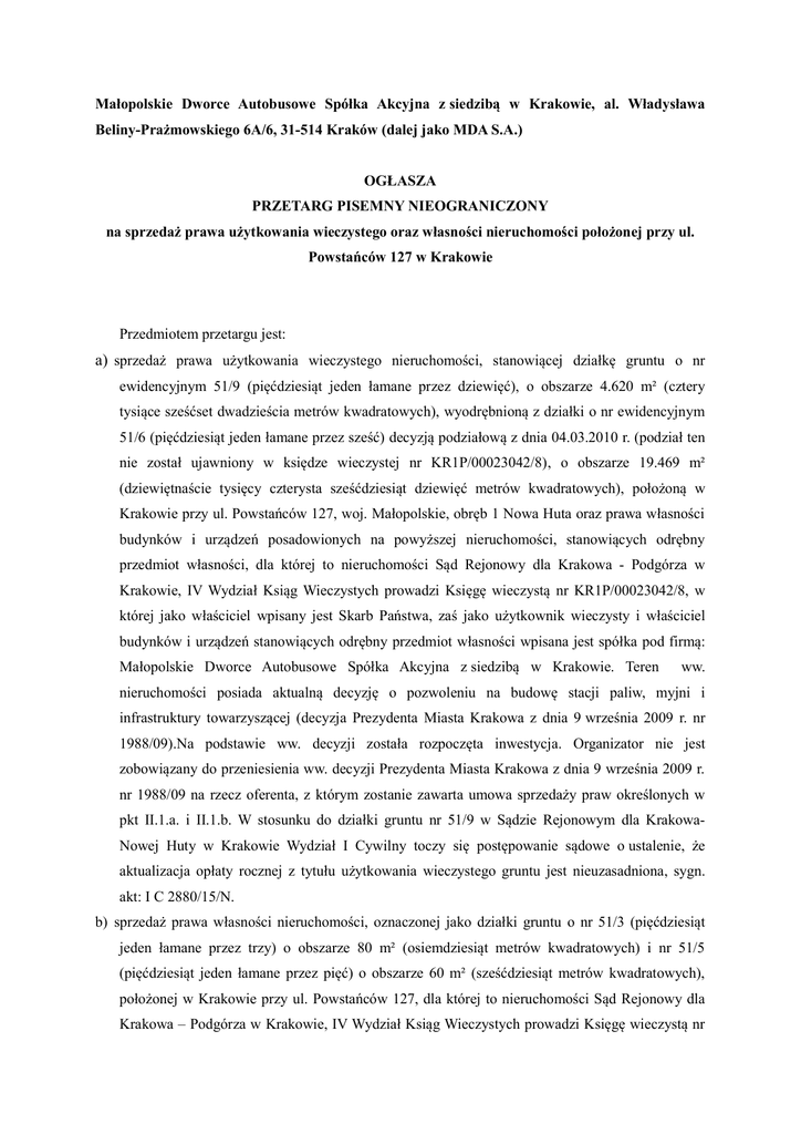 Małopolskie Dworce Autobusowe Spółka Akcyjna z siedzibą w Krakowie, al. Władysława Beliny-Prażmowskiego 6A/6, 31-514 Kraków (dalej jako MDA S.A.) OGŁASZA PRZETARG PISEMNY NIEOGRANICZONY na sprzedaż prawa użytkowania wieczystego oraz własności nieruchomości położonej przy ul. Powstańców 127 w Krakowie Przedmiotem przetargu jest: a) sprzedaż prawa użytkowania wieczystego nieruchomości, stanowiącej działkę gruntu o nr ewidencyjnym 51/9 (pięćdziesiąt jeden łamane przez dziewięć), o obszarze 4.620 m² (cztery tysiące sześćset dwadzieścia metrów kwadratowych), wyodrębnioną z działki o nr ewidencyjnym 51/6 (pięćdziesiąt jeden łamane przez sześć) decyzją podziałową z dnia 04.03.2010 r. (podział ten nie został ujawniony w księdze wieczystej nr KR1P/00023042/8), o obszarze 19.469 m² (dziewiętnaście tysięcy czterysta sześćdziesiąt dziewięć metrów kwadratowych), położoną w Krakowie przy ul. Powstańców 127, woj. Małopolskie, obręb 1 Nowa Huta oraz prawa własności budynków i urządzeń posadowionych na powyższej nieruchomości, stanowiących odrębny przedmiot własności, dla której to nieruchomości Sąd Rejonowy dla Krakowa - Podgórza w Krakowie, IV Wydział Ksiąg Wieczystych prowadzi Księgę wieczystą nr KR1P/00023042/8, w której jako właściciel wpisany jest Skarb Państwa, zaś jako użytkownik wieczysty i właściciel budynków i urządzeń stanowiących odrębny przedmiot własności wpisana jest spółka pod firmą: Małopolskie Dworce Autobusowe Spółka Akcyjna z siedzibą w Krakowie. Teren ww. nieruchomości posiada aktualną decyzję o pozwoleniu na budowę stacji paliw, myjni i infrastruktury towarzyszącej (decyzja Prezydenta Miasta Krakowa z dnia 9 września 2009 r. nr 1988/09).Na podstawie ww. decyzji została rozpoczęta inwestycja. Organizator nie jest zobowiązany do przeniesienia ww. decyzji Prezydenta Miasta Krakowa z dnia 9 września 2009 r. nr 1988/09 na rzecz oferenta, z którym zostanie zawarta umowa sprzedaży praw określonych w pkt II.1.a. i II.1.b. W stosunku do działki gruntu nr 51/9 w Sądzie Rejonowym dla KrakowaNowej Huty w Krakowie Wydział I Cywilny toczy się postępowanie sądowe o ustalenie, że aktualizacja opłaty rocznej z tytułu użytkowania wieczystego gruntu jest nieuzasadniona, sygn. akt: I C 2880/15/N. b) sprzedaż prawa własności nieruchomości, oznaczonej jako działki gruntu o nr 51/3 (pięćdziesiąt jeden łamane przez trzy) o obszarze 80 m² (osiemdziesiąt metrów kwadratowych) i nr 51/5 (pięćdziesiąt jeden łamane przez pięć) o obszarze 60 m² (sześćdziesiąt metrów kwadratowych), położonej w Krakowie przy ul. Powstańców 127, dla której to nieruchomości Sąd Rejonowy dla Krakowa – Podgórza w Krakowie, IV Wydział Ksiąg Wieczystych prowadzi Księgę wieczystą nr KR1P/00321218/2 w której, jako właściciel nieruchomości wpisana jest spółka pod firmą: Małopolskie Dworce Autobusowe S.A. c) zobowiązanie się oferenta do ustanowienia na prawie użytkowania wieczystego nieruchomości, opisanej w pkt II.1. a. i nieruchomości opisanej w pkt II.1.b. na rzecz: i. każdoczesnych użytkowników wieczystych nieruchomości, stanowiących działki o nr 51/10, nr 51/11, nr 51/12 i nr 51/8, wyodrębnione z działki o nr ewidencyjnym 51/6 decyzją podziałową z dnia 04.03.2010 r. (podział ten nie został ujawniony w księdze wieczystej nr KR1P/00023042/8), położonych w Krakowie przy ul. Powstańców 127, objętych KW nr KR1P/00023042/8 oraz ii. każdoczesnych właścicieli budynków stanowiących odrębną nieruchomość objętych księgą wieczystą nr KR1P/00023042/8, - służebności gruntowej korzystania w oznaczonym zakresie z nieruchomości, polegającej na nieodpłatnym udostępnieniu nieruchomości opisanych w pkt II.1.a i II.1.b) w zakresie niezbędnym do realizacji na działkach o nr 51/10, nr 51/11, nr 51/12 i nr 51/8 celów infrastrukturalnych oraz - służebności gruntowej korzystania z trwałego urządzenia – przepompowni i przyłącza kanałowego, polegającej na nieodpłatnym prawie wejścia na nieruchomości, opisane w pkt. II.1.a. i II.1.b. i korzystania z nich w zakresie niezbędnym do wybudowania na działce nr 51/9 przepompowni ścieków bytowych, korzystania z przepompowni i przyłącza kanałowego oraz prawie przechodu przez działkę nr 51/9, umożliwiającego dojście do przepompowni. W tym celu oferent złoży w akcie notarialnym, obejmującym umowę sprzedaży praw, o których mowa w pkt II.1.a. i II.1.b., oświadczenie o ustanowieniu służebności gruntowej, o której mowa w pkt II.1.c. d) Celem przetargu jest uzyskanie jak najwyższej ceny z tytułu sprzedaży praw, o których mowa w pkt II.1.a. i II.1.b. regulaminu. e) Przedmiotem przetargu jest sprzedaż praw, o których mowa w pkt II.1.a. i II.1.b. regulaminu, łącznie. Regulamin Przetargu, czas i miejsce przetargu, cena wywoławcza i pozostałe warunki przetargu są dostępne na stronie www.mda.malopolska.pl oraz w siedzibie Małopolskich Dworców Autobusowych S.A. przy al. Władysława Beliny-Prażmowskiego 6A/6 31-514 Kraków.