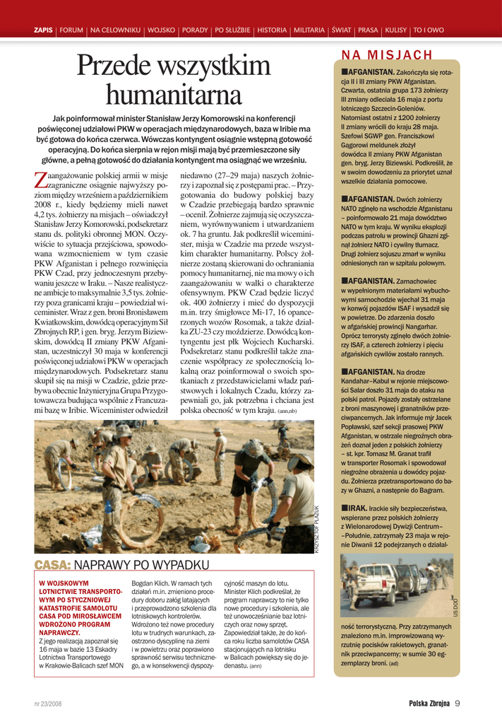 | | | | || | | || | | || || | ZAPIS FORUM NA CELOWNIKU WOJSKO PORADY KULISY PORADY PO SŁUŻBIE PO SŁUŻBIE HISTORIAHISTORIA MILITARIAMILITARIA ŚWIAT PRASA PRASA KULISY ŚWIAT TO I OWO Przede wszystkim humanitarna NA MISJACH AFGANISTAN. Zakończyła się rota- Jak poinformował minister Stanisław Jerzy Komorowski na konferencji poświęconej udziałowi PKW w operacjach międzynarodowych, baza w Iribie ma być gotowa do końca czerwca. Wówczas kontyngent osiągnie wstępną gotowość operacyjną. Do końca sierpnia w rejon misji mają być przemieszczone siły główne, a pełną gotowość do działania kontyngent ma osiągnąć we wrześniu. Z niedawno (27–29 maja) naszych żołnierzy i zapoznał się z postępami prac. – Przygotowania do budowy polskiej bazy w Czadzie przebiegają bardzo sprawnie – ocenił. Żołnierze zajmują się oczyszczaniem, wyrównywaniem i utwardzaniem ok. 7 ha gruntu. Jak podkreślił wiceminister, misja w Czadzie ma przede wszystkim charakter humanitarny. Polscy żołnierze zostaną skierowani do ochraniania pomocy humanitarnej, nie ma mowy o ich zaangażowaniu w walki o charakterze ofensywnym. PKW Czad będzie liczyć ok. 400 żołnierzy i mieć do dyspozycji m.in. trzy śmigłowce Mi-17, 16 opancerzonych wozów Rosomak, a także działka ZU-23 czy moździerze. Dowódcą kontyngentu jest płk Wojciech Kucharski. Podsekretarz stanu podkreślił także znaczenie współpracy ze społecznością lokalną oraz poinformował o swoich spotkaniach z przedstawicielami władz państwowych i lokalnych Czadu, którzy zapewniali go, jak potrzebna i chciana jest polska obecność w tym kraju. (ann,nb) KRZYSZTOF PLAŻUK aangażowanie polskiej armii w misje zagraniczne osiągnie najwyższy poziom między wrześniem a październikiem 2008 r., kiedy będziemy mieli nawet 4,2 tys. żołnierzy na misjach – oświadczył Stanisław Jerzy Komorowski, podsekretarz stanu ds. polityki obronnej MON. Oczywiście to sytuacja przejściowa, spowodowana wzmocnieniem w tym czasie PKW Afganistan i pełnego rozwinięcia PKW Czad, przy jednoczesnym przebywaniu jeszcze w Iraku. – Nasze realistyczne ambicje to maksymalnie 3,5 tys. żołnierzy poza granicami kraju – powiedział wiceminister. Wraz z gen. broni Bronisławem Kwiatkowskim, dowódcą operacyjnym Sił Zbrojnych RP, i gen. bryg. Jerzym Biziewskim, dowódcą II zmiany PKW Afganistan, uczestniczył 30 maja w konferencji poświęconej udziałowi PKW w operacjach międzynarodowych. Podsekretarz stanu skupił się na misji w Czadzie, gdzie przebywa obecnie Inżynieryjna Grupa Przygotowawcza budująca wspólnie z Francuzami bazę w Iribie. Wiceminister odwiedził cja II i III zmiany PKW Afganistan. Czwarta, ostatnia grupa 173 żołnierzy III zmiany odleciała 16 maja z portu lotniczego Szczecin-Goleniów. Natomiast ostatni z 1200 żołnierzy II zmiany wrócili do kraju 28 maja. Szefowi SGWP gen. Franciszkowi Gągorowi meldunek złożył dowódca II zmiany PKW Afganistan gen. bryg. Jerzy Biziewski. Podkreślił, że w swoim dowodzeniu za priorytet uznał wszelkie działania pomocowe. AFGANISTAN. Dwóch żołnierzy NATO zginęło na wschodzie Afganistanu – poinformowało 21 maja dowództwo NATO w tym kraju. W wyniku eksplozji podczas patrolu w prowincji Ghazni zginął żołnierz NATO i cywilny tłumacz. Drugi żołnierz sojuszu zmarł w wyniku odniesionych ran w szpitalu polowym. AFGANISTAN. Zamachowiec w wypełnionym materiałami wybuchowymi samochodzie wjechał 31 maja w konwój pojazdów ISAF i wysadził się w powietrze. Do zdarzenia doszło w afgańskiej prowincji Nangarhar. Oprócz terrorysty zginęło dwóch żołnierzy ISAF, a czterech żołnierzy i pięciu afgańskich cywilów zostało rannych. AFGANISTAN. Na drodze Kandahar–Kabul w rejonie miejscowości Salar doszło 31 maja do ataku na polski patrol. Pojazdy zostały ostrzelane z broni maszynowej i granatników przeciwpancernych. Jak informuje mjr Jacek Popławski, szef sekcji prasowej PKW Afganistan, w ostrzale niegroźnych obrażeń doznał jeden z polskich żołnierzy – st. kpr. Tomasz M. Granat trafił w transporter Rosomak i spowodował niegroźne obrażenia u dowódcy pojazdu. Żołnierza przetransportowano do bazy w Ghazni, a następnie do Bagram. IRAK. Irackie siły bezpieczeństwa, wspierane przez polskich żołnierzy z Wielonarodowej Dywizji Centrum– –Południe, zatrzymały 23 maja w rejonie Diwanii 12 podejrzanych o działal- W WOJSKOWYM LOTNICTWIE TRANSPORTOWYM PO STYCZNIOWEJ KATASTROFIE SAMOLOTU CASA POD MIROSŁAWCEM WDROŻONO PROGRAM NAPRAWCZY. Z jego realizacją zapoznał się 16 maja w bazie 13 Eskadry Lotnictwa Transportowego w Krakowie-Balicach szef MON nr 23/2008 Bogdan Klich. W ramach tych działań m.in. zmieniono procedury doboru załóg latających i przeprowadzono szkolenia dla lotniskowych kontrolerów. Wdrożono też nowe procedury lotu w trudnych warunkach, zaostrzono dyscyplinę na ziemi i w powietrzu oraz poprawiono sprawność serwisu technicznego, a w konsekwencji dyspozy- cyjność maszyn do lotu. Minister Klich podkreślał, że program naprawczy to nie tylko nowe procedury i szkolenia, ale też unowocześnianie baz lotniczych oraz nowy sprzęt. Zapowiedział także, że do końca roku liczba samolotów CASA stacjonujących na lotnisku w Balicach powiększy się do jedenastu. (ann) US DOD CASA: NAPRAWY PO WYPADKU ność terrorystyczną. Przy zatrzymanych znaleziono m.in. improwizowaną wyrzutnię pocisków rakietowych, granatnik przeciwpancerny; w sumie 30 egzemplarzy broni. (ad) Polska Zbrojna 9
