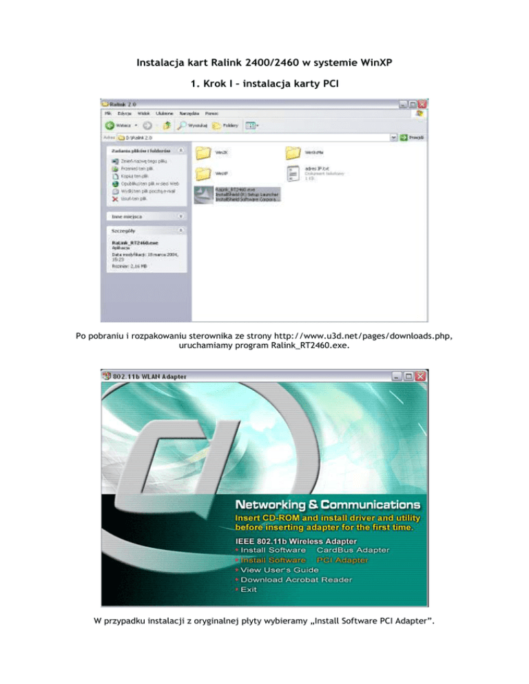Instalacja kart Ralink 2400/2460 w systemie WinXP 1. Krok I – instalacja karty PCI Po pobraniu i rozpakowaniu sterownika ze strony http://www.u3d.net/pages/downloads.php, uruchamiamy program Ralink_RT2460.exe. W przypadku instalacji z oryginalnej płyty wybieramy „Install Software PCI Adapter”. Kontynuujemy instalację poprzez wybranie „Next”. Po zakończonym procesie instalacji wybieramy „Finish”. Karta zostanie zidentyfikowana przez system WinXP jako RT2400 Wireless LAN Card. System WinXP automatycznie uruchomi kreatora znajdowania nowego sprzętu. Wybieramy „Nie, nie tym razem” a następnie „Dalej”. Zaznaczamy „Zainstaluj oprogramowanie automatycznie” i „Dalej”. W przypadku komunikatu jak powyżej wybieramy „Mimo to kontynuuj”. Kończymy instalację „Zakończ”. Po zainstalowaniu oprogramowania, w prawej dolnej części ekranu pojawi się ikona R. Klikamy w ikonę aby uruchomić oprogramowanie. Na ekranie pojawi się okno „Site Survey” gdzie możemy wybrać właściwy nadajnik. Zaznaczamy antenę z nazwą np. WWW.U3D.NET.XX_YYY i dodajemy profil „ADD PROFILE”. Po wybraniu „ADD PROFILE” otworzy się okno w którym ustawiamy „Transmit Rate” na 1Mbps. Zatwierdzamy wybór „OK”. Po dodaniu profilu znajdujemy się w zakładce „Profile”. Zaznaczamy „PROF1” i aktywujemy profil poprzez „ACTIVATE”, a następnie OK. 2. Krok II – konfiguracja parametrów IP Po poprawnej instalacji karty PCI konfigurujemy parametry IP. Klikamy na ikonę monitora znajdującą się w dolnym prawym rogu ekranu (jeżeli ikona nie znajduje się w tym miejscu to wybieramy START/PANEL STEROWANIA/POŁĄCZENIA SIECIOWE/POŁĄCZENIE SIECI BEZPRZEWODOWEJ). W oknie „Stan połączenia” wybieramy „Właściwości”. Zaznaczamy „Protokół internetowy (TCP/IP)” i wybieramy „Właściwości”. W nowym oknie wprowadzamy IP, maskę, bramę oraz adresy serwerów DNS przekazane przez U3D. Zatwierdzamy wybór „OK” Po wprowadzeniu parametrów IP komputer jest skonfigurowany do korzystania z usługi U3D Internet.