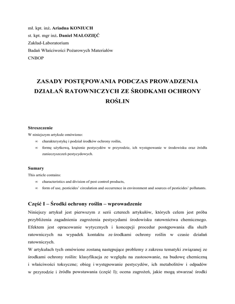 mł. kpt. inŜ. Ariadna KONIUCH st. kpt. mgr inŜ. Daniel MAŁOZIĘĆ Zakład-Laboratorium Badań Właściwości PoŜarowych Materiałów CNBOP ZASADY POSTĘPOWANIA PODCZAS PROWADZENIA DZIAŁAŃ RATOWNICZYCH ZE ŚRODKAMI OCHRONY ROŚLIN Streszczenie W niniejszym artykule omówiono: • charakterystykę i podział środków ochrony roślin, • formę uŜytkową, krąŜenie pestycydów w przyrodzie, ich występowanie w środowisku oraz źródła zanieczyszczeń pestycydowych. Sumary This article contains: • characteristics and division of pest control products, • form of use, pesticides’ circulation and occurrence in environment and sources of pesticides’ pollutants. Część I – Środki ochrony roślin – wprowadzenie Niniejszy artykuł jest pierwszym z serii czterech artykułów, których celem jest próba przybliŜenia zagadnienia zagroŜenia pestycydami środowisku ratownictwa chemicznego. Efektem jest opracowanie wytycznych i koncepcji procedur postępowania dla słuŜb ratowniczych na wypadek kontaktu ze środkami ochrony roślin w czasie działań ratowniczych. W artykułach tych omówione zostaną następujące problemy z zakresu tematyki związanej ze środkami ochrony roślin: klasyfikacja ze względu na zastosowanie, na budowę chemiczną i właściwości toksyczne; obieg i występowanie pestycydów, ich metabolitów i odpadów w przyrodzie i źródła powstawania (część I); ocena zagroŜeń, jakie mogą stwarzać środki ochrony roślin dla organizmów Ŝywych i dla środowiska naturalnego oraz zasady postępowania z odpadami pestycydowymi (część II), akty prawne wprowadzające uregulowania w zakresie środków ochrony roślin (część III) oraz autorską analizę wypadków i awarii, w których czynnikiem szkodliwym są środki ochrony roślin; potencjalne skutki ich szkodliwego oddziaływania na środowisko; środki ochrony indywidualnej, jakie powinny być zachowane przy kontakcie ze środkami ochrony roślin (część IV). Niniejsza praca została zainspirowana publikacją prof. dr hab. Przemysława Masztalerza – „Ekologiczne kłamstwa ekowojowników. Rzecz o szkodliwości kłamliwej propagandy ekologicznej”. Jej autor, będący zwolennikiem racjonalnego stosowania środków ochrony roślin, polemizuje z poglądami „ekowojowników” walczących o całkowite wycofanie z uŜytku takich środków. Aby przyznać rację którejś ze stron, postawione zostało pytanie: czy faktycznie środki ochrony roślin są tak szkodliwe, jak twierdzą „zieloni”? A jeŜeli tak, to w jaki sposób naleŜy neutralizować te substancje chemiczne i jak prowadzić działania ratownicze? NaleŜy teŜ zastanowić się, czy straŜak-ratownik ma świadomość zagroŜeń, jakie mogą nań czyhać w wyniku kontaktu bądź skaŜenia środkami ochrony roślin. Powagę i wielkość zagroŜenia potęguje duŜa trwałość pestycydów. Pestycydy wycofane ze stosowania (np. DDT (w Polsce znany jako Azotox), czy PCB) nadal występują w mleku karmiących matek w ilościach przekraczających dopuszczalne normy dla mleka spoŜywczego, jak równieŜ niesione wiatrem pojawiają się na kontynentach, gdzie nie były stosowane. Trudność i złoŜoność problemów związanych z tą tematyką jest przyczyną braku własnych wytycznych czy procedur postępowania ratowniczego Państwowej StraŜy PoŜarnej. Czy moŜliwe jest opracowanie odrębnych procedur, czy teŜ wystarczą juŜ istniejące procedury z zakresu ratownictwa chemicznego? WyŜej omówiona seria artykułów jest próbą znalezienia koncepcji prowadzenia działań ratowniczych ze środkami ochrony roślin i powinna przyczynić się do podwyŜszenia kwalifikacji ratowników oraz do wypracowania nowych procedur postępowania ratowniczego. Charakterystyka środków ochrony roślin Podstawową, a zarazem pierwotną potrzebą człowieka jest zaspokojenie głodu, stąd zdobywanie poŜywienia decydowało o Ŝyciu nie tylko jednostek, ale i całych społeczeństw. W miarę rozwoju cywilizacji produkcja poŜywienia zastąpiła zbieractwo, polowanie czy prymitywne uprawy. W czasach nam współczesnych niemal wszystkie zdobycze nauki i techniki zostały wprzęgnięte do produkcji Ŝywności. Wykorzystanie genetyki w hodowli zwierząt i roślin oraz stymulacja wzrostu środkami chemicznymi przy jednoczesnej mechanizacji pozwalają uzyskać załoŜone cele; produkuje się Ŝywność o nowych właściwościach i w większych ilościach. Ingerencja w środowisko naturalne niesie jednak skutki trudne do przewidzenia; moŜe zlikwidować głód kosztem nieodwracalnego zniszczenia flory i fauny. Pojęcie środków ochrony roślin obejmuje „mieszaniny i substancje przeznaczone do ochrony roślin uprawnych przed organizmami szkodliwymi, niszczenie niepoŜądanych roślin, regulowanie wzrostu, rozwoju roślin uprawnych oraz poprawy właściwości lub skuteczności substancji lub mieszanin substancji przeznaczonych do wyŜej wskazanych celów.” Pestycydy to bardzo liczna i zróŜnicowana grupa związków chemicznych. Pojęcie pestycyd pochodzi z języka łacińskiego od słów: pestis - morowe powietrze, zaraza oraz caedo – niszczę, zabijam, natomiast pest w języku angielskim oznacza - plaga, szkodnik. MoŜna, więc pokusić się o dosłowne tłumaczenie tego terminu jako: środek, substancja do „zwalczania plag”. Jako plagę rozumie się tu organizmy szkodliwe z gospodarczego i zdrowotnego punktu widzenia. Przy tego typu rozwaŜaniu naleŜy wykluczyć ekologiczne spojrzenie na szkodniki, bowiem z punktu widzenia ekologów, w przyrodzie nie istnieją organizmy szkodliwe. Istnienie kaŜdego elementu ekosystemu, nawet wyrządzającego znaczne szkody ekonomiczne, pozwala na zachowanie równowagi w przyrodzie. „Pestycydy wprowadzono do powszechnego uŜycia po to, by niszczyć lub unieszkodliwiać organizmy niebezpieczne dla człowieka i wytwarzanych lub uŜywanych przez niego produktów.” Zwalczanie ich (w szerokim rozumieniu) jest cele