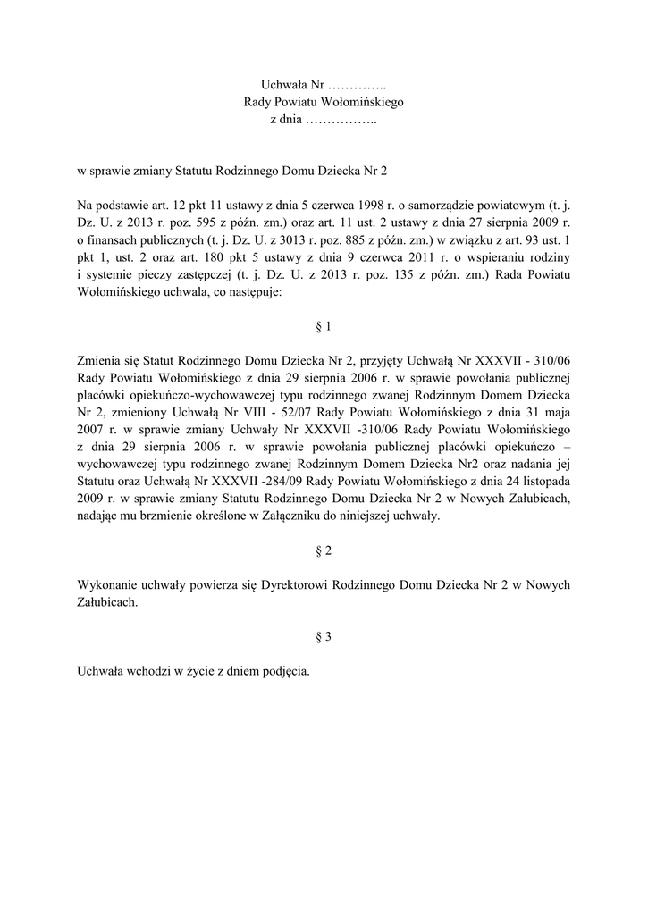 Uchwała Nr ………….. Rady Powiatu Wołomińskiego z dnia …………….. w sprawie zmiany Statutu Rodzinnego Domu Dziecka Nr 2 Na podstawie art. 12 pkt 11 ustawy z dnia 5 czerwca 1998 r. o samorządzie powiatowym (t. j. Dz. U. z 2013 r. poz. 595 z późn. zm.) oraz art. 11 ust. 2 ustawy z dnia 27 sierpnia 2009 r. o finansach publicznych (t. j. Dz. U. z 3013 r. poz. 885 z późn. zm.) w związku z art. 93 ust. 1 pkt 1, ust. 2 oraz art. 180 pkt 5 ustawy z dnia 9 czerwca 2011 r. o wspieraniu rodziny i systemie pieczy zastępczej (t. j. Dz. U. z 2013 r. poz. 135 z późn. zm.) Rada Powiatu Wołomińskiego uchwala, co następuje: §1 Zmienia się Statut Rodzinnego Domu Dziecka Nr 2, przyjęty Uchwałą Nr XXXVII - 310/06 Rady Powiatu Wołomińskiego z dnia 29 sierpnia 2006 r. w sprawie powołania publicznej placówki opiekuńczo-wychowawczej typu rodzinnego zwanej Rodzinnym Domem Dziecka Nr 2, zmieniony Uchwałą Nr VIII - 52/07 Rady Powiatu Wołomińskiego z dnia 31 maja 2007 r. w sprawie zmiany Uchwały Nr XXXVII -310/06 Rady Powiatu Wołomińskiego z dnia 29 sierpnia 2006 r. w sprawie powołania publicznej placówki opiekuńczo – wychowawczej typu rodzinnego zwanej Rodzinnym Domem Dziecka Nr2 oraz nadania jej Statutu oraz Uchwałą Nr XXXVII -284/09 Rady Powiatu Wołomińskiego z dnia 24 listopada 2009 r. w sprawie zmiany Statutu Rodzinnego Domu Dziecka Nr 2 w Nowych Załubicach, nadając mu brzmienie określone w Załączniku do niniejszej uchwały. §2 Wykonanie uchwały powierza się Dyrektorowi Rodzinnego Domu Dziecka Nr 2 w Nowych Załubicach. §3 Uchwała wchodzi w życie z dniem podjęcia. Uzasadnienie Zmiana Statutu w Rodzinnym Domu Dziecka Nr 2 w Nowych Załubicach została podyktowana wejściem w życie w dniu 01.01.2012 r. ustawy o wspieraniu rodziny i systemie pieczy zastępczej oraz jej kolejnymi zmianami, a także Rozporządzeniem Ministra Pracy Polityki Społecznej z dnia 22 grudnia 2011 roku w sprawie instytucjonalnej pieczy zastępczej. Do 31.12.2011r. kwestie związane z opieką nad rodziną i dzieckiem zawarte były w rozdziale IV ustawy o pomocy społecznej. Od 1.01.2012r. cały rozdział został uchylony z ustawy o pomocy społecznej i weszła w życie nowa ustawa o wspieraniu rodziny i systemie pieczy zastępczej, która reguluje wszystkie zagadnienia związane z funkcjonowaniem m.in. placówek opiekuńczo-wychowawczych. Nowe statuty są bardziej przejrzyste, spójne w treści, zawierają niezbędne zapisy jakie winny znaleźć się w statucie jednostki. Warto zaznaczyć, że ustawa była trzykrotnie nowelizowana – 15.12.2011r., 24.05.2012r., 25.07.2014r. Np. w ostatniej nowelizacji dodano art.38b, który zobowiązuje zarząd powiatu do sprawowania kontroli nad placówkami opiekuńczo-wychowawczymi, w pierwotnej ustawie nie było takiej delegacji, mowa była jedynie o nadzorze wojewody nad placówkami opiekuńczo-wychowawczymi (art.186). STATUT RODZINNEGO DOMU DZIECKA NR 2 W NOWYCH ZAŁUBICACH Rozdział I Postanowienia ogólne § 1. Rodzinny Dom Dziecka Nr 2 w Nowych Załubicach działa na podstawie obowiązującego prawa, w szczególności w oparciu o przepisy: 1) ustawy z dnia 9 czerwca 2011 r. o wspieraniu rodziny i systemie pieczy zastępczej (t. j. Dz. U. z 2013 r. poz.135 z późn. zm.); 2) rozporządzenia Ministra Pracy i Polityki Społecznej z dnia 22 grudnia 2011 r. w sprawie instytucjonalnej pieczy zastępczej (Dz. U. Nr 292, poz. 1720); 3) ustawy z dnia 5 czerwca 1998 r. o samorządzie powiatowym (t. j. Dz. U. z 2013 r. poz. 595 z późn. zm.); 4) ustawy z dnia 27 sierpnia 2009 r. o finansach publicznych (t. j. Dz. U. z 2013 r. poz. 885 z późń.zm.); 5) Uchwały Nr XXXVII-310/06 Rady Powiatu Wołomińskiego z dnia 29 sierpnia 2006 r. w sprawie powołania publicznej placówki opiekuńczo-wychowawczej typu rodzinnego zwanej Rodzinnym Domem Dziecka Nr 2. 1. 2. 3. 4. 5. 6. 7. § 2. Rodzinny Dom Dziecka Nr 2 w Nowych Załubicach, zwany dalej Rodzinnym Domem Dziecka, jest jednostką organizacyjną Powiatu Wołomińskiego, realizującą zadania powiatu w zakresie instytucjonalnej pieczy zastępczej. Rodzinny Dom Dziecka jest placówką opiekuńczo-wychowawczą typu rodzinnego. Podmiotem prowadzącym Rodzinny Dom Dziecka jest Powiat Wołomiński. Zarząd Powiatu Wołomińskiego sprawuje kontrolę nad Rodzinnym Domem Dziecka. Wojewoda Mazowiecki sprawuje kontrolę nad działalnością Rodzinnego Domu Dziecka. Siedzibą Rodzinnego Domu Dziecka jest miejscowość Nowe Załubice, pod adresem 05-255 Nowe Załubice, ul. Opolska 75 A. Rodzinny Dom Dziecka podlega wpisowi do rejestru placówek opiekuńczowychowawczych prowadzonego przez Wojewodę Mazowieckiego. Rozdział II Cele i zadania § 3. 1. Do zadań Rodzinnego Domu Dziecka należy w szczególności: 1) wychowuje dzieci w różnym wieku, w tym dorastające i usamodzielniające się; 2) umożliwia wspólne wychowanie i opiekę licznemu rodzeństwu; 3) współpracuje z koordynatorem rodzinnej pieczy zastępczej i asystentem rodziny. 2. Rodzinny Dom Dziecka współpracuje z rodzinami dzieci w nim przebywających. 3. W celu realizacji swoich zadań Rodzinny Dom Dziecka współpracuje z sądami, Powiatowym Centrum Pomocy Rodzinie w Wołominie, rodziną, asystentem rodziny, organizatorem rodzinnej pieczy zastępczej oraz innymi osobami i instytucjami. § 4. 1. Rodzinny Dom Dziecka jest placówką koedukacyjna, przeznaczoną dla 6 dzieci. 2. W razie konieczności umieszczenia w Rodzinnym Domu Dziecka rodzeństwa, za zgodą Dyrektora Rodzinnego Domu Dziecka oraz po uzyskaniu zezwolenia Wojewody Mazowieckiego, dopuszczalne jest umieszczenie w tym samym czasie większej liczby dzieci, jednak nie więcej niż 10. Rozdział III Organizacja i zarządzanie 1. 2. 3. 4. 5. 6. 7. § 5. Rodzinnym Domem Dziecka kieruje i reprezentuje go na zewnątrz Dyrektor. Dyrektora Rodzinnego Domu Dziecka zatrudnia i zwalnia Zarząd Powiatu Wołomińskiego. Czynności w sprawach z zakresu prawa pracy wobec Dyrektora Rodzinnego Domu D