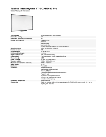 Tablica interaktywna TT-BOARD 80 Pro Specyfikacja techniczna Technologia Przekątna tablicy Przekątna powierzchni roboczej Rodzaj powierzchni Sposób obsługi Format obrazu Rozdzielczość Dokładność odczytu Prędkość kursora Czas reakcji Komunikacja Paski skrótów Wymiary tablicy Wymiary powierzchni roboczej Waga tablicy Zasilanie Akcesoria Akcesoria opcjonalne Gwarancja pozycjonowanie w podczerwieni 83" 80" magnetyczna matowa porcelanowa suchościeralna uszkodzenie nie wpływa na działanie tablicy palec lub dowolny wskaźnik 4:3 32767 x 32767 <0,1mm 180 punktów/sekundę Pierwsza kropka 16ms, ciągła linia 8ms USB po obu stronach tablicy 1720 x 1250 x 3,6 mm 1680 x 1180 mm 20 kg Port USB Instrukcja obsługi inteligentna półka na pisaki Kabel USB (6m) Oprogramowanie Avtek Interactive Suite Pisaki (3 szt) Płyta CD z oprogramowaniem Uchwyty do montażu na ścianie wskaźnik teleskopowy mobilny stojak 3 lata na tablicę, dożywotnia na powierzchnię. Możliwość rozszerzenia do 5 lat za dopłatą 299 zł brutto