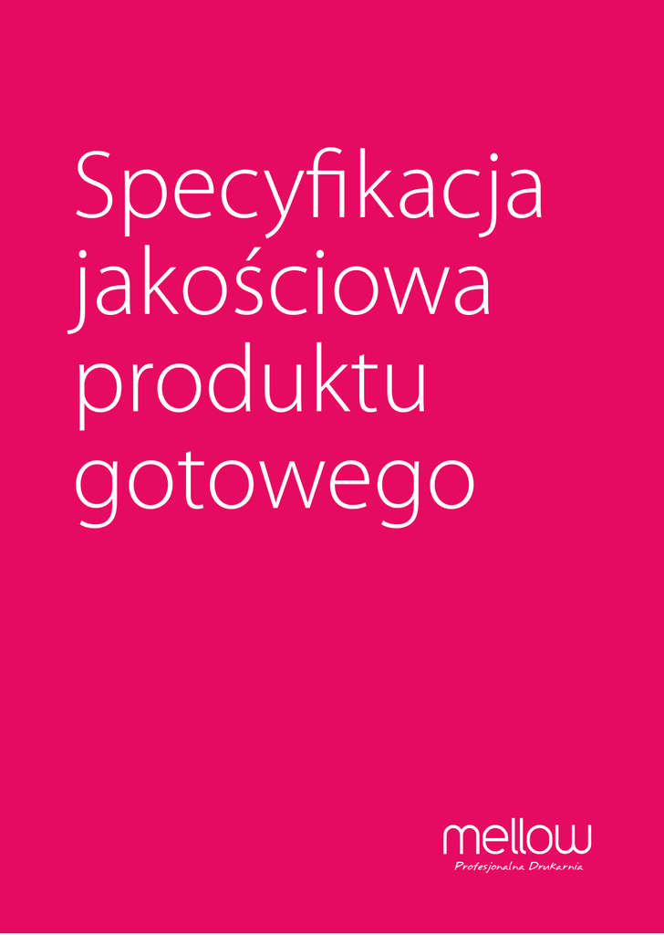 Specyfikacja jakościowa produktu gotowego Profesjonalna Drukarnia SPIS TREŚCI 1. ZAKRES. . . . . . . . . . . . . . . . . . . . . . . . . . . . . . . . . . . . . . . . . . . . . . . . . . . . . . . . . . . . . . . . . . . . . . . . . . . . . . . . . . . . . . . . . . . . . . . 3 2. DEFINICJE . . . . . . . . . . . . . . . . . . . . . . . . . . . . . . . . . . . . . . . . . . . . . . . . . . . . . . . . . . . . . . . . . . . . . . . . . . . . . . . . . . . . . . . . . . . . 3 3. BARWA . . . . . . . . . . . . . . . . . . . . . . . . . . . . . . . . . . . . . . . . . . . . . . . . . . . . . . . . . . . . . . . . . . . . . . . . . . . . . . . . . . . . . . . . . . . . . . . 3 3.1 PASOWANIE RYSUNKU I WARSTWY LAKIERU W PRZYPADKU LAKIEROWANIA WYBIÓRCZEGO. . . . . . 4 3.2 ZŁAM. . . . . . . . . . . . . . . . . . . . . . . . . . . . . . . . . . . . . . . . . . . . . . . . . . . . . . . . . . . . . . . . . . . . . . . . . . . . . . . . . . . . . . . . . . . . . . . 4 4. PROCES OPRAWY INTROLIGATORSKIEJ. . . . . . . . . . . . . . . . . . . . . . . . . . . . . . . . . . . . . . . . . . . . . . . . . . . . . . . . . . . . . . . 4 4.1 FORMAT . . . . . . . . . . . . . . . . . . . . . . . . . . . . . . . . . . . . . . . . . . . . . . . . . . . . . . . . . . . . . . . . . . . . . . . . . . . . . . . . . . . . . . . . . . . 4 4.2 RÓWNOLEGŁOŚĆ CIĘCIA . . . . . . . . . . . . . . . . . . . . . . . . . . . . . . . . . . . . . . . . . . . . . . . . . . . . . . . . . . . . . . . . . . . . . . . . . . 4 4.3 KROJENIE ARKUSZA NA POJEDYNCZE UŻYTKI . . . . . . . . . . . . . . . . . . . . . . . . . . . . . . . . . . . . . . . . . . . . . . . . . . . . . 4 4.4 FALCOWANIE . . . . . . . . . . . . . . . . . . . . . . . . . . . . . . . . . . . . . . . . . . . . . . . . . . . . . . . . . . . . . . . . . . . . . . . . . . . . . . . . . . . . . . 4 4.5 JAKOŚĆ OPRAWY SZYTEJ (ZESZYTOWEJ) . . . . . . . . . . . . . . . . . . . . . . . . . . . . . . . . . . . . . . . . . . . . . . . . . . . . . . . . . . 5 4.6 WYTRZYMAŁOŚĆ OPRAWY SZYTEJ (ZESZYTOWEJ) . . . . . . . . . . . . . . . . . . . . . . . . . . . . . . . . . . . . . . . . . . . . . . . . 5 4.7 POŁOŻENIE OCZEK/DZIUREK. . . . . . . . . . . . . . . . . . . . . . . . . . . . . . . . . . . . . . . . . . . . . . . . . . . . . . . . . . . . . . . . . . . . . . . 5 4.8 JAKOŚĆ OPRAWY KLEJONEJ. . . . . . . . . . . . . . . . . . . . . . . . . . . . . . . . . . . . . . . . . . . . . . . . . . . . . . . . . . . . . . . . . . . . . . . . 5 4.9 WYTRZYMAŁOŚĆ OPRAWY KLEJONEJ . . . . . . . . . . . . . . . . . . . . . . . . . . . . . . . . . . . . . . . . . . . . . . . . . . . . . . . . . . . . . 5 5. NIEZGODNOŚĆ OBRAZU I NIEZGODNOŚCI MECHANICZNE. . . . . . . . . . . . . . . . . . . . . . . . . . . . . . . . . . . . . . . . . . 5 6. PRODUKCJE NIESTANDARDOWE . . . . . . . . . . . . . . . . . . . . . . . . . . . . . . . . . . . . . . . . . . . . . . . . . . . . . . . . . . . . . . . . . . . . . 6 7. INNE PARAMETRY JAKOŚCIOWE . . . . . . . . . . . . . . . . . . . . . . . . . . . . . . . . . . . . . . . . . . . . . . . . . . . . . . . . . . . . . . . . . . . . . . 6 8. PAKOWANIE . . . . . . . . . . . . . . . . . . . . . . . . . . . . . . . . . . . . . . . . . . . . . . . . . . . . . . . . . . . . . . . . . . . . . . . . . . . . . . . . . . . . . . . . . . 6 9. KRYTERIA AKCEPTACJI DOSTAWY . . . . . . . . . . . . . . . . . . . . . . . . . . . . . . . . . . . . . . . . . . . . . . . . . . . . . . . . . . . . . . . . . . . . 6 Specyfikacja obowiązuje od 22 kwietnia 2014 r. 2 1. ZAKRES Dokument określa ogólne standardy jakości wyrobu produkowanego w Mellow Sp. z o.o., jak również kryteria akceptacji produktu finalnego. 2. DEFINICJE Wada - niespełnienie wymagań ograniczające funkcjonalność. Niezgodność- niespełnienie wymagań nie ograniczające funkcjonalności. Funkcjonalność- możliwość użycia zgodnie z przeznaczeniem. Wytyczne kolorystyczne- cyfrowe wzorce definiujące barwę. Proof - wydruk porównawczy, którego celem jest symulacja rzeczywistego procesu druku w sposób jak najwierniej imitujący rezultaty osiągane na maszynie drukarskiej. Karta Zlecenia - stosowana wewnątrz Mellow podstawowa instrukcja wykonania zadania. Przygotowywana przez pracowników działu handlowego, na podstawie informacji dostarczonych przez klienta w zleceniu produkcyjnym. 3. BARWA Podstawową wytyczną kolorystyczną dla wydruków offsetowych jest informacja zobrazowana na proofie, uwzględniając w ewentualnym odstępstwie specyfikę druku offsetowego, jakość papieru oraz inne czynniki mające wpływ na kolorystykę odbitki. Proof powinien być przygotowany zgodnie ze Specyfikacją techniczną przygotowania materiałów do druku offsetowego (dostępna na stronie internetowej Mellow). Niestosowanie się do wytycznych opisanych w powyższym dokumencie może skutkować brakiem zgodności kolorystycznej między produktem a wzorcem. W przypadku druku cyfrowego zgodność kolorystyczną określa wykonany egzemplarz próbny zaakceptowany przez Klienta. Ocena zgodności kolorystyki dokonywana jest wzrokowo jak również na podstawie wykonanych pomiarów barwy za pomocą densytometru. Arkusze nakładowe powinny być zgodne kolorystycznie z dostarczonymi wytycznymi kolorystycznymi. Ocena wizualna powinna odbywać się w standardowych warunkach oświetlenia. Akceptowalne Nieakceptowalne Kolorystyka nieznacznie odbiega od wzorca Kolorystyka znacznie odbiega od wzorca Dopuszczalne odchylenia barwy druku ∆E (w jednostkach CIELAB) pomiędzy odbitką próbną, a odbitką nakładową oraz pomiędzy odbitkami nakładowymi zgodnie z normą ISO 12647-2, obrazuje poniższa tabela Akceptowalne Nieakceptowalne odbitka próbna a nakładowa ∆E ≤ 5 odbitka próbna a nakładowa ∆E > 5 pomiędzy odbitkami nakładowymi ∆E ≤ 3 pomiędzy odbitkami nakładowymi ∆E > 3 Uwaga: Uszlachetnianie produktu może mieć wpływ na barwę - drukarnia nie ponosi odpowiedzialności za zmianę barwy powst