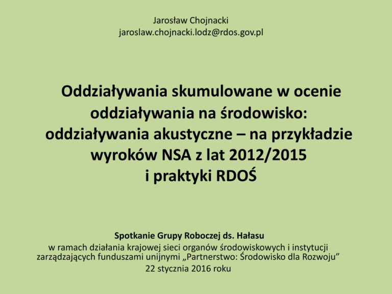 Oddziaływania skumulowane w ocenie oddziaływania na środowisko: oddziaływania akustyczne – na przykładzie wyroków NSA z lat 2012/2015 i praktyki RDOŚ Spotkanie Grupy Roboczej ds. Hałasu w ramach działania krajowej sieci organów środowiskowych i instytucji zarządzających funduszami unijnymi „Partnerstwo: Środowisko dla Rozwoju” 22 stycznia 2016 roku II OSK 2583/13 i II OSK 2071/13 - Wyrok NSA Data orzeczeń 2015-10-27 Naczelny Sąd Administracyjny zważył, co następuje: […] „Słusznie wskazał Sąd pierwszej instancji, że w prognozie oddziaływania na środowisko konieczne jest dokonanie analizy skumulowanego oddziaływania dwóch zespołów elektrowni wiatrowych, na obszarach graniczących ze sobą, przewidzianych w uchwalanych przez Radę Gminy Ustka w tym samym dniu planach miejscowych: 1) dla lokalizacji Parku Wiatrowego Nr 2 w miejscowości Możdżanowo-Starkowo w gminie Ustka oraz 2) dla części terenów położonych w okolicy miejscowości Duninowo, Pęplino w gminie Ustka. Obszary przeznaczone w obu tych planach miejscowych na parki elektrowni wiatrowych graniczą ze sobą. Zgodnie z art. 41 ust. 2 pkt 6 Prawa ochrony środowiska, w brzmieniu obowiązującym w dacie podejmowania uchwały prognoza oddziaływania na środowisko powinna określać, analizować i oceniać przewidywane znaczące oddziaływanie na środowisko oraz zabytki, w tym oddziaływania bezpośrednie, pośrednie, wtórne, skumulowane, krótkoterminowe, średnioterminowe i długoterminowe, stałe i chwilowe”. II OSK 1605/13 - Wyrok NSA Data orzeczenia 2015-01-29 Naczelny Sąd Administracyjny zważył, co następuje: […] Nie ulega wątpliwości, że sama nazwa, jaką oznaczono przedsięwzięcie w raporcie jego oddziaływania na środowisko oraz w decyzji o środowiskowych uwarunkowaniach jego realizacji, nie może mieć znaczenia przesądzającego dla oceny jego charakteru prawnego. Ocenę te należy odnieść do obiektywnych cech przedsięwzięcia, takich jak te wymienione w art. 61 ust. 1 ustawy jako przesłanki, które trzeba wziąć pod uwagę podczas rozstrzygania o obowiązku przeprowadzenia oceny w przypadku przedsięwzięć potencjalnie znacząco oddziałujących na środowisko. Obejmują one zróżnicowane dane, w tym techniczne, obrazujące skalę przedsięwzięcia i jego możliwy wpływ na środowisko i na zdrowie ludzi. Oczywiście, jednym z istotnych czynników w tym zakresie jest usytuowanie przedsięwzięcia i jego powiązanie z innymi przedsięwzięciami, powodującymi m.in. kumulowanie się na określonym obszarze oddziaływań z wielu źródeł. Żadne przedsięwzięcie nie funkcjonuje w całkowitym oderwaniu od otoczenia, w tym bez powiązań z innymi elementami szeroko rozumianej infrastruktury, zresztą tego rodzaju izolacja podważałaby potrzebę przeprowadzania oceny środowiskowej. II OSK 985/13 - Wyrok NSA Data orzeczenia 2014-11-05 Naczelny Sąd Administracyjny zważył, co następuje: […] Jeszcze raz należy podkreślić, że na tym etapie postępowania Kolegium nie ma badać, czy dojdzie do skumulowanego negatywnego oddziaływania inwestycji i zostaną przekroczone np. dopuszczalne normy hałasu, jakości powietrza, a więc na tym etapie postępowania zapoznać się z aktami administracyjnymi pozostałych inwestycji ( A. ), lecz ma ocenić, po pierwsze czy toczą się postępowania dotyczące wskazanych przez Stowarzyszenie "Z." inwestycji, czy są to inwestycje tego samego rodzaju, czy znajdują się na terenie położonym w pobliżu przedmiotowej inwestycji, a więc, czy strona wskazała na okoliczności, które mogą świadczyć o kumulacji negatywnego oddziaływania na środowisko np. w zakresie hałasu. II OSK 1149/11 - Wyrok NSA Data orzeczenia 2012-10-19 Naczelny Sąd Administracyjny zważył, co następuje: […] Odnosząc się natomiast do kwestii kumulacji wskazać należy, że kumulacja zachodziłaby w sytuacji gdyby zasięg inwestycji wykraczał poza granice terenu inwestycji. Natomiast w niniejszej sprawie, obszar oddziaływania inwestycji zamknie się w granicach terenu inwestycji. Wobec powyższego prawidłowo Wojewódzki Sąd Administracyjny uznał, że w przedmiotowej sprawie nie będziemy mieli do czynienia z kumulacją. Wyniki ankiety Ankieta przeprowadzona w dniach 19-21 stycznia 2016 r. wśród przedstawicieli (uzyskano 12 odpowiedzi) Regionalnych Dyrekcji Ochrony Środowiska, którzy biorą udział w spotkaniach Grupy Roboczej ds. Hałasu. Jak uwzględniane są sytuacje, w których z "raportu ooś" wynika, iż oddziaływania skumulowane będą zachodzić pomiędzy przedsięwzięciem planowanym, a istniejącym które już "samo" powoduje przekroczenia dopuszczalnego poziomu hałasu? Jak uwzględniane są sytuacje, w których z "raportu ooś" wynika, iż oddziaływania skumulowane będą zachodzić pomiędzy przedsięwzięciem planowanym, a istniejącym które już "samo" powoduje przekroczenia dopuszczalnego poziomu hałasu? • jeśli planowane przedsięwzięcie NIE BĘDZIE przyczyniać się do powiększenia istniejących przekroczeń, nie ma "problemu„ 50% • w ooś oceniania jest sama inwestycja a nie istniejące tło akustyczne, jeśli sama inwestycja nie powoduje przekroczeń, nie ma problemu 42% • brak możliwości "uzgodnienia" inwestycji 8% Czy przy analizie wariantów lokalizacyjnych uwzględnia się inne źródła hałasu i porównuje obie lokalizacje pod kątem oddziaływań skumulowanych? • TAK 43% • W zależności od przypadku 23 % • NIE 17% • NIE MAM ZDANIA 17% Czy w decyzji/uzgodnieniu zdarza się nakładać obowiązek wykonania analizy porealizacyjnej uwzględniającej oddziaływania skumulowane? • NIE 50% • TAK 42% • NIE MAM ZDANIA 8% Czy w przypadku kilku przedsięwzięć procedowanych równolegle (mniej więcej w tym samym czasie) wokół tego samego terenu chronionego akustycznie, dany Inwestor POWINIEN UWZGLĘDNIAĆ w swoim "RAPORCIE" te sąsiednie inwestycje, dla których NIE WYDANO jeszcze d