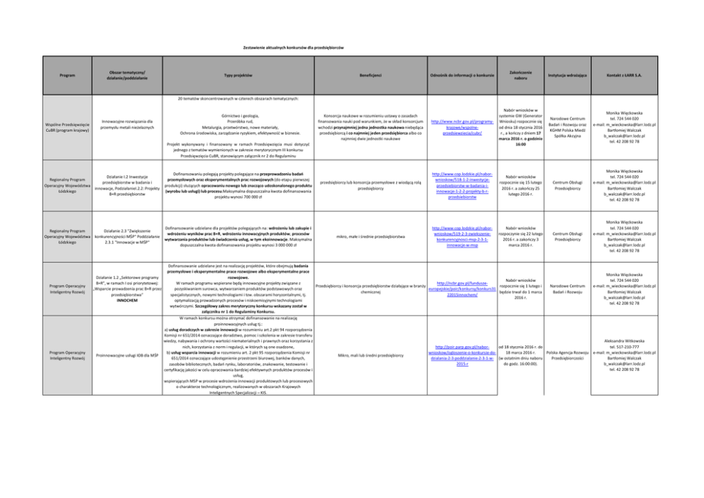 Zestawienie aktualnych konkursów dla przedsiębiorców Program Obszar tematyczny/ działanie/poddziałanie Typy projektów Beneficjenci Odnośnik do informacji o konkursie Zakończenie naboru Instytucja wdrażająca Kontakt z ŁARR S.A. Konsorcja naukowe w rozumieniu ustawy o zasadach finansowania nauki pod warunkiem, że w skład konsorcjum wchodzi przynajmniej jedna jednostka naukowa niebędąca przedsiębiorcą i co najmniej jeden przedsiębiorca albo co najmniej dwie jednostki naukowe http://www.ncbr.gov.pl/programykrajowe/wspolneprzedsiewziecia/cubr/ Nabór wniosków w systemie GW (Generator Wniosku) rozpocznie się od dnia 18 stycznia 2016 r., a kończy z dniem 17 marca 2016 r. o godzinie 16:00 Narodowe Centrum Badań i Rozwoju oraz KGHM Polska Miedź Spółka Akcyjna Monika Więckowska tel. 724 544 020 e-mail: [email protected] Bartłomiej Walczak [email protected] tel. 42 208 92 78 przedsiębiorcy lub konsorcja przemysłowe z wiodącą rolą przedsiębiorcy http://www.cop.lodzkie.pl/naborwnioskow/518-1-2-inwestycjeprzedsiebiorstw-w-badania-iinnowacje-1-2-2-projekty-b-rprzedsiebiorstw Nabór wniosków rozpocznie się 15 lutego 2016 r. a zakończy 25 lutego 2016 r. Centrum Obsługi Przedsiębiorcy Monika Więckowska tel. 724 544 020 e-mail: [email protected] Bartłomiej Walczak [email protected] tel. 42 208 92 78 mikro, małe i średnie przedsiębiorstwa http://www.cop.lodzkie.pl/naborwnioskow/519-2-3-zwiekszeniekonkurencyjnosci-msp-2-3-1innowacje-w-msp Nabór wniosków rozpoczynie się 22 lutego 2016 r. a zakończy 3 marca 2016 r. Centrum Obsługi Przedsiębiorcy Monika Więckowska tel. 724 544 020 e-mail: [email protected] Bartłomiej Walczak [email protected] tel. 42 208 92 78 Narodowe Centrum Badań i Rozwoju Monika Więckowska tel. 724 544 020 e-mail: [email protected] Bartłomiej Walczak [email protected] tel. 42 208 92 78 20 tematów skoncentrowanych w czterech obszarach tematycznych: Wspólne Przedsięwzięcie CuBR (program krajowy) Innowacyjne rozwiązania dla przemysłu metali nieżelaznych Górnictwo i geologia, Przeróbka rud, Metalurgia, przetwórstwo, nowe materiały, Ochrona środowiska, zarządzanie ryzykiem, efektywność w biznesie. Projekt wykonywany i finansowany w ramach Przedsięwzięcia musi dotyczyć jednego z tematów wymienionych w zakresie merytorycznym III konkursu Przedsięwzięcia CuBR, stanowiącym załącznik nr 2 do Regulaminu Regionalny Program Operacyjny Województwa Łódzkiego Działanie I.2 Inwestycje przedsiębiorstw w badania i innowacje, PodziałanieI.2.2: Projekty B+R przedsiębiorstw Dofinansowaniu polegają projekty polegające na przeprowadzeniu badań przemysłowych oraz eksperymentalnych prac rozwojowych (do etapu pierwszej produkcji) służących opracowaniu nowego lub znacząco udoskonalonego produktu (wyrobu lub usługi) lub procesu.Maksymalna dopuszczalna kwota dofinansowania projektu wynosi 700 000 zł Regionalny Program Operacyjny Województwa Łódzkiego Działanie 2.3 "Zwiększenie konkurencyjności MŚP" Poddziałanie 2.3.1 "Innowacje w MŚP" Dofinansowanie udzielane dla projektów polegających na: wdrożeniu lub zakupie i wdrożeniu wyników prac B+R, wdrożeniu innowacyjnych produktów, procesów wytwarzania produktów lub świadczenia usług, w tym ekoinnowacje. Maksymalna dopuszczalna kwota dofinansowania projektu wynosi 3 000 000 zł Program Operacyjny Inteligentny Rozwój Działanie 1.2 „Sektorowe programy B+R”, w ramach I osi priorytetowej: „Wsparcie prowadzenia prac B+R przez przedsiębiorstwa” INNOCHEM Dofinansowanie udzielane jest na realizację projektów, które obejmują badania przemysłowe i eksperymentalne prace rozwojowe albo eksperymentalne prace rozwojowe. W ramach programu wspierane będą innowacyjne projekty związane z pozyskiwaniem surowca, wytwarzaniem produktów podstawowych oraz specjalistycznych, nowymi technologiami i tzw. obszarami horyzontalnymi, tj. optymalizacją prowadzonych procesów i niskoemisyjnymi technologiami wytwórczymi. Szczegółowy zakres merytoryczny konkursu wskazany został w załączniku nr 1 do Regulaminy Konkursu. Proinnowacyjne usługi IOB dla MŚP W ramach konkursu można otrzymać dofinansowanie na realizację proinnowacyjnych usług tj.: a) usług doradczych w zakresie innowacji w rozumieniu art.2 pkt 94 rozporządzenia Komisji nr 651/2014 oznaczające doradztwo, pomoc i szkolenia w zakresie transferu wiedzy, nabywania i ochrony wartości niematerialnych i prawnych oraz korzystania z nich, korzystania z norm i regulacji, w których są one osadzone, b) usług wsparcia innowacji w rozumieniu art. 2 pkt 95 rozporządzenia Komisji nr 651/2014 oznaczające udostępnienie przestrzeni biurowej, banków danych, zasobów bibliotecznych, badań rynku, laboratoriów, znakowanie, testowanie i certyfikację jakości w celu opracowania bardziej efektywnych produktów procesów i usług, wspierających MSP w procesie wdrożenia innowacji produktowych lub procesowych o charakterze technologicznym, realizowanych w obszarach Krajowych Inteligentnych Specjalizacji – KIS. Program Operacyjny Inteligentny Rozwój Nabór wniosków http://ncbr.gov.pl/funduszePrzedsiębiorcy i konsorcja przedsiębiorstw działające w branży rozpocznie się 1 lutego i europejskie/poir/konkursy/konkurs31 chemicznej będzie trwał do 1 marca 22015innochem/ 2016 r. Mikro, mali lub średni przedsiębiorcy http://poir.parp.gov.pl/naborod 18 stycznia 2016 r. do wnioskow/ogloszenie-o-konkursie-do18 marca 2016 r. Polska Agencja Rozwoju dzialania-2-3-poddzialanie-2-3-1-w- (w ostatnim dniu naboru Przedsiębiorczości 2015-r do godz. 16:00:00). Aleksandra Witkowska tel. 517-210-777 e-mail: [email protected] Bartłomiej Walczak [email protected] tel. 42 208 92 78 Celem konkursu jest udzielenie pomocy finansowej w formie bezzwrotnego wsparcia finansowego na realizację projektów polegających na wdrożeniu rozwiązań z zakresu społecznej odpowiedzialności biznesu. Przez społeczną odpowiedzialność biznesu