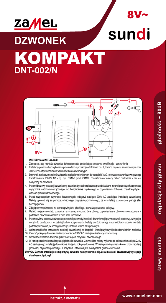 8V~ DZWONEK KOMPAKT głośność ~ 80dB DNT-002/N instrukcja montażu łatwy montaż Instrukcja instalacji: 1. Zaleca się, aby montażu dzwonka dokonała osoba posiadająca stosowne kwalifikacje i uprawnienia. 2. Instalacja powinna być wykonana przewodem o przekroju od 0,5mm² do 2,5mm² o napięciu znamionowym min. 300/500V i odpowiednim do warunków zastosowania typie. 3. Dzwonek zasilany może być wyłącznie napięciem obniżonym do wartości 8V AC, przy zastosowaniu zewnętrznego transformatora 230/8V AC - np. typu TRM-8 prod. ZAMEL. Transformator należy nabyć oddzielnie - nie jest dołączony do dzwonka. 4. Przewód fazowy instalacji dzwonkowej powinien być zabezpieczony przed skutkami zwarć i przeciążeń za pomocą wyłącznika nadmiarowoprądowego lub bezpiecznika topikowego o odpowiednio dobranej charakterystyce i wartości prądu znamionowego. 5. Przed rozpoczęciem czynności łączeniowych, odłączyć napięcie 230V AC zasilające instalację dzwonkową. Należy upewnić się za pomocą właściwego przyrządu pomiarowego, że w instalacji dzwonkowej panuje stan beznapięciowy. 6. Zdjąć pokrywę dzwonka za pomocą wkrętaka płaskiego, podważając zaczep pokrywy. 7. Ustalić miejsce montażu dzwonka na ścianie, wykonać dwa otwory, odpowiadające otworom montażowym w podstawie dzwonka i osadzić w nich kołki rozporowe. 8. Przez otwór w podstawie dzwonka przełożyć przewody instalacji dzwonkowej i przymocować podstawę, wkręcając wkręty do osadzonych wcześniej kołków rozporowych. Należy zwrócić uwagę na prawidłowy sposób montażu podstawy dzwonka, w szczególności jej ułożenie w kierunku pionowym. 9. Odizolować końce przewodów instalacji dzwonkowej na długości 10mm i przyłączyć je do odpowiednich zacisków. 10. Założyć pokrywę dzwonka i załączyć napięcie 230V AC zasilające instalację dzwonkową. 11. Sprawdzić działanie dzwonka przez naciśnięcie przycisku dzwonkowego. 12. W razie potrzeby dokonać regulacji głośności dzwonka. Czynność tą należy wykonać po odłączeniu napięcia 230V AC zasilającego instalację dzwonkową i zdjęciu pokrywy dzwonka. W razie potrzeby (dalsza konieczność regulacji głośności) czynności powtórzyć. Fabrycznie ustawiona jest maksymalna głośność dzwonka. UWAGA! Zawsze przed zdjęciem pokrywy dzwonka należy upewnić się, że w instalacji dzwonkowej występuje stan beznapięciowy! regulacja siły głosu 8V~ 230V~ www.zamelcet.com karta gwarancyjna producent udziela 24 miesięcznej gwarancji pieczęć i podpis sprzedawcy, data sprzedaży 1. ZAMEL Sp. z o.o. udziela 24 - miesięcznej gwarancji na sprzedawane towary. 2. Gwarancją ZAMEL Sp. z o.o. nie są objęte: a) mechaniczne uszkodzenia powstałe w transporcie, załadunku/ rozładunku lub innych okolicznościach, b) uszkodzenia powstałe na skutek wadliwie wykonanego montażu lub eksploatacji wyrobów ZAMEL Sp. z o.o., c) uszkodzenia powstałe na skutek jakichkolwiek przeróbek dokonanych przez KUPUJĄCEGO lub osoby trzecie a odnoszących się do wyrobów będących przedmiotem sprzedaży lub urządzeń niezbędnych do prawidłowego funkcjonowania wyrobów będących przedmiotem sprzedaży, d) uszkodzenia wynikające z działania siły wyższej lub innych zdarzeń losowych, za które ZAMEL Sp. z o.o. nie ponosi odpowiedzialności e) źródła zasilania (baterie), będące na wyposażeniu urządzenia w momencie jego sprzedaży (jeśli występują). 3. Wszelkie roszczenia z tytułu gwarancji KUPUJĄCY zgłosi w punkcie zakupu lub firmie ZAMEL Sp. z o.o. na piśmie po ich stwierdzeniu. 4. ZAMEL Sp. z o.o. zobowiązuje się do rozpatrywania reklamacji zgodnie z obowiązującymi przepisami prawa polskiego. 5. Wybór formy załatwienia reklamacji, np. wymiana towaru na wolny od wad, naprawa lub zwrot pieniędzy należy do ZAMEL Sp. z o.o. 6. Terytorialny zasięg obowiązywania gwarancji: Rzeczpospolita Polska. 7. Gwarancja nie wyłącza, nie ogranicza, ani nie zawiesza uprawnień KUPUJĄCEGO wynikających z niezgodności towaru z umową. ZAMEL sp. z o.o. 43-200 Pszczyna, ul. Zielona 27, tel.: (32) 210 46 65; fax: (32) 210 80 04 e-mail: [email protected], www.zamelcet.com DNT-002/N DZWONEK KOMPAKT Dzwonek elektromechaniczny. Dźwięk: źródłem dźwięku jest stalowa czasza (Ø 76 mm) zamknięta w obudowie z tworzywa sztucznego. Regulacji głośności można dokonywać poprzez obrót czaszy dzwonka. Głośność: ~80 dB. 8V~/5VA; IP20 PN-EN 60335-1 DNT-002/N-001 Masa netto wyrobu: 0,22 kg Symbol oznaczający selektywne zbieranie sprzętu elektrycznego i elektronicznego. Zakaz umieszczania zużytego sprzętu z innymi odpadami. Deklaracja zgodności znajduje się na stronie internetowej www.zamelcet.com