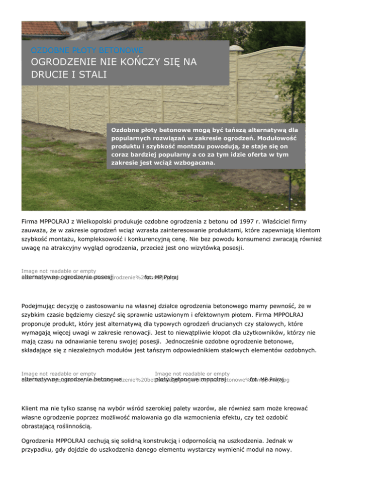 OZDOBNE PŁOTY BETONOWE OGRODZENIE NIE KOŃCZY SIĘ NA DRUCIE I STALI Ozdobne płoty betonowe mogą być tańszą alternatywą dla popularnych rozwiązań w zakresie ogrodzeń. Modułowość produktu i szybkość montażu powodują, że staje się on coraz bardziej popularny a co za tym idzie oferta w tym zakresie jest wciąż wzbogacana. Firma MPPOLRAJ z Wielkopolski produkuje ozdobne ogrodzenia z betonu od 1997 r. Właściciel firmy zauważa, że w zakresie ogrodzeń wciąż wzrasta zainteresowanie produktami, które zapewniają klientom szybkość montażu, kompleksowość i konkurencyjną cenę. Nie bez powodu konsumenci zwracają również uwagę na atrakcyjny wygląd ogrodzenia, przecież jest ono wizytówką posesji. Image not readable or empty alternatywne ogrodzenie posesji fot. MP Polraj userfiles/image/alternatywne%20ogrodzenie%20posesji.jpg Podejmując decyzję o zastosowaniu na własnej działce ogrodzenia betonowego mamy pewność, że w szybkim czasie będziemy cieszyć się sprawnie ustawionym i efektownym płotem. Firma MPPOLRAJ proponuje produkt, który jest alternatywą dla typowych ogrodzeń drucianych czy stalowych, które wymagają więcej uwagi w zakresie renowacji. Jest to niewątpliwie kłopot dla użytkowników, którzy nie mają czasu na odnawianie terenu swojej posesji. Jednocześnie ozdobne ogrodzenie betonowe, składające się z niezależnych modułów jest tańszym odpowiednikiem stalowych elementów ozdobnych. Image not readable or empty Image not readable or empty alternatywne ogrodzenie betonowe ploty betonowe mppolraj fot. MP Polraj userfiles/image/alternatywne%20ogrodzenie%20betonowe.jpg userfiles/image/ploty%20betonowe%20mppolraj.jpg Klient ma nie tylko szansę na wybór wśród szerokiej palety wzorów, ale również sam może kreować własne ogrodzenie poprzez możliwość malowania go dla wzmocnienia efektu, czy też ozdobić obrastającą roślinnością. Ogrodzenia MPPOLRAJ cechują się solidną konstrukcją i odpornością na uszkodzenia. Jednak w przypadku, gdy dojdzie do uszkodzenia danego elementu wystarczy wymienić moduł na nowy. Płoty betonowe są produktem bardzo wszechstronnym, wygodnym, który sprawdza się praktycznie w każdych warunkach, w ogrodach, mniejszych i większych posesjach, ale też na terenach firm, gdzie takie ogrodzenie może chronić przed ingerencją z zewnątrz. Paradoksalnie beton może zapewnić spokój i prywatność właścicielom wiejskich posesji, którzy uciekają przed nim z zatłoczonych miast. Ogrodzenia betonowe zapewniają skuteczną osłonę przed ciekawskimi sąsiadami, izolują akustycznie i zapewniają prywatność. wzory betonowe na ogrodzeniu Image not readable or empty userfiles/image/wzory%20betonowe%20na%20ogrodzeniu.jpg producent ogrodzen betonowych fot. MP Polraj Image not readable or empty userfiles/image/producent%20ogrodzen%20betonowych.jpg Obecnie firma MPPOLRAJ pracuje nad rozszerzeniem asortymentu i zapowiada, że w najbliższym czasie zaprezentuje nowe ogrodzenie z wzorem dwustronnym. Na dzień dzisiejszy największym atutem firmy jest szeroki wachlarz wzorów oraz kompleksowa usługa instalacji ogrodzenia. Operacja montażu odbywa się bardzo szybko. Ekipa wykonuje otwory pod słupki ogrodzeniowe za pomocą wiertnic a ich osadzenie odbywa się za pomocą suchego betonu. Dziennie ekipa montażowa jest w stanie postawić 35 m płotu o wysokości 2 m. Najważniejszym atutem ogrodzeń betonowych jest oszczędność czasu, którego ciągle brakuje w życiu codziennym. W stosunku do tradycyjnych rozwiązań, stosując ogrodzenia betonowe na montażu można zaoszczędzić go ponad trzy krotnie. system ogrodzen polraj Image not readable or empty userfiles/image/system%20ogrodzen%20polraj.jpg ogrodzenia modulowe beton fot. MP Polraj Image not readable or empty userfiles/image/ogrodzenia%20modulowe%20beton.jpg Dlaczego warto zdecydować się na ozdobne płoty betonowe: - bardzo trwałe; - szybkie w montażu; - nie wymagają konserwacji; - łatwo dostępne moduły zamienne; - neutralny kolor; - bogaty wybór wzorów; - możliwość nakładania koloru; - skuteczna izolacja akustyczna i wizualna. Aby skontaktować się z firmą zajrzyj na www.mppolraj.pl