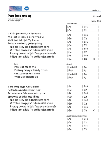 exodus 15 Pan jest mocą C - mol muz. Karolina Kupczyk sł. Michał Kupczyk bpm: 116 Intro (4 razy) 1. Któż jest taki jak Ty Panie Kto jest w stanie dorównać Ci Któż jest taki jak Ty Panie Święty wzniosły jedyny Bóg Nic nie liczy się odnalazłem sens W Tobie mogę żyć odmieniłeś mnie Proszę pokaż mi jak Twą prawdę nieść Pójdę tam gdzie Ty pokierujesz mnie 2. Bo | AH | Gm | BH6 | C2 | | | AH | Gm | AH | Gm | AH | Gm | AH | Gm | BH6 | C2 | BH6 | C2 | BH6 | C2 | BH6 | C4 | | | | | | | C | Ref. (2 razy) Pan jest mocą mą Pieśnią moją w każdy dzień On zbawieniem mym Więc uwielbiam Go | Cm7add2 | Fm7 | Cm7add2 | Fm7 | AH | AH | AH | AH | AH | Gm | AH | Gm | AH | Gm | AH | Gm | BH6 | C2 | BH6 | C2 | BH6 | C2 | BH6 | C4 imię Jego Odkupiciel Pełen łaski odwieczny Bóg Tchnieniem fale sam zatrzymał Sprawca cudów ocalił lud Nic nie liczy się odnalazłem sens W Tobie mogę żyć odmieniłeś mnie Proszę pokaż mi jak Twą prawdę nieść Pójdę tam gdzie Ty pokierujesz mnie | | | | | | | | | | | C | (część instrumentalana + rap) | AH | Gm | AH | Gm | BH6 | C2 | BH6 | C2 | | | |
