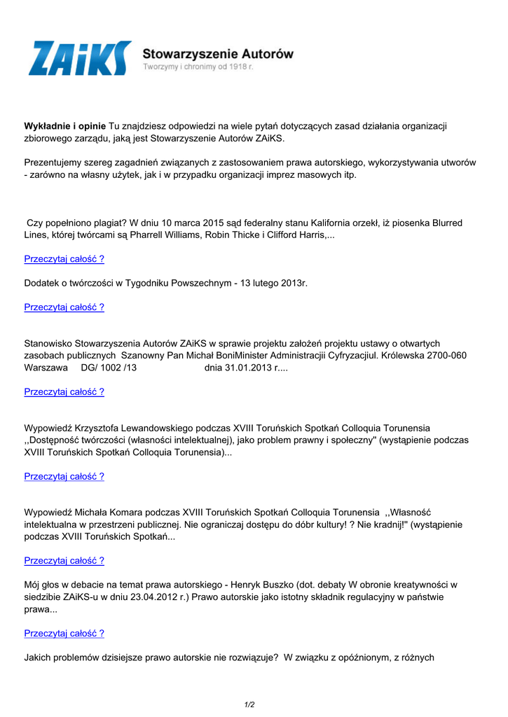 Wykładnie i opinie Tu znajdziesz odpowiedzi na wiele pytań dotyczących zasad działania organizacji zbiorowego zarządu, jaką jest Stowarzyszenie Autorów ZAiKS. Prezentujemy szereg zagadnień związanych z zastosowaniem prawa autorskiego, wykorzystywania utworów - zarówno na własny użytek, jak i w przypadku organizacji imprez masowych itp. Czy popełniono plagiat? W dniu 10 marca 2015 sąd federalny stanu Kalifornia orzekł, iż piosenka Blurred Lines, której twórcami są Pharrell Williams, Robin Thicke i Clifford Harris,... Przeczytaj całość ? Dodatek o twórczości w Tygodniku Powszechnym - 13 lutego 2013r. Przeczytaj całość ? Stanowisko Stowarzyszenia Autorów ZAiKS w sprawie projektu założeń projektu ustawy o otwartych zasobach publicznych Szanowny Pan Michał BoniMinister Administracjii Cyfryzacjiul. Królewska 2700-060 Warszawa DG/ 1002 /13 dnia 31.01.2013 r.... Przeczytaj całość ? Wypowiedź Krzysztofa Lewandowskiego podczas XVIII Toruńskich Spotkań Colloquia Torunensia ,,Dostępność twórczości (własności intelektualnej), jako problem prawny i społeczny'' (wystąpienie podczas XVIII Toruńskich Spotkań Colloquia Torunensia)... Przeczytaj całość ? Wypowiedź Michała Komara podczas XVIII Toruńskich Spotkań Colloquia Torunensia ,,Własność intelektualna w przestrzeni publicznej. Nie ograniczaj dostępu do dóbr kultury! ? Nie kradnij!'' (wystąpienie podczas XVIII Toruńskich Spotkań... Przeczytaj całość ? Mój głos w debacie na temat prawa autorskiego - Henryk Buszko (dot. debaty W obronie kreatywności w siedzibie ZAiKS-u w dniu 23.04.2012 r.) Prawo autorskie jako istotny składnik regulacyjny w państwie prawa... Przeczytaj całość ? Jakich problemów dzisiejsze prawo autorskie nie rozwiązuje? W związku z opóźnionym, z różnych 1/2 względów, zainteresowaniem polskiego społeczeństwa ACTA, do dyskusji publicznej powrócił problem dotyczący granic ochrony... Przeczytaj całość ? 72. Treść prawa autorskiego cz.2. Autorskie prawa majątkowe Autorskie prawa majątkowe to podstawowe uprawnienie, obok praw osobistych, przysługujące autorowi z tytułu stworzenia utworu. Prawa te są zbywalne w każdy... Przeczytaj całość ? 71. Treść prawa autorskiego cz.1 Od wielu lat na łamach Muzyka próbuję twórcom, artystom wykonawcom i użytkownikom twórczości wyjaśniać treść prawa autorskiego i praw pokrewnych. Ciągle... Przeczytaj całość ? 70. Roszczenia cywilne z tytułu naruszeń majątkowych praw autorskich lub pokrewnych Od czasu wejścia w życie w maju 1994 roku ustawy o prawie autorskim i prawach pokrewnych (Pr. aut.) uległa zmianie treść art.79 Pr. aut., będącego podstawą... Przeczytaj całość ? Następna ? 12345678 Wszelkie prawa zastrzeżone 2017 ZAiKS / data wygenerowania strony 03.03.2017 19:30:11 PDF ze strony: http://www.zaiks.org.pl/246,88,wykladnie_i_opinie 2/2