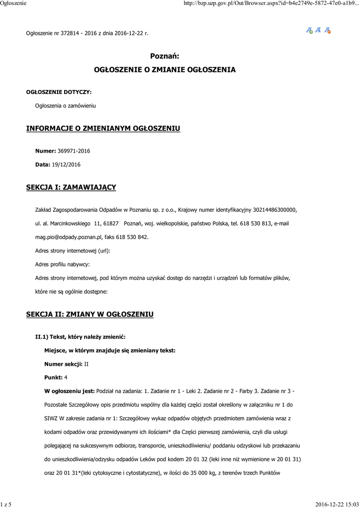 Poznań: OGŁOSZENIE O ZMIANIE OGŁOSZENIA INFORMACJE O