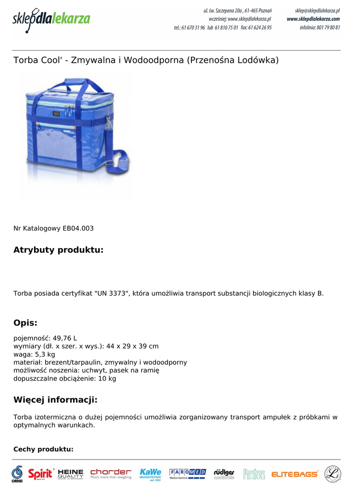 Torba Cool' - Zmywalna i Wodoodporna (Przenośna Lodówka) Nr Katalogowy EB04.003 Atrybuty produktu: Torba posiada certyfikat "UN 3373", która umożliwia transport substancji biologicznych klasy B. Opis: pojemność: 49,76 L wymiary (dł. x szer. x wys.): 44 x 29 x 39 cm waga: 5,3 kg materiał: brezent/tarpaulin, zmywalny i wodoodporny możliwość noszenia: uchwyt, pasek na ramię dopuszczalne obciążenie: 10 kg Więcej informacji: Torba izotermiczna o dużej pojemności umożliwia zorganizowany transport ampułek z próbkami w optymalnych warunkach. Cechy produktu: wzmocniona konstrukcja i trwałe ergonomiczne zamki, 3 wyjmowane saszetki na ampułki stojące mieszczące ok. 100 szt. każda (wym. 26,5 x 14 x 27 cm), 1 płaska wyjmowana saszetka z ruchomymi przegrodami mieszcząca ok. 24 pojemniki np. z moczem (wym. 42 x 26,5 x 9,5 cm), identyfikatory zewnętrzne, 2 płaskie, przezroczyste kieszenie na dokumentacje, termometr lodówkowy umożliwiający kontrolę temperatury wewnątrz torby. Powered by TCPDF (www.tcpdf.org)