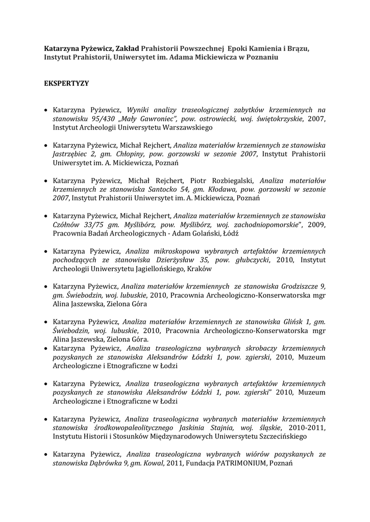 Katarzyna Pyżewicz, Zakład Prahistorii Powszechnej Epoki Kamienia i Brązu, Instytut Prahistorii, Uniwersytet im. Adama Mickiewicza w Poznaniu EKSPERTYZY Katarzyna Pyżewicz, Wyniki analizy traseologicznej zabytków krzemiennych na stanowisku 95/430 „Mały Gawroniec”, pow. ostrowiecki, woj. świętokrzyskie, 2007, Instytut Archeologii Uniwersytetu Warszawskiego Katarzyna Pyżewicz, Michał Rejchert, Analiza materiałów krzemiennych ze stanowiska Jastrzębiec 2, gm. Chłopiny, pow. gorzowski w sezonie 2007, Instytut Prahistorii Uniwersytet im. A. Mickiewicza, Poznań Katarzyna Pyżewicz, Michał Rejchert, Piotr Rozbiegalski, Analiza materiałów krzemiennych ze stanowiska Santocko 54, gm. Kłodawa, pow. gorzowski w sezonie 2007, Instytut Prahistorii Uniwersytet im. A. Mickiewicza, Poznań Katarzyna Pyżewicz, Michał Rejchert, Analiza materiałów krzemiennych ze stanowiska Czółnów 33/75 gm. Myślibórz, pow. Myślibórz, woj. zachodniopomorskie”, 2009, Pracownia Badań Archeologicznych - Adam Golański, Łódź Katarzyna Pyżewicz, Analiza mikroskopowa wybranych artefaktów krzemiennych pochodzących ze stanowiska Dzierżysław 35, pow. głubczycki, 2010, Instytut Archeologii Uniwersytetu Jagiellońskiego, Kraków Katarzyna Pyżewicz, Analiza materiałów krzemiennych ze stanowiska Grodziszcze 9, gm. Świebodzin, woj. lubuskie, 2010, Pracownia Archeologiczno-Konserwatorska mgr Alina Jaszewska, Zielona Góra Katarzyna Pyżewicz, Analiza materiałów krzemiennych ze stanowiska Glińsk 1, gm. Świebodzin, woj. lubuskie, 2010, Pracownia Archeologiczno-Konserwatorska mgr Alina Jaszewska, Zielona Góra. Katarzyna Pyżewicz, Analiza traseologiczna wybranych skrobaczy krzemiennych pozyskanych ze stanowiska Aleksandrów Łódzki 1, pow. zgierski, 2010, Muzeum Archeologiczne i Etnograficzne w Łodzi Katarzyna Pyżewicz, Analiza traseologiczna wybranych artefaktów krzemiennych pozyskanych ze stanowiska Aleksandrów Łódzki 1, pow. zgierski” 2010, Muzeum Archeologiczne i Etnograficzne w Łodzi Katarzyna Pyżewicz, Analiza traseologiczna wybranych materiałów krzemiennych stanowiska środkowopaleolitycznego Jaskinia Stajnia, woj. śląskie, 2010-2011, Instytutu Historii i Stosunków Międzynarodowych Uniwersytetu Szczecińskiego Katarzyna Pyżewicz, Analiza traseologiczna wybranych wiórów pozyskanych ze stanowiska Dąbrówka 9, gm. Kowal, 2011, Fundacja PATRIMONIUM, Poznań Katarzyna Pyżewicz, Wyniki analiz traseologicznych wybranych zabytków krzemiennych ze stanowiska 2 w Nakonowie Starym, gm. Choceń, 2011, Fundacja PATRIMONIUM, Poznań Katarzyna Pyżewicz, Wyniki analiz mikroskopowych artefaktów krzemiennych ze stanowiska 1 w miejscowości Płonka-Kozły, gm. Łapy, woj. podlaskie, 2011, Instytut Archeologii, Uniwersytet Mikołaja Kopernika w Toruniu Katarzyna Pyżewicz, Materiały krzemienne ze stanowiska Witoldowo 1, A1-46, 2011, Centrum Archeologiczne Fundacji Uniwersytetu im. A. Mickiewicza w Poznaniu Katarzyna Pyżewicz, Analiza materiałów krzemiennych z neolitycznego stanowiska Szczecin-Gumieńce i Mierzyn, woj. zachodniopomorskie, 2011, Muzeum Narodowe w Szczecinie Katarzyna Pyżewicz, Analiza materiałów krzemiennych ze stanowiska Bytkowo 1, gm. Rokietnica, woj. wielkopolskie”, 2011, Pracownia Archeologiczno–Konserwatorska mgr Alina Jaszewska, Zielona Góra Katarzyna Pyżewicz, Analiza traseologiczna wybranych zabytków krzemiennych odkrytych na stanowisku 1 i 56 w Adamowie, pow. Grodzisk Mazowiecki, 2011, Instytut Archeologii Uniwersytetu Warszawskiego Katarzyna Pyżewicz, Analiza traseologiczna materiałów krzemiennych ze stanowiska Koszyce 3, pow. proszowicki, 2012, Stowarzyszenie Archeologów Terenowych STATER, Niepołomice Katarzyna Pyżewicz, Analiza materiałów krzemiennych ze stanowisk Kraków-Przewóz 1 i Kraków-Przewóz 2, woj., małopolskie, 2012, Pracownia Archeologiczno– Konserwatorska mgr Alina Jaszewska, Zielona Góra. Katarzyna Pyżewicz, Badania traseologiczne artefaktów krzemiennych z mezolitycznego grobu w Janisławicach, 2013, Muzeum Archeologiczne w Warszawie Katarzyna Pyżewicz, Analiza traseologiczna wybranych artefaktów ze stanowiska magdaleńskiego w Klementowicach, 2013, Instytut Archeologii, Uniwersytet Marii Curie-Skłodowskiej w Lublinie Katarzyna Pyżewicz, Analiza traseologiczna wybranych artefaktów krzemiennych ze stanowiska Tominy, stan. 6, woj. świętokrzyskie, 2014, Instytut Archeologii, Uniwersytet Marii Curie-Skłodowskiej w Lublinie Katarzyna Pyżewicz, Analiza traseologiczna wybranych artefaktów ze stanowiska magdaleńskiego w Klementowicach, cz. 2, 2014, Instytut Archeologii, Uniwersytet Marii Curie-Skłodowskiej w Lublinie Katarzyna Pyżewicz, Mateusz Frankiewicz, Mikołaj Lisowski, Analiza mikroskopowa wybranych wytworów kostnych ze stanowiska Kopydłowo 6, gm. Wilczyn, 2014, Instytut Prahistorii, Uniwersytet im. Adama Mickiewicza w Poznaniu Katarzyna Pyżewicz, Analiza mikroskopowa artefaktów kamiennych ze stanowiska Kopydłowo 6, gm. Wilczyn, 2014, Instytut Prahistorii, Uniwersytet im. Adama Mickiewicza w Poznaniu Katarzyna Pyżewicz, Analiza materiałów kamiennych ze stanowiska Lubomia, stan. 13, woj. śląskie (AZP 103/40/138), 2014, Instytut Prahistorii, Uniwersytet im. Adama Mickiewicza w Poznaniu Katarzyna Pyżewicz, Analiza materiałów krzemiennych ze stanowiska Tworków, stan. 9, woj. śląskie, 2014, Instytut Prahistorii, Uniwersytet im. Adama Mickiewicza w Poznaniu