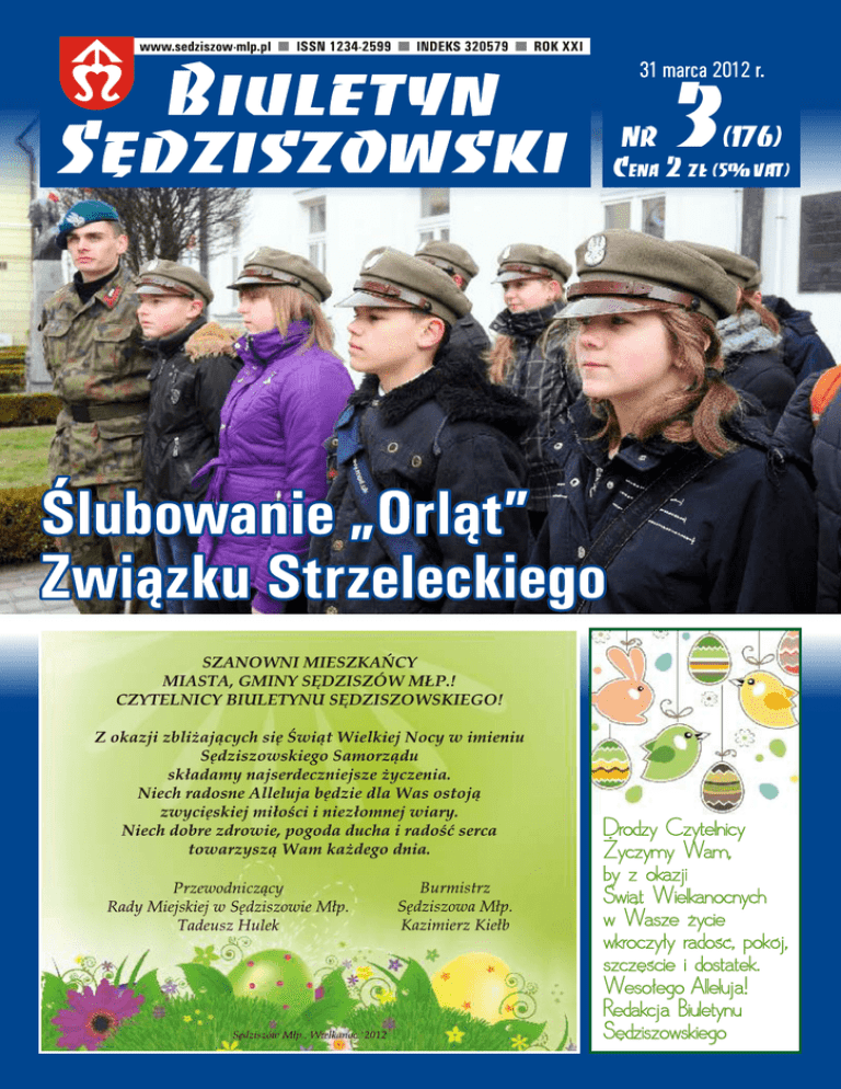 W skrócie 27 lutego 2012 r. Dyrektor Lucyna Doroba podpisała porozumienie o współpracy Liceum Ogólnokształcącego im. ks. Piotra Skargi w Sędziszowie Młp. z Uniwersytetem Rzeszowskim. Rzeszowską uczelnię reprezentował rektor Stanisław Uliasz. W związku z upływem pięcioletniej kadencji obecnych dyrektorów, Burmistrz Sędziszowa Małopolskiego ogłosił konkursy na dyrektorów następujących szkół: Gimnazjum w Sêdziszowie M³p., Gimnazjum w Zagorzycach Grn., Zespo³u Szkó³ w Górze Ropczyckiej, Szko³y Podstawowej w Boreczku, Szko³y Podstawowej w Klêczanach, Publicznego Przedszkola nr 1 oraz Publicznego Przedszkola nr 2. Konkursy odbêd¹ siê kwietniu b.r. Zespół Pieśni i Tańca „Rochy” zdobył I miejsce w IV Podkarpackim Przeglądzie Dziecięcych i MłodzieżoDziêki porozumieniu sêdziszowscy licealiœci zyskali mo¿liwoœæ udzia³u wych Zespołów Taw wyk³adach, seminariach, konferencjach organizowanych na tere- necznych „Złoty Gryf”. nie uniwersytetu. Rzeszowska uczelnia z kolei bêdzie w liceum pre- Przegl¹d odby³ siê 17 marca w Domu Kultury „Mors” w Dêbicy. Sêdziszowski zespó³ rywalizowa³ w grupie 13-18-latków. Na scenie zentowaæ swoj¹ ofertê dydaktyczn¹ wœród maturzystów. zaprezentowa³ suitê tañców przeworskich, a pierwsze miejsce podzieli³ z ZPiT „Sanok” z Sanoka. Minister Skarbu Państwa po raz kolejny oferuje do nabycia akcje Wytwórni Filtrów w Sędziszowie Młp. Do kupienia jest 85% akcji (1.055.700 akcji o wartoœci nominalnej10 z³ ka¿da). Minister Skarbu decyzjê o prywatyzacji „Filtrów” podj¹³ ju¿ cztery lata temu, jednak¿e jak dot¹d nie zg³osi³ siê odpowiedni nabywca. W ubieg³ym roku wydawa³o siê, ¿e takim bêdzie firma MTM Sp. z o.o., jednak¿e ta, po pierwotnym wyra¿eniu zainteresowania i podjêciu negocjacji, zrezygnowa³a z kupna akcji sêdziszowskiego zak³adu. Od tego czasu, ministerstwo kilkakrotnie og³asza³o przetarg na sprzeda¿ akcji, nie by³o jednak zainteresowanych kupnem. Miejmy nadziejê, ¿e tym razem proces prywatyzacji siê powiedzie, bowiem zak³ad ten, oprócz posiadania ogromnych tradycji, siêgaj¹cych okresu miêdzywojennego, przede wszystkim zapewnia pracê kilkuset osobom. 12 marca 2012 r. młodzież z Zespołu Szkół Zawodowych w Sędziszowie Młp. przy współpracy Gminnego Klubu Honorowego Dawcy Krwi Wielopole Skrzyńskie, przeprowadziła wyjazdową akcję oddawania krwi dla dzieci – pacjentów Polsko-Amerykańskiego Instytutu Pediatrii w Krakowie-Prokocimiu. Udzia³ w akcji wziê³o czternaœcioro uczniów pod opiek¹ pani mgr Marii Parys i pani mgr Renaty Bia³ek. Oto nazwiska ofiarnych uczniów ZSZ: Kinga Strêk, Maria Kozek, Ewelina Ptaszek, Karolina Skiba, Mateusz ¯erkowski, Jakub Piwowar, Kamil Rak, Mateusz Pieja, Wojciech Œliwa, Kamil Paj¹k, Pawe³ K³ósek, Justyna Bieszcz, Karolina Pazdro, Adrian Ocha³. Wyjazd dawcom zafundowa³ Gminny Oœrodek Kultury i Wypoczynku w Wielopolu, który wynaj¹³ autobus. MIEJSKO-GMINNY OŚRODEK KULTURY W SĘDZISZOWIE MŁP. 26 kwietnia (czwaratek) godz.18.00 CENA BILETU 30 ZŁ SALA WIDOWISKOWA DOMU KULTURY REZERWACJA POD NR TEL. 17 221 60 44 W kwietniu do egzaminów przystąpią uczniowie ostatnich klas szkół podstawowych i gimnazjów. Szóstoklasiœci swój sprawdzian napisz¹ w dniu 3. kwietnia, natomiast egzamin trzecioklasistów (z gimnazjów) potrwa a¿ trzy dni: 24.,25.,26. kwietnia: Część humanistyczna odbędzie się 24 kwietnia 2012 r. (wtorek): – z zakresu historii i wiedzy o społeczeństwie: godzina 9.00, czas 60 minut – z zakresu języka polskiego: godzina 10.45, czas 90 minut Część matematyczno-przyrodnicza odbędzie się 25 kwietnia 2012 r. (środa): – z zakresu przedmiotów przyrodniczych: godzina 9.00, czas 60 minut – z zakresu matematyki: godzina 10.45, czas 90 minut Część z języka obcego nowożytnego odbędzie się 26 kwietnia 2012 r. (czwartek): – na poziomie podstawowym: godzina 9.00,czas 60 minut – na poziomie rozszerzonym: godzina 10.45, czas 60 minut. Wszystkim zdaj¹cym ¿yczymy znakomitych wyników. 2 Nr 3 (176) 31 marca 2012 r. Ślubowanie „Orląt” Związku Strzeleckiego 7. marca 2012 roku, w kościele pw. Św. Krzyża w Rzeszowie grupa 33 dziewcząt i chłopców ze szkół podstawowych w Wolicy Piaskowej, Klęczanach i nr 3 w Sędziszowie Młp., działająca w „Orlętach” Związku Strzeleckiego „Strzelec”, złożyła uroczyste ślubowanie. Ślubowanie „Orląt” było jednym z elementów wspaniałych obchodów 100-lecia Związku Strzeleckiego „Strzelec” na Rzeszowszczyźnie oraz 93. Rocznicy śmierci płk. Leopolda Lisa-Kuli. Z inicjatyw¹ utworzenia dru¿yn „Orl¹t” w szko³ach podstawowych naszej gminy wyst¹pi³ pan dr Jacek Magdoñ, nauczyciel LO im. ks. Piotra Skargi w Sêdziszowie M³p. i równoczeœnie organizator Zwi¹zku Strzeleckiego „Strzelec” w powiecie ropczycko-sêdziszowskim. „Orlêta” nawi¹zuj¹ do tradycji II Rzeczypospolitej. Wówczas to wœród m³odszych uczniów powo³ano organizacjê, której celem by³o kontynuowanie tradycji najm³odszych obroñców Ojczyzny - Orl¹t Lwowskich. Uroczystoœæ, podczas której nasze „Orlêta” z³o¿y³y œlubowanie, rozpoczê³a siê Msz¹ œw., której przewodniczyli: bp polowy Wojska Polskiego Józef Guzdek oraz bp ordynariusz diecezji rzeszowskiej Kazimierz Górny. W homilii bp Józef Guzdek zaapelowa³ do m³odzie¿y, aby by³a wytrwa³a w osi¹ganiu swoich celów: B¹dŸcie ciekawi œwiata i zg³êbiajcie wiedzê tak, jak to czyni³ p³k. Lis-Kula. Gratulujê wam, ¿e wybieracie tê trudn¹ drogê, drogê ¿ycia zgodnego z ideami ewangelicznymi wypisanymi na sztandarach. A jest to droga s³u¿by Bogu, OjczyŸnie i drugiemu cz³owiekowi. W czasie nabo¿eñstwa „Orlêta” wyst¹pi³y przed o³tarz i w skupieniu wys³ucha³y Prawa Orl¹t Zwi¹zku Strzeleckiego. Po odczytaniu Prawa „Orl¹t” ZS, pad³a komenda: - Do przyrzeczenia! „Orlêta” praw¹ d³oñ unios