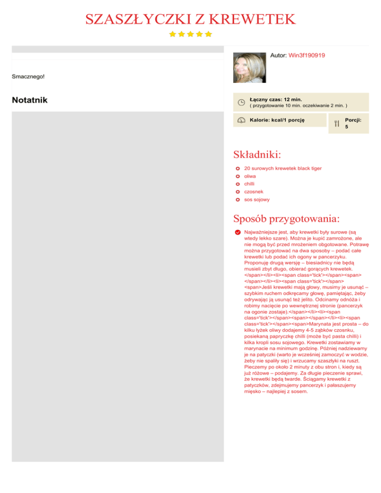 SZASZŁYCZKI Z KREWETEK Autor: Win3f190919 Smacznego! Notatnik Łączny czas: 12 min. ( przygotowanie 10 min. oczekiwanie 2 min. ) Kalorie: kcal/1 porcję Porcji: 5 Składniki: 20 surowych krewetek black tiger oliwa chilli czosnek sos sojowy Sposób przygotowania: Najważniejsze jest, aby krewetki były surowe (są wtedy lekko szare). Można je kupić zamrożone, ale nie mogą być przed mrożeniem obgotowane. Potrawę można przygotować na dwa sposoby – podać całe krewetki lub podać ich ogony w pancerzyku. Proponuję drugą wersję – biesiadnicy nie będą musieli zbyt długo, obierać gorących krewetek. </span></li><li><span class='tick'></span><span> </span></li><li><span class='tick'></span> <span>Jeśli krewetki mają głowy, musimy je usunąć – szybkim ruchem odkręcamy głowę, pamiętając, żeby odrywając ją usunąć też jelito. Odcinamy odnóża i robimy nacięcie po wewnętrznej stronie (pancerzyk na ogonie zostaje).</span></li><li><span class='tick'></span><span></span></li><li><span class='tick'></span><span>Marynata jest prosta – do kilku łyżek oliwy dodajemy 45 ząbków czosnku, posiekaną papryczkę chilli (może być pasta chilli) i kilka kropli sosu sojowego. Krewetki zostawiamy w marynacie na minimum godzinę. Później nadziewamy je na patyczki (warto je wcześniej zamoczyć w wodzie, żeby nie spaliły się) i wrzucamy szaszłyki na ruszt. Pieczemy po około 2 minuty z obu stron i, kiedy są już różowe – podajemy. Za długie pieczenie sprawi, że krewetki będą twarde. Ściągamy krewetki z patyczków, zdejmujemy pancerzyk i pałaszujemy mięsko – najlepiej z sosem.