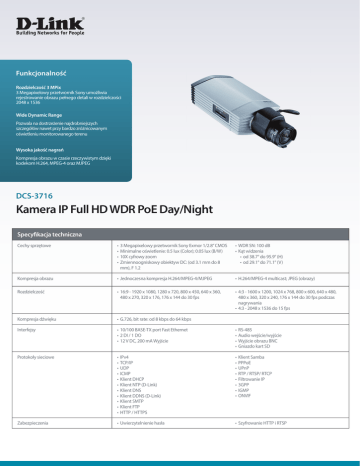Funkcjonalność Rozdzielczość 3 MPix 3 Megapixelowy przetwornik Sony umożliwia rejestrowanie obrazu pełnego detali w rozdzielczości 2048 x 1536 Wide Dynamic Range Pozwala na dostrzeżenie najdrobniejszych szczegółów nawet przy bardzo zróżnicowanym oświetleniu monitorowanego terenu Wysoka jakość nagrań Kompresja obrazu w czasie rzeczywistym dzięki kodekom H.264, MPEG-4 oraz MJPEG DCS-3716 Kamera IP Full HD WDR PoE Day/Night Specyfikacja techniczna Cechy sprzętowe • 3 Megapixelowy przetwornik Sony Exmor 1/2.8” CMOS • Minimalne oświetlenie: 0.5 lux (Color); 0.05 lux (B/W) • 10X cyfrowy zoom • Zmiennoogniskowy obiektyw DC: (od 3.1 mm do 8 mm), F 1.2 • WDR SN: 100 dB • Kąt widzenia • od 38.7° do 95.9° (H) • od 29.1° do 71.1° (V) Kompresja obrazu • Jednoczesna kompresja H.264/MPEG-4/MJPEG • H.264/MPEG-4 multicast; JPEG (obrazy) Rozdzielczość • 16:9 - 1920 x 1080, 1280 x 720, 800 x 450, 640 x 360, 480 x 270, 320 x 176, 176 x 144 do 30 fps • 4:3 - 1600 x 1200, 1024 x 768, 800 x 600, 640 x 480, 480 x 360, 320 x 240, 176 x 144 do 30 fps podczas nagrywania • 4:3 - 2048 x 1536 do 15 fps Kompresja dźwięku • G.726, bit rate: od 8 kbps do 64 kbps Interfejsy • 10/100 BASE-TX port Fast Ethernet • 2 DI / 1 DO • 12 V DC, 200 mA Wyjście • RS-485 • Audio wejście/wyjście • Wyjście obrazu BNC • Gniazdo kart SD Protokoły sieciowe • IPv4 • TCP/IP • UDP • ICMP • Klient DHCP • Klient NTP (D-Link) • Klient DNS • Klient DDNS (D-Link) • Klient SMTP • Klient FTP • HTTP / HTTPS • Klient Samba • PPPoE • UPnP • RTP / RTSP/ RTCP • Filtrowanie IP • 3GPP • IGMP • ONVIF Zabezpieczenia • Uwierzytelnienie hasła • Szyfrowanie HTTP i RTSP DCS-3716 Kamera IP Full HD WDR PoE Day/Night Zarządzanie Wymagania systemowe • Przeglądarka: Internet Explorer 6 lub nowszy, Firefox 1.5 lub nowszy lub inna z Java Rejestracja zdarzeń • Wykrywanie ruchu • Powiadomienia e-mail oraz nagrywanie zdarzeń zdjęć/filmów wysyłanych na e-mail lub FTP Zdalne zarządzanie • Interfejs konfiguracji dostępny przez przeglądarkę web Wymagania systemowe dla D-ViewCam™ • Microsoft Windows 7/Vista/XP • Przeglądarka WEB Unternet Explorer 7 lub nowsza • Protokół: standard TCP/IP Funkcjonalność oprogramowania D-ViewCam™ • Zdalne zarządzanie • Kontrola i zarządzanie maksymalnie 32 kamerami • Podgląd obrazu z 32 kamer na ekranie • Harmonogram nagrywania, wykrywanie ruchu, ręczne wyzwalanie nagrywania • Wsparcie dla serwerów SMTP i FTP • Obsługa wielu zdarzeń • Zdjęcia/filmy zapisywane na dysku lokalnym lub serwerze NAS Główne Waga • 580 g Zasilanie • 12 V DC / 1.25 A • 802.3af PoE Pobór mocy • 4 W Temperatura • Operacyjna: od 0 do 40 °C • Przechowywania: od -20 do 70 °C Wilgotność • Operacyjna: od 20% do 80% bez kondensacji • Przechowywania: od 5% do 95% bez kondensacji Certyfikaty • CE • CE LVD • ICES-003 • FCC • C-Tick Wymiary