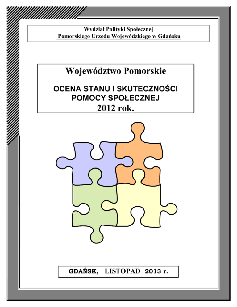 Wydział Polityki Społecznej Pomorskiego Urzędu Wojewódzkiego w Gdańsku Województwo Pomorskie OCENA STANU I SKUTECZNOŚCI POMOCY SPOŁECZNEJ 2012 rok. GDAŃSK, LISTOPAD 2013 r. OCENA STANU I SKUTECZNOŚCI POMOCY SPOŁECZNEJ WOJEWÓDZTWA POMORSKIEGO ZA ROK 2012 (zawierająca również parametry z roku 2011 i I półrocza 2013) Liczba środowisk objętych świadczeniami pomocy społecznej w województwie pomorskim w 2012 roku liczyła 76.460 rodzin skupiających 202.296 osób. W stosunku do roku 2011 nastąpił znaczący spadek zarówno liczby rodzin objętych pomocą (o 3.976) jak i liczby osób w nich funkcjonujących (o 12.914). Ma to zapewne związek z przejściem części rodzin z systemu pomocy społecznej do systemu pieczy zastępczej. Analizując strukturę środowisk korzystających ze świadczeń pomocy społecznej stwierdzamy, że mieszkańcy wsi w 2012 roku stanowili 46% ogólnej liczby gospodarstw domowych objętych pomocą ( o 2% więcej niż w 2011 r.) przy wskaźniku wojewódzkim ludności wiejskiej wynoszącym 35% . Udział gospodarstw domowych objętych pomocą społeczną w 2012 roku w ogólnej liczbie gospodarstw województwa wynosił 10,0%. Rok wcześniej kształtował się na poziomie 10,7%. Na mapie ukazującej udział gospodarstw domowych objętych pomocą społeczną w układzie powiatowym (tzw. „mapa biedy” – Załącznik Nr 1) zauważamy, iż kumulacja powiatów o najwyższym udziale gospodarstw domowych objętych pomocą społeczną ukształtowała się w zachodniej części naszego województwa - tzw. „ściana zachodnia”. Na pozostałym obszarze naszego regionu tylko powiat kwidzyński wykazuje najwyższy poziom tego wskaźnika. Zakres pomocy powiązany jest najczęściej ze skalą bezrobocia występującego w poszczególnych powiatach, chociaż od zasady tej występują odstępstwa – tak jak to tradycyjnie ma miejsce w przypadku powiatów: Nowy Dwór Gdański, Malbork, Sztum. Posiadają one stosunkowo wysokie bezrobocie 1 natomiast wskaźniki „pomocowe” nie osiągają najwyższych wartości. Wszystkie te relacje ukazane zostały w Załączniku Nr 3. Wśród rodzin objętych pomocą społeczną niezmiennie od wielu lat dominują rodziny z dziećmi. W 2012 r. grupa ta stanowiła 43,2%. W ramach tej populacji najwięcej było rodzin z jednym lub dwojgiem dzieci – obrazują to wykresy i tabela przestawione w Załączniku Nr 12, 13 i 14. Z analizy sprawozdań wynika, iż zadania z zakresu pomocy społecznej, wyznaczone stosownymi przepisami zostały w 2012 r. wykonane przez jednostki samorządu w proporcjach jakie umożliwiały środki finansowe, którymi dysponowała na ten cel administracja rządowa wszystkich szczebli. i samorządowa Prawidłowości, które zarysowały się podczas realizacji tych zadań przedstawiają się w sposób następujący: Nadal dominują zasiłki pieniężne, jednak relacje i tendencje w poszczególnych formach świadczeń są zróżnicowane. W przypadku zasiłków stałych nastąpił kolejny wzrost liczby osób korzystających. W 2012 r. do świadczeń tych zakwalifikowano 17.418 osób co spowodowało wzrost w porównaniu do roku 2011 o 4,7%, a w porównaniu do roku 2010 aż o 10,2 %. W zasiłkach okresowych wystąpiła natomiast tendencja odwrotna – liczba korzystających (wynosząca 21.316 osób) spadła w stosunku do roku poprzedniego o 0,2 % , a w stosunku do roku 2010 spadek ten wyniósł aż 10,3%. Zasiłki celowe przyznano 55.383 osobom, to jest o 3,5% mniej w porównaniu do roku poprzedniego, a w stosunku do roku 2010 o 6,6%. Szczegółowe informacje zbiorcze dotyczące województwa przedstawiono w załącznikach Nr 5 i 9. Dane liczbowe o osobach korzystających z pomocy w naturze przestawiamy w załączniku Nr 5. Zapotrzebowanie na te formy wsparcia waha 2 się od kilku do kilkunastu tysięcy świadczeń i od kilku lat systematycznie się zmniejsza, z wyjątkiem schronienia, które ma niewielką tendencję wzrostową. W 2012 roku nastąpił wzrost liczby osób korzystających z usług opiekuńczych specjalistycznych finansowanych ze środków rządowych w stosunku do roku poprzedniego o 93 i w efekcie liczba ta wyniosła 979 osób w całym województwie i świadczy o coraz większych potrzebach w tym zakresie. Niezmiennie utrzymuje się bardzo niepokojąca tendencja spadku liczby osób, które korzystają usług opiekuńczych finansowanych przez gminy. W 2012 r. tą formą wsparcia objętych zostało 5.448 osób czyli o 119 osób mniej niż w roku poprzednim (w ujęciu procentowym o 2,1%). Konieczna jest zatem pogłębiona analiza tego procesu i podjęcie odpowiednich działań przez jednostki samorządowe zmierzające do zmiany tej niekorzystnej sytuacji. Środowiskowe domy samopomocy. Budowanie sieci oparcia społecznego dla osób z zaburzeniami psychicznymi wymaga od pomocy środowiskowej rozwoju istniejących i powstawania nowych ośrodków wsparcia dziennego – Środowiskowych Domów Samopomocy i Klubów Samopomocy. Proces ich powstawania rozpoczął się od czasu uchwalenia w roku 1994 ustawy o ochronie zdrowia psychicznego, która, zgodnie z art. 9, uruchomiła tworzenie sieci oparcia społecznego, jako zadania zarówno dla sektora ochrony zdrowia jak i pomocy społecznej. 3 Obecnie w województwie pomorskim funkcjonuje 61 środowiskowych domów samopomocy, w tym 2 powiatowe, dla 1 655 osób z zaburzeniami psychicznymi. Są one rozmieszczone w prawie wszystkich powiatach, z wyjątkiem nowodworskiego (mimo wielokrotnych prób aktywizacji podejmowanych przez tutejszy Wydział). Uczestnicy środowiskowych domów samopomocy nie muszą zrywać kontaktu z bliskimi, często działania ośrodków są motorem aktywizującym środowiska lokalne przyczyniając się do wprowadzania w praktykę idei integracji społecznej oraz przyczyniają się do łamania stereotypów dotyczących osób z zaburzeniami psychicznymi. Praktyka udowadnia, że środowiskowe domy samopomocy sprawdzają się jako ważny element 
