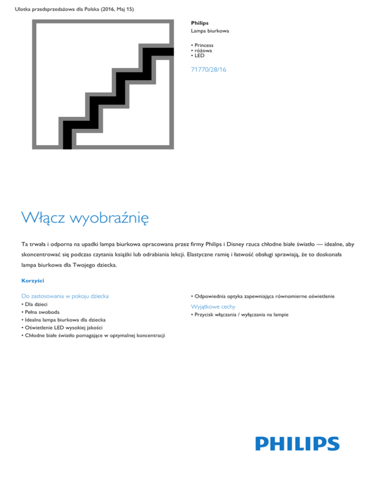 Ulotka przedsprzedażowa dla Polska (2016, Maj 15) Philips Lampa biurkowa • Princess • różowa • LED 71770/28/16 Włącz wyobraźnię Ta trwała i odporna na upadki lampa biurkowa opracowana przez firmy Philips i Disney rzuca chłodne białe światło — idealne, aby skoncentrować się podczas czytania książki lub odrabiania lekcji. Elastyczne ramię i łatwość obsługi sprawiają, że to doskonała lampa biurkowa dla Twojego dziecka. Korzyści Do zastosowania w pokoju dziecka • Odpowiednia optyka zapewniająca równomierne oświetlenie • Dla dzieci • Pełna swoboda • Idealna lampa biurkowa dla dziecka • Oświetlenie LED wysokiej jakości • Chłodne białe światło pomagające w optymalnej koncentracji Wyjątkowe cechy • Przycisk włączania / wyłączania na lampie Cechy Dla dzieci Chłodne białe światło Ta opracowana przez firmy Philips i Disney lampa do pokoju dziecka pozwoli stworzyć przestrzeń, w której dzieci będą mogły robić to, co lubią najbardziej, czyli bawić się i rozwijać swoją kreatywność! Miejsce, w którym dzieci mogą się uczyć, bawić i spać w towarzystwie ulubionych bohaterów filmów Disneya. Produkt został zaprojektowany z myślą o bezpieczeństwie dzieci. Światło może mieć różne temperatury barwowe oznaczane za pomocą jednostek zwanych kelwinami (K). Lampy o niskiej wartości kelwinów zapewniają ciepłe, bardziej przytulne światło, natomiast lampy o wysokiej wartości kelwinów dają chłodne, bardziej pobudzające światło. Ta lampa rzuca chłodne, białe światło zapewniające optymalną koncentrację. Pełna swoboda Przyjemne dla oka Odpowiednia optyka zastosowana w tej lampie biurkowej Philips i Disney sprawia, że rzucane przez nią światło jest rozproszone i równomiernie oświetla biurko dziecka. Eliminuje to problem z niejednolitym i oślepiającym światłem, które męczy wzrok. Przycisk włączania / wyłączania na lampie Dzięki regulowanemu reflektorowi tę opracowaną przez firmy Philips i Disney lampę można bezpiecznie obrócić w wybranym kierunku, tak aby kierowała światło tam, gdzie jest ono potrzebne. Lampa biurkowa dla dziecka Opracowana przez firmy Philips i Disney lampa do sypialni dziecka nadaje się doskonale do ustawienia na biurku. Rzuca chłodne białe światło — idealne, aby skoncentrować się podczas czytania książki lub odrabiania lekcji. Jej poręczność i łatwość obsługi sprawiają, że to doskonała lampa dla dzieci chodzących do szkoły. Dyskretnie umieszczony na oprawie przycisk umożliwia łatwe włączanie i wyłączanie światła. Oświetlenie LED wysokiej jakości Technologia LED zastosowana w tej lampie to wyjątkowe rozwiązanie opracowane przez firmę Philips. Natychmiast się włącza, pozwala na uzyskanie optymalnej wydajności oświetlenia oraz podkreśla i ożywia kolory w pokoju dziecka. Specyfikacje Prosimy pamiętać, że jest to ulotka przedsprzedażowa. Treść ulotki jest zgodna z naszą najlepszą wiedzą w momencie publikacji i w odniesieniu do danego kraju (podane powyżej). Treść ulotki może ulec zmianie bez powiadomienia. Firma Philips nie ponosi odpowiedzialności za treść ulotki. Stylistyka i wykończenie Materiał Kolor syntetyk różowa Dodatkowe funkcje/akcesoria w zestawie Przycisk włączania / wyłączania na lampie Wbudowane diody LED Elastyczne ramię TAK TAK TAK Wymiary i waga produktu Wysokość Długość Szerokość 24 cm 19 cm 18 cm Waga netto 0,378 kg Dane techniczne Zasilanie sieciowe Technologia źródła światła Liczba źródeł światła Moc źródła światła w zestawie Barwa światła Łączna moc strumienia świetlnego oprawy w lumenach Przedział 220–240 V 50–60 Hz LED Bezpieczne, bardzo niskie napięcie 1 4W chłodne światło dzienne 270 lm Dane wkrótce ulegną zmianie 2016, Maj 15 Oprawa z możliwością przyciemniania LED Wbudowane źródło światła LED Współczynnik IP Klasa ochronności Nie Wymiary i waga opakowania TAK TAK IP20 ochrona przed przedmiotami powyżej 12,5 mm brak ochrony przed wodą III — bezpieczne, bardzo niskie napięcie Serwis Gwarancja Wysokość Długość Szerokość Waga 33,4 cm 15,1 cm 11,1 cm 0,584 kg Różne Opracowano z myślą o Styl Typ Pokój dziecka Pełen ekspresji Lampa biurkowa 2 lata Dane wkrótce ulegną zmianie 2016, Maj 15 Version: 1.0.1 EAN: 8718696126363 © 2016 Koninklijke Philips Electronics N.V. Wszelkie prawa zastrzeżone Dane mogą ulec zmianie bez uprzedniego powiadomienia. Znak towarowy jest własnością Koninklijke Philips Electronics N.V. lub odpowiednich podmiotów . www.philips.com