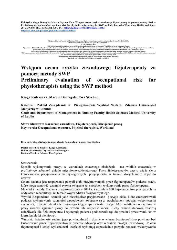 Kulczycka Kinga, Domagała Marcin, Stychno Ewa. Wstępna ocena ryzyka zawodowego fizjoterapeuty za pomocą metody SWP = Preliminary evaluation of occupational risk for physiotherapists using the SWP method. Journal of Education, Health and Sport. 2016;6(9):805-817. eISSN 2391-8306. DOI http://dx.doi.org/10.5281/zenodo.159402 http://ojs.ukw.edu.pl/index.php/johs/article/view/3918 The journal has had 7 points in Ministry of Science and Higher Education parametric evaluation. Part B item 755 (23.12.2015). 755 Journal of Education, Health and Sport eISSN 2391-8306 7 © The Author (s) 2016; This article is published with open access at Licensee Open Journal Systems of Kazimierz Wielki University in Bydgoszcz, Poland Open Access. This article is distributed under the terms of the Creative Commons Attribution Noncommercial License which permits any noncommercial use, distribution, and reproduction in any medium, provided the original author(s) and source are credited. This is an open access article licensed under the terms of the Creative Commons Attribution Non Commercial License (http://creativecommons.org/licenses/by-nc/4.0/) which permits unrestricted, non commercial use, distribution and reproduction in any medium, provided the work is properly cited. This is an open access article licensed under the terms of the Creative Commons Attribution Non Commercial License (http://creativecommons.org/licenses/by-nc/4.0/) which permits unrestricted, non commercial use, distribution and reproduction in any medium, provided the work is properly cited. The authors declare that there is no conflict of interests regarding the publication of this paper. Received: 02.09.2016. Revised 24.09.2016. Accepted: 24.09.2016. Wstępna ocena ryzyka zawodowego fizjoterapeuty za pomocą metody SWP Preliminary evaluation of occupational risk for physiotherapists using the SWP method Kinga Kulczycka, Marcin Domagała, Ewa Stychno Katedra i Zakład Zarządzania w Pielęgniarstwie Wydział Nauk o Zdrowiu Uniwersytet Medyczny w Lublinie Chair and Department of Management in Nursing Faculty Health Sciences Medical University of Lublin Słowa kluczowe: Narażenie zawodowe, Fizjoterapeuci, Obciążenie pracą Key words: Occupational exposure, Physical therapists, Workload Dr n. med. Kinga Kulczycka, mgr. Marcin Domagała, dr n.med. Ewa Stychno Doctor of Medical Sciences Kinga Kulczycka, Holder of University Degree Marcin Domagała, Doctor of Medical Sciences Ewa Stychno Streszczenie Sposób wykonywania pracy, w warunkach znacznego obciążenia ma wielkie znaczenie w profilaktyce zaburzeń układu mięśniowo-szkieletowego. Praca fizjoterapeutów często wiąże się z koniecznością przyjmowania niefizjologicznych pozycji ciała, w trakcie których może dojść do urazów. Celem badania jest rozpoznanie pozycji ciała przyjmowanych przez fizjoterapeutów podczas pracy, które mogą stanowić czynniki ryzyka związane ze sposobem wykonywania pracy fizjoterapeuty. Materiał i metody Badania przeprowadzono w 2014 r. z udziałem 100 fizjoterapeutów pracujących na oddziałach rehabilitacji, na terenie województwa Świętokrzyskiego. Wyniki Respondenci oceniali jako niewłaściwe przyjmowane pozycje ciała, które zaobserwowali podczas wykonywania czynności zawodowych związane są z pochylaniem podczas wykonywania czynności, zgięcie odcinka lędźwiowego kręgosłupa i częste rotacje. Jako dodatkowe obciążenia w pracy uważali zginanie głowy do przodu lub skręcenie karku. Ruchy ramion stanowią znaczną uciążliwość dla fizjoterapeutów i występują podczas podnoszenia rąk do przodu i przesuwaniu ich w kierunku klatki piersiowej. Wnioski: świadomość ruchu, jego powtarzalność i dbanie o własne bezpieczeństwo powinno być kształtowane przez fizjoterapeutów w procesie edukacji oraz w trakcie praktyki zawodowej. Młodsi fizjoterapeuci i lepiej wykształceni częściej wybierają odpowiednie pozycje podczas wykonywania 805 pracy. Wraz ze wzrostem liczby miejsc pracy wzrasta ryzyko urazu związanego z nieprawidłowym sposobem wykonywania czynności zawodowych. Summary The method of performing work in conditions of a considerable work load is of great importance in the prophylaxis of musculoskeletal disorders. The work of physiotherapists is frequently associated with the necessity for assuming non-physiological body positions, during which an injury may occur. The objective of the study is the recognition of body positions assumed by physiotherapists, which may be classified into occupational risk factors related with the method of performing the work of a physiotherapist. Material and method The study was conducted in 2014 in the Kielce Region and covered 100 physiotherapists employed in rehabilitation wards. Results The respondents evaluated as incorrect body positions assumed while performing occupational activities related with: long-term leaning position while performing activities, protrusion of the lumbar section of the spine, and frequent rotations. As an additional load at work they considered bending the head forward or twisting the neck. Arm movements constitute considerable onerousness for physiotherapists and occur while elevating the arms forward and moving them towards the chest. Conclusions: The awareness of movement, its repeatability, and care of own safety should be shaped by physiotherapists in the education process and during occupational practice. Younger physiotherapists more often choose adequate positions while performing work. An improvement of professional qualifications exerts an effect on assuming correct positions at work by physiotherapists. An increase in the number of workplaces is accompanied by an increased risk of injury related with incorrect method of performing occupational activities. Wstęp Tematyka ryzyka zawodowego jak i ergonomii jest poruszana w czasie nauki fizjoterapeuty, zarówno w programie edukacyjnym uczelni jak i podczas poznawania metod terapeutycznych. Isto
