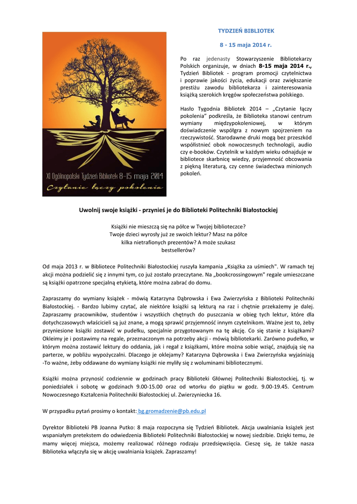 TYDZIEŃ BIBLIOTEK 8 - 15 maja 2014 r. Po raz jedenasty Stowarzyszenie Bibliotekarzy Polskich organizuje, w dniach 8-15 maja 2014 r., Tydzień Bibliotek - program promocji czytelnictwa i poprawie jakości życia, edukacji oraz zwiększanie prestiżu zawodu bibliotekarza i zainteresowania książką szerokich kręgów społeczeństwa polskiego. Hasło Tygodnia Bibliotek 2014 – „Czytanie łączy pokolenia” podkreśla, że Biblioteka stanowi centrum wymiany międzypokoleniowej, w którym doświadczenie współgra z nowym spojrzeniem na rzeczywistość. Starodawne druki mogą bez przeszkód współistnieć obok nowoczesnych technologii, audio czy e-booków. Czytelnik w każdym wieku odnajduje w bibliotece skarbnicę wiedzy, przyjemność obcowania z piękną literaturą, czy cenne świadectwa minionych pokoleń. Uwolnij swoje książki - przynieś je do Biblioteki Politechniki Białostockiej Książki nie mieszczą się na półce w Twojej biblioteczce? Twoje dzieci wyrosły już ze swoich lektur? Masz na półce kilka nietrafionych prezentów? A może szukasz bestsellerów? Od maja 2013 r. w Bibliotece Politechniki Białostockiej ruszyła kampania „Książka za uśmiech". W ramach tej akcji można podzielić się z innymi tym, co już zostało przeczytane. Na „bookcrossingowym" regale umieszczane są książki opatrzone specjalną etykietą, które można zabrać do domu. Zapraszamy do wymiany książek - mówią Katarzyna Dąbrowska i Ewa Zwierzyńska z Biblioteki Politechniki Białostockiej. - Bardzo lubimy czytać, ale niektóre książki są lekturą na raz i chętnie przekażemy je dalej. Zapraszamy pracowników, studentów i wszystkich chętnych do puszczania w obieg tych lektur, które dla dotychczasowych właścicieli są już znane, a mogą sprawić przyjemność innym czytelnikom. Ważne jest to, żeby przyniesione książki zostawić w pudełku, specjalnie przygotowanym na tę akcję. Co się stanie z książkami? Okleimy je i postawimy na regale, przeznaczonym na potrzeby akcji - mówią bibliotekarki. Zarówno pudełko, w którym można zostawić lektury do oddania, jak i regał z książkami, które można sobie wziąć, znajdują się na parterze, w pobliżu wypożyczalni. Dlaczego je oklejamy? Katarzyna Dąbrowska i Ewa Zwierzyńska wyjaśniają -To ważne, żeby oddawane do wymiany książki nie myliły się z woluminami bibliotecznymi. Książki można przynosić codziennie w godzinach pracy Biblioteki Głównej Politechniki Białostockiej, tj. w poniedziałek i sobotę w godzinach 9.00-15.00 oraz od wtorku do piątku w godz. 9.00-19.45. Centrum Nowoczesnego Kształcenia Politechniki Białostockiej ul. Zwierzyniecka 16. W przypadku pytań prosimy o kontakt: [email protected] Dyrektor Biblioteki PB Joanna Putko: 8 maja rozpoczyna się Tydzień Bibliotek. Akcja uwalniania książek jest wspaniałym pretekstem do odwiedzenia Biblioteki Politechniki Białostockiej w nowej siedzibie. Dzięki temu, że mamy więcej miejsca, możemy realizować różnego rodzaju przedsięwzięcia. Cieszę się, że także nasza Biblioteka włączyła się w akcję uwalniania książek. Zapraszamy!