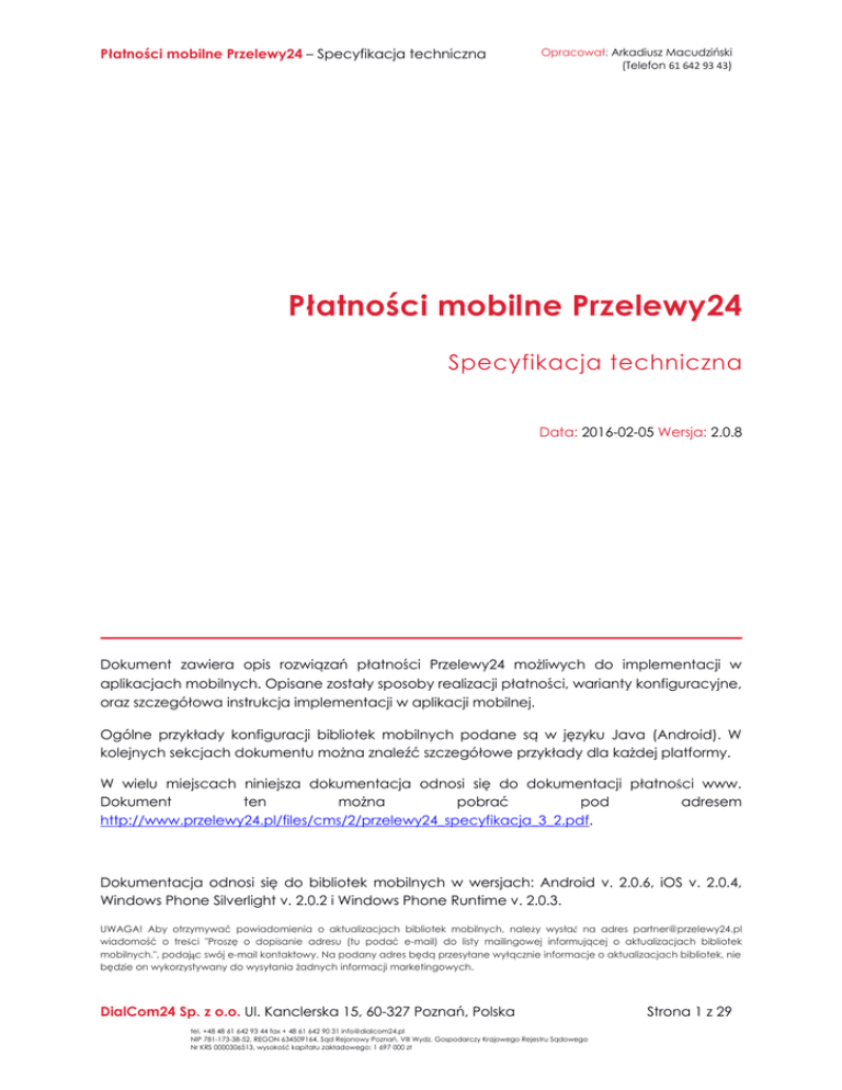 Płatności mobilne Przelewy24 – Specyfikacja techniczna Opracował: Arkadiusz Macudziński (Telefon 61 642 93 43) Płatności mobilne Przelewy24 Specyfikacja techniczna Data: 2016-02-05 Wersja: 2.0.8 Dokument zawiera opis rozwiązań płatności Przelewy24 możliwych do implementacji w aplikacjach mobilnych. Opisane zostały sposoby realizacji płatności, warianty konfiguracyjne, oraz szczegółowa instrukcja implementacji w aplikacji mobilnej. Ogólne przykłady konfiguracji bibliotek mobilnych podane są w języku Java (Android). W kolejnych sekcjach dokumentu można znaleźć szczegółowe przykłady dla każdej platformy. W wielu miejscach niniejsza dokumentacja odnosi się do dokumentacji płatności www. Dokument ten można pobrać pod adresem http://www.przelewy24.pl/files/cms/2/przelewy24_specyfikacja_3_2.pdf. Dokumentacja odnosi się do bibliotek mobilnych w wersjach: Android v. 2.0.6, iOS v. 2.0.4, Windows Phone Silverlight v. 2.0.2 i Windows Phone Runtime v. 2.0.3. UWAGA! Aby otrzymywać powiadomienia o aktualizacjach bibliotek mobilnych, należy wysłać na adres [email protected] wiadomość o treści "Proszę o dopisanie adresu (tu podać e-mail) do listy mailingowej informującej o aktualizacjach bibliotek mobilnych.", podając swój e-mail kontaktowy. Na podany adres będą przesyłane wyłącznie informacje o aktualizacjach bibliotek, nie będzie on wykorzystywany do wysyłania żadnych informacji marketingowych. DialCom24 Sp. z o.o. Ul. Kanclerska 15, 60-327 Poznań, Polska tel. +48 48 61 642 93 44 fax + 48 61 642 90 31 [email protected] NIP 781-173-38-52, REGON 634509164, Sąd Rejonowy Poznań, VIII Wydz. Gospodarczy Krajowego Rejestru Sądowego Nr KRS 0000306513, wysokość kapitału zakładowego: 1 697 000 zł Strona 1 z 29 Płatności mobilne Przelewy24 – Specyfikacja techniczna Opracował: Arkadiusz Macudziński (Telefon 61 642 93 43) Spis treści 1 Natywne biblioteki mobilne (Android, iOS i Windows Phone SDK)...............................................4 1.1 Opis zastosowania.............................................................................................................................4 1.2 Jak wygląda przebieg transakcji przy użyciu biblioteki mobilnej?..............................................4 1.3 Jak zaimplementować w aplikacji płatność „one click” kartą?................................................5 1.4 Jak zainicjować płatność biblioteką mobilną?.............................................................................7 1.4.1 Wejście bezpośrednio z danymi transakcji..................................................................................7 1.4.2 Wejście z tokenem transakcji.........................................................................................................7 1.5 Jak uruchomić transakcję z konkretną metodą płatność?.........................................................8 1.6 Jak ustawić konkretny kanał płatności?.........................................................................................8 1.7 Jak uruchomić tryb testowy?............................................................................................................8 1.8 Jak zweryfikować poprawność transakcji?....................................................................................9 1.8.1 Weryfikacja za pośrednictwem serwera partnera.....................................................................9 1.8.2 Weryfikacja wewnątrz systemu Przelewy24.................................................................................9 1.9 Jak włączyć responsywne strony banków?.................................................................................10 1.10 Jak włączyć zapamiętywanie haseł do banków?...................................................................10 1.11 Jak ustawić domyślnie zapamiętywanie haseł do banków?..................................................10 1.12 Jak włączyć automatyczne kopiowanie haseł SMS?..............................................................10 1.13 Jak automatycznie powrócić do aplikacji w momencie zakończenia transakcji?.............11 1.14 Jak ograniczyć klientowi czas dostępny na zrealizowanie płatności?..................................11 1.15 Jak anulować płatność i wrócić do aplikacji?..........................................................................11 1.16 Jak ustawić styl ActionBar biblioteki dla Androida < 3.0..........................................................11 2 Definicje................................................................................................................................................12 3 Integracja biblioteki Android w projekcie aplikacji.......................................................................12 3.1 Konfiguracja projektu.......................................................................................................................12 3.2 Konfiguracja biblioteki.....................................................................................................................13 3.3 Wywołanie transakcji.......................................................................................................................14 3.4 Obfuskacja projektu aplikacji.........................................................................................................15 DialCom24 Sp. z o.o. Ul. Kanclerska 15, 60-327 Poznań, Polska tel. +48 48 61 642 93 44 fax + 48 61 642 90 31 [email protected] NIP 781-173-38-52, REGON 634509164, Sąd Rejonowy Poznań, VIII Wydz. Gospodarczy Krajowego Rejestru Sądowego Nr KRS 0000306513, wysokość kapitału zakładowego: 1 697 000 zł Strona 2 z 29 Płatności mobilne Przelewy24 – Specyfikacja techniczna Opracował: Arkadiusz Macudziński (Telefon 61 642 93 43) 3.5 Znane błędy.........................................................................................................................