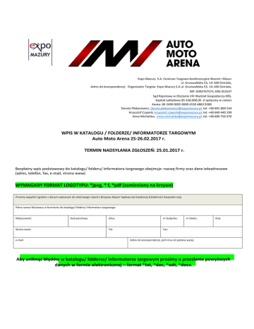 Expo Mazury S.A. Centrum Targowo-Konferencyjne Warmii i Mazur ul. Grunwaldzka 55, 14-100 Ostróda, Adres do korespondencji: Organizator Targów: Expo Mazury S.A ul. Grunwaldzka 55, 14-100 Ostróda, NIP: 8392767573, KRS:351537 Sąd Rejonowy w Olsztynie VIII Wydział Gospodarczy KRS, Kapitał zakładowy 85.428.000,00 zł opłacony w całości Konto: 06 2490 0005 0000 4530 4883 9280 Dorota Plebanowicz, [email protected], tel: +48 691 800 534 Krzysztof Czapnik, [email protected], tel: +48 669 440 339 Anna Michalska, [email protected], tel: +48 609 750 670 WPIS W KATALOGU / FOLDERZE/ INFORMATORZE TARGOWYM Auto Moto Arena 25-26.02.2017 r. TERMIN NADSYŁANIA ZGŁOSZEŃ: 25.01.2017 r. Bezpłatny wpis podstawowy do katalogu/ folderu/ informatora targowego obejmuje: nazwę firmy oraz dane teleadresowe (adres, telefon, fax, e-mail, strona www) WYMAGANY FORMAT LOGOTYPU: *jpeg, * f, *pdf (zamieniony na krzywe) Prosimy wypełnić zgodnie z danymi wpisanym do właściwego rejestru (Krajowy Rejestr Sądowy lub Ewidencja Działalności Gospodarczej). Pełna nazwa Wystawcy w brzmieniu do katalogu/ folderu/ informatora targowego: Miejscowość: Strona www: e-mail: Kod pocztowy: Ulica: nr budynku: Tel: Fax: nr lokalu: Kraj: Adres do korespondencji, jeśli inny niż podany wyżej: Aby uniknąć błędów w katalogu/ folderze/ informatorze targowym prosimy o przesłanie powyższych danych w formie elektronicznej – format *txt, *doc, *odt, *docx. Poniżej można zamieścić dane kontaktowe. imię nazwisko stanowisko telefon E-mail Działając w imieniu Wystawcy, wyrażam zgodę na przetwarzanie danych osobowych przekazanych Organizatorowi w ramach zawierania i wykonywania umowy, w celach promocyjnych i marke ngowych Organizatora, zgodnie z ustawą z dnia 29 sierpnia 1997 r. o ochronie danych osobowych(Dz. U. z 2002 r., nr 101 poz. 926 z późn. zm.). Wystawca ma prawo wglądu do przekazanych danych osobowych, prawo ich poprawiania oraz do żądania zaprzestania ich przetwarzania. ……..……………………. miejsce i data Pieczęć i podpis osoby/osób reprezentujących Wystawcę