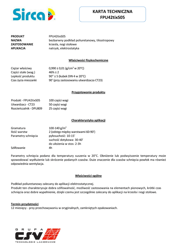 KARTA TECHNICZNA FPU42tixS05 PRODUKT NAZWA ZASTOSOWANIE APLIKACJA FPU42tixS05 bezbarwny podkład poliuretanowy, tiksotropowy krzesła, nogi stołowe natrysk, elektrostatyka Właściwości fizykochemiczne Ciężar właściwy Części stałe (wag.) Lepkość produktu Czas życia mieszanki 0,990 ± 0,01 (g/cm3 w 20°C) 46% ± 2 90” ± 5 (kubek DIN 4 w 20°C) 90’ (przy zastosowaniu utwardzacza CT23) Przygotowanie produktu Produkt - FPU42tixS05 Utwardzacz - CT23 Rozcieńczalnik - DPU809 100 części wagi 50 części wagi 25 części wagi Charakterystyka aplikacji Gramatura Ilość warstw Parametry schnięcia Szlifowanie 100-140 g/m2 2 (odstęp między warstwami 60-90’) pyłosuchość: 10-15’ suchość dotykowa: 30-40’ do ułożenia w stos: 2-3h 4h Parametry schnięcia podano dla temperatury suszenia w 20°C. Obniżenie lub podwyższenie temperatury może spowodować wydłużenie lub skrócenie podanych czasów. Duże znaczenie dla czasów schnięcia powłok ma również odpowiednia wentylacja. Właściwości ogólne Podkład poliuretanowy zalecany do aplikacji elektrostatycznej. Produkt ten charakteryzuje dobra szlifowalność, możliwość zastosowania na elementach pionowych, krótki czas schnięcia oraz dobre wypełnienie, dzięki czemu jest szczególnie zalecany do aplikacji na krzesła i nogi stołowe. Termin przydatności 12 miesięcy - przy przechowywaniu w oryginalnych, zamkniętych opakowaniach. KARTA TECHNICZNA FPU42tixS05 Magazynowanie Przechowywać w miejscach chłodnych i dobrze wentylowanych w temperaturach nie przekraczających 25-28°C. Utwardzacze poliizocyjanianowe są wrażliwe na wilgoć oraz niskie temperatury. W przypadku częściowego wykorzystania produktu opakowanie należy szczelnie zamknąć, a pozostałą ilość zużyć w możliwie najkrótszym czasie. Informacje zawarte w niniejszej karcie technicznej oparte są na naszej najlepszej wiedzy i doświadczeniu. SIRCA gwarantuje niezmienność charakterystyki chemiczno-fizycznej właściwych produktów w granicach tolerancji podanych powyżej. Odpowiedzialność za rezultat końcowy spoczywa na użytkowniku produktu, który powinien zweryfikować przed jego użyciem warunki dotyczące bezpieczeństwa, urządzeń aplikacyjnych, lakierowanego materiału i warunków środowiskowych. Dział techniczny oraz handlowy Grupa CSV i SIRCA pozostaje do dyspozycji, aby wyjaśnić jakiekolwiek problemy związane z właściwym użyciem produktów.