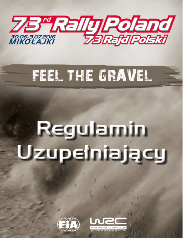 FEEL THE GRAVEL Regulamin Uzupełniający FEEL THE GRAVEL 2 Regulamin Uzupełniający www.rajdpolski.pl FEEL THE GRAVEL »»SPIS TREŚCI 1. Wstęp....................................................................................................................................................2 2. Organizacja..........................................................................................................................................2 3. Program Rajdu oraz ważne terminy.......................................................................................5 4. Zgłoszenia.............................................................................................................................................7 5. Ubezpieczenie..............................................................................................................................................11 6. Reklama i numery identyfikacyjne...........................................................................................12 7. Opony.................................................................................................................................................................13 8. Paliwo...........................................................................................................................................................15 9. Zapoznanie z trasą Rajdu...............................................................................................................17 10. Odbiór administracyjny.......................................................................................................................19 11. Badanie kontrolne BK-1, plombowanie i znakowanie...............................................19 12. Pozostałe procedury............................................................................................................................21 13. Identyfikacja Osób Oficjalnych..................................................................................................24 14. Nagrody..................................................................................................................................................24 15. Badania końcowe i protesty........................................................................................................25 Załącznik 1 – Harmonogram Rajdu....................................................................................27 Załącznik 2 – Harmonogram zapoznania z trasą Rajdu.............................30 Załącznik 3 – Odpowiedzialny za kontakty z zawodnikami.........................31 Załącznik 4 – Numery startowe i reklama...................................................................32 Załącznik 5 – Wyposażenie bezpieczeństwa............................................................33 Załącznik 6 – Konsola bezpieczeństwa FIA, instalacja oraz instrukcja obsługi..............................................................................34 www.rajdpolski.pl Regulamin Uzupełniający 1 FEEL THE GRAVEL »»1. WSTĘP 1.1 Rajd zostanie przeprowadzony zgodnie z postanowieniami Międzynarodowego Kodeksu Sportowego wraz z załącznikami, Regulaminu Sportowego FIA WRC na rok 2016 i niniejszego Regulaminu Uzupełniającego. Modyfikacje, zmiany i/lub uzupełnienia niniejszego Regulaminu Uzupełniającego będą publikowane wyłącznie w numerowanych i datowanych komunikatach (ogłaszanych przez Organizatora lub ZSS). Dodatkowe informacje będą opublikowane w Przewodniku Rajdowym 2, dostępnym od poniedziałku, 30 maja 2016. Regulamin Sportowy FIA WRC znajduje się na stronie www.fia.com W przypadku różnic w interpretacji regulaminu wyłącznie tekst angielski będzie uważany za obowiązujący. 1.2 Nawierzchnia Szuter z krótkimi partiami asfaltu (4,42% łącznej długości odcinków specjalnych ma nawierzchnię asfaltową). 1.3 Całkowita długość OS i trasy Całkowita długość OS: 313,93 km Całkowita długość trasy: 1213,89 km »»2. Organizacja 2.1 Rozgrywki, do których zalicza się Rajd • • • • • • • • • • • • Mistrzostwa FIA WRC Kierowców Mistrzostwa FIA WRC Pilotów Mistrzostwa FIA WRC Producentów Mistrzostwa FIA WRC 2 Zespołów Mistrzostwa FIA WRC 2 Kierowców Mistrzostwa FIA WRC 2 Pilotów Mistrzostwa FIA WRC 3 Zespołów Mistrzostwa FIA WRC 3 Kierowców Mistrzostwa FIA WRC 3 Pilotów Mistrzostwa FIA Junior WRC Kierowców Mistrzostwa FIA Junior WRC Pilotów Drive DMACK Fiesta Trophy 2.2 Numery wiz Wiza FIA: 7WRC/250416 Wiza PZM: WRC/PZM/20160330 2 wydana: 25.04.2016 wydana: 30.03.2016 Regulamin Uzupełniający www.rajdpolski.pl FEEL THE GRAVEL 2.3 Nazwa organizatora, adres i dane kontaktowe Polski Związek Motorowy ul. Kazimierzowska 66 02-518 Warszawa Poland Tel.: +48 22 542 01 16 Mobile: +48 733 893 217 Fax: +48 22 848 77 77 E-mail: [email protected] Strona internetowa: www.rajdpolski.pl 2.4 Komitet Organizacyjny Arkadiusz Sąsara Grzegorz Lewandowski Romuald Chałas Jarosław Noworól Jacek Bartoś Grzegorz Gac Andrzej Borowczyk Krzysztof Maciejewski Przewodniczący Komitetu Organizacyjnego Skarbnik PZM, członek ZG PZM Członek ZG PZM Dyrektor Rajdu Dyrektor ds. Bezpieczeństwa Dyrektor ds. Finansowych i Operacyjnych Dyrektor ds. Mediów Wicedyrektor Rajdu ds. Sportowych 2.5 Zespół Sędziów Sportowych Przewodniczący (wyznaczony przez FIA): Członek (FIA): Członek (PZM): Sekretarz ZSS: 2.6 Delegaci FIA Timo Rautiainen (FIN) Surinder Thatthi (RSA) Łukasz Biegus (POL) Yvonne Gilli Delegat ds. Bezpieczeństwa FIA Michèle Mouton Delegat Sportowy FIAJarmo Mahonen Delegat ds. Mediów FIA Hayley Gallagher Delegat Medyczny FIA Pedro Esteban Delegat Techniczny FIA Jérôme Toquet Asystent Delegata Technicznego FIA Karmo Uusmaa Asystent Delegata Technicznego FIA Clement Clerc Asystent Delegata Technicznego FIA Luca Gibello Asystent Delegata Technicznego FIA Xavier Guegan 2.7 Osoby oficjalne Dyrektor RajduJarosław Noworól Dyre