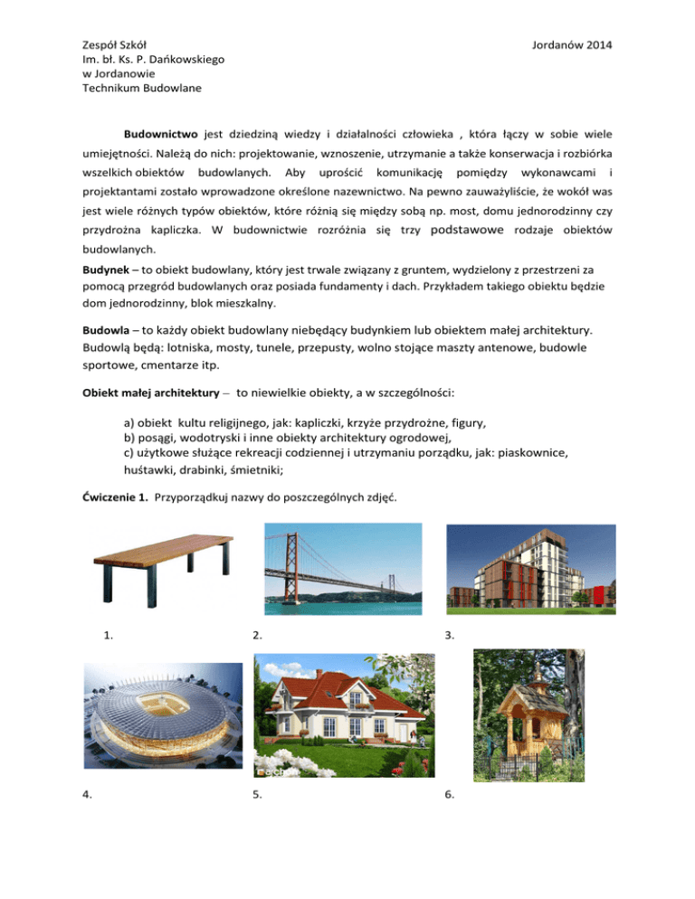 Zespół Szkół Im. bł. Ks. P. Dańkowskiego w Jordanowie Technikum Budowlane Jordanów 2014 Budownictwo jest dziedziną wiedzy i działalności człowieka , która łączy w sobie wiele umiejętności. Należą do nich: projektowanie, wznoszenie, utrzymanie a także konserwacja i rozbiórka wszelkich obiektów budowlanych. Aby uprościć komunikację pomiędzy wykonawcami i projektantami zostało wprowadzone określone nazewnictwo. Na pewno zauważyliście, że wokół was jest wiele różnych typów obiektów, które różnią się między sobą np. most, domu jednorodzinny czy przydrożna kapliczka. W budownictwie rozróżnia się trzy podstawowe rodzaje obiektów budowlanych. Budynek – to obiekt budowlany, który jest trwale związany z gruntem, wydzielony z przestrzeni za pomocą przegród budowlanych oraz posiada fundamenty i dach. Przykładem takiego obiektu będzie dom jednorodzinny, blok mieszkalny. Budowla – to każdy obiekt budowlany niebędący budynkiem lub obiektem małej architektury. Budowlą będą: lotniska, mosty, tunele, przepusty, wolno stojące maszty antenowe, budowle sportowe, cmentarze itp. Obiekt małej architektury – to niewielkie obiekty, a w szczególności: a) obiekt kultu religijnego, jak: kapliczki, krzyże przydrożne, figury, b) posągi, wodotryski i inne obiekty architektury ogrodowej, c) użytkowe służące rekreacji codziennej i utrzymaniu porządku, jak: piaskownice, huśtawki, drabinki, śmietniki; Ćwiczenie 1. Przyporządkuj nazwy do poszczególnych zdjęć. 1. 4. 2. 3. 5. 6. Zespół Szkół Im. bł. Ks. P. Dańkowskiego w Jordanowie Technikum Budowlane Jordanów 2014 Budynek mieszkalny jednorodzinny jest rodzajem obiektu, który zdecydowanie dominuje w naszym krajobrazie. W każdym można wyróżnić pewne podstawowe elementy. W naszym technikum budowlanym zapoznajemy się szczegółowo z ich budową i przeznaczeniem. Na poniższej ilustracji został przedstawione pewne podstawowe elementy budynku. Ćwiczenie 2. Podpisz elementy budynku