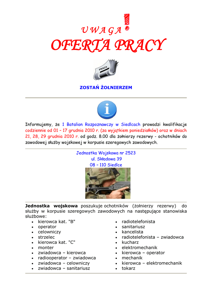 UWAGA OFERTA PRACY ZOSTAŃ ŻOŁNIERZEM Informujemy, że 1 Batalion Rozpoznawczy w Siedlcach prowadzi kwalifikacje codziennie od 01 – 17 grudnia 2010 r. (za wyjątkiem poniedziałków) oraz w dniach 21, 28, 29 grudnia 2010 r. od godz. 8.00 dla żołnierzy rezerwy - ochotników do zawodowej służby wojskowej w korpusie szeregowych zawodowych. Jednostka Wojskowa nr 2523 ul. Składowa 39 08 – 110 Siedlce Jednostka wojskowa poszukuje ochotników (żołnierzy rezerwy) do służby w korpusie szeregowych zawodowych na następujące stanowiska służbowe: kierowca kat. "B" radiotelefonista operator sanitariusz celowniczy kancelista strzelec radiotelefonista – zwiadowca kierowca kat. "C" kucharz monter elektromechanik zwiadowca – kierowca kierowca – operator radiooperator – zwiadowca mechanik zwiadowca – celowniczy kierowca – elektromechanik zwiadowca – sanitariusz tokarz Wymagania od kandydatów: - odbyta w pełni zasadnicza służba wojskowa, - stopień wojskowy - szeregowy lub starszy szeregowy, Do postępowania kwalifikacyjnego proszę posiadać niżej wymienione dokumenty: dowód osobisty, Podatkowej) książeczka wojskowa, numer NIP (Numer Identyfikacji świadectwo ukończenia ostatniej szkoły (najwyższe wykształcenie), dokumenty opiniodawcze uzyskane po odbyciu służby wojskowej (np.: opinia służbowa, pismo pochwalne, list gratulacyjny itp.)- w przypadku ich posiadania inne dokumenty potwierdzające posiadane kwalifikacje, aktualne zaświadczenie lekarskie od lekarza pierwszego kontaktu o braku przeciwwskazań do udziału w egzaminie z wychowania fizycznego, strój sportowy Postępowanie kwalifikacyjne obejmować będzie: - rozmowę kwalifikacyjną, - test sprawności fizycznej: bieg na 3000 m, podciąganie na drążku, skłony w przód oraz bieg wahadłowy 10x10, - wywiad psychologiczny. Szczegółowe informacje dotyczące postępowania kwalifikacyjnego można uzyskać w WKU w Garwolinie w pokoju nr 8 pod nr tel. oraz na stronie internetowej www.garwolin.wku.wp.mil.pl oraz w JW 2523 w Siedlcach pod nr tel. (25) 682 23 15 (22) 281 14 24.