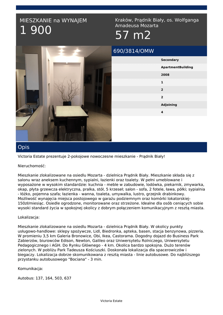 MIESZKANIE na WYNAJEM 1 900 Kraków, Prądnik Biały, os. Wolfganga Amadeusa Mozarta 57 m2 690/3814/OMW Secondary ApartmentBuilding 2008 1 2 2 Adjoining 4 Opis Victoria Estate prezentuje 2-pokojowe nowoczesne mieszkanie - Prądnik Biały! Nieruchomość: Mieszkanie zlokalizowane na osiedlu Mozarta - dzielnica Prądnik Biały. Mieszkanie składa się z salonu wraz aneksem kuchennym, sypialni, łazienki oraz toalety. W pełni umeblowane i wyposażone w wysokim standardzie: kuchnia - meble w zabudowie, lodówka, piekarnik, zmywarka, okap, płyta grzewcza elektryczna, pralka, stół, 5 krzeseł; salon - sofa, 2 fotele, ława, półki; sypialnia - łóżko, pojemna szafa; łazienka - wanna, toaleta, umywalka, lustro, grzejnik drabinkowy. Możliwość wynajęcia miejsca postojowego w garażu podziemnym oraz komórki lokatorskiej150zł/miesiąc. Osiedle ogrodzone, monitorowane oraz strzeżone. Idealne dla osób ceniących sobie wysoki standard życia w spokojnej okolicy z dobrym połączeniem komunikacyjnym z resztą miasta. Lokalizacja: Mieszkanie zlokalizowane na osiedlu Mozarta - dzielnica Prądnik Biały. W okolicy punkty usługowo-handlowe: sklepy spożywcze, Lidl, Biedronka, apteka, basen, stacja benzynowa, pizzeria. W promieniu 3,5 km Galeria Bronowice, Obi, Ikea, Castorama. Dogodny dojazd do Business Park Zabierzów, biurowców Edison, Newton, Galileo oraz Uniwersytetu Rolniczego, Uniwersytetu Pedagogicznego i AGH. Do Rynku Głównego - 4 km. Okolica bardzo spokojna. Dużo terenów zielonych. W pobliżu Park Tadeusza Kościuszki. Doskonała lokalizacja dla spacerowiczów i biegaczy. Lokalizacja dobrze skomunikowana z resztą miasta - linie autobusowe. Do najbliższego przystanku autobusowego "Bociana" - 3 min. Komunikacja: Autobus: 137, 164, 503, 637 Victoria Estate Opłaty: 1900 zł najem + ok. 500 zł (czynsz administracyjny oraz media) Serdecznie polecam i zapraszam do oglądania! Emilia Sumińska tel. +48 512 704 621 email: [email protected] Victoria Estate Powered by TCPDF (www.tcpdf.org)