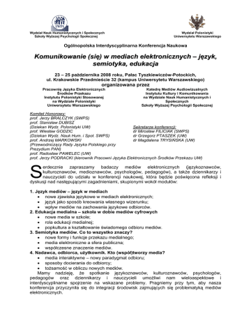 Wydział Nauk Humanistycznych i Społecznych Szkoły Wyższej Psychologii Społecznej Wydział Polonistyki Uniwersytetu Warszawskiego Ogólnopolska Interdyscyplinarna Konferencja Naukowa Komunikowanie (się) w mediach elektronicznych – język, semiotyka, edukacja 23 – 25 października 2008 roku, Pałac Tyszkiewiczów-Potockich, ul. Krakowskie Przedmieście 32 (kampus Uniwersytetu Warszawskiego) organizowana przez Pracownię Języka Elektronicznych Środków Przekazu Instytutu Polonistyki Stosowanej na Wydziale Polonistyki Uniwersytetu Warszawskiego Katedrę Mediów Audiowizualnych Instytutu Kultury i Komunikowania na Wydziale Nauk Humanistycznych i Społecznych Szkoły Wyższej Psychologii Społecznej Komitet Honorowy: prof. Jerzy BRALCZYK (SWPS) prof. Stanisław DUBISZ Sekretarze konferencji: (Dziekan Wydz. Polonistyki UW) dr Mirosław FILICIAK (SWPS) prof. Wiesław GODZIC dr Grzegorz PTASZEK (UW) (Dziekan Wydz. Nauk Hum. i Społ. SWPS) dr Magdalena TRYSIŃSKA (UW) prof. Andrzej MARKOWSKI (Przewodniczący Rady Języka Polskiego przy Prezydium PAN) prof. Radosław PAWELEC (UW) prof. Jerzy PODRACKI (kierownik Pracowni Języka Elektronicznych Środków Przekazu UW) S erdecznie zapraszamy badaczy mediów elektronicznych (językoznawców, kulturoznawców, medioznawców, psychologów, pedagogów), a także dziennikarzy i nauczycieli do udziału w konferencji naukowej, która będzie poświęcona refleksji i dyskusji nad następującymi zagadnieniami, skupionymi wokół modułów: 1. Język mediów – język w mediach • nowe zjawiska językowe w mediach elektronicznych; • język jako sposób kreowania własnego wizerunku; • wpływ mediów na zachowania językowe odbiorców. 2. Edukacja medialna – szkoła w dobie mediów cyfrowych • nowe media w szkole; • rola edukacji medialnej; • popkultura a kształtowanie świadomego odbioru mediów. 3. Semiotyka mediów. Co to wszystko znaczy? • nowe formy i funkcje przekazu medialnego; • media elektroniczne a sfera publiczna; • współczesne znaczenie mediów. 4. Nadawca, odbiorca, użytkownik. Kto (współ)tworzy media? • media interaktywne – nowy paradygmat odbioru; • sposoby docierania do odbiorcy; • tożsamość w obliczu nowych mediów. Mamy nadzieję, że spotkanie językoznawców, kulturoznawców, psychologów, pedagogów oraz dziennikarzy i nauczycieli umożliwi nam wieloaspektowe i interdyscyplinarne spojrzenie na wskazane problemy. Pragniemy przy tym, aby nasza konferencja przyczyniła się do integracji środowisk zajmujących się problematyką mediów elektronicznych. Wydział Nauk Humanistycznych i Społecznych Szkoły Wyższej Psychologii Społecznej Wydział Polonistyki Uniwersytetu Warszawskiego Wszystkich zainteresowanych udziałem w konferencji prosimy o nadsyłanie zgłoszeń wraz z abstraktami planowanych referatów (maksymalnie 1 strona A4). Czas wystąpienia najwyżej 20 minut (8-9 stron znormalizowanego druku). Zastrzegamy sobie prawo selekcji nadsyłanych zgłoszeń. Termin przyjmowania zgłoszeń upływa 9 czerwca 2008 roku. O przyjęciu Państwa wystąpienia poinformujemy w liście pod koniec czerwca 2008 r. W wypadku niezakwalifikowania osoby zgłaszającej się na konferencję przewidujemy przyjęcie tekstu do tomu pokonferencyjnego (jeśli uzyska on pozytywną opinię recenzenta). Opłata konferencyjna, którą należy wnieść na numer konta Wydziału Polonistyki UW 26 1160 2202 0000 0000 6084 9503 z adnotacją konferencja Komunikowanie (się) w mediach elektronicznych do 15 września 2008 r., wynosi 200 złotych i obejmuje: 4 posiłki (kolację dnia pierwszego, dwa obiady, udział w uroczystej kolacji dnia drugiego) oraz publikację tomu pokonferencyjnego. Pośredniczymy w rezerwacji miejsc noclegowych w hotelach uniwersyteckich (więcej informacji w formularzu zgłoszeniowym). UWAGA: Ze względu na dokonywaną przez naszą sekcję finansową zmianę programu do księgowania danych prosimy uprzejmie o przesyłanie także kopii potwierdzeń dokonania przelewu (ksero bądź skan). Zgłoszenia należy przysyłać pocztą tradycyjną na adres: Pracownia Języka Elektronicznych Środków Przekazu Wydział Polonistyki Ul. Krakowskie Przedmieście 26/28 00-927 Warszawa z dopiskiem „Konferencja” albo pocztą elektroniczną na adres e-mail: [email protected] O dalszych szczegółach konferencji poinformujemy Państwa pod koniec czerwca 2008 r. Zapraszamy również do odwiedzania strony internetowej konferencji: www.komunikowanie.swps.edu.pl. W imieniu Komitetu Organizacyjnego