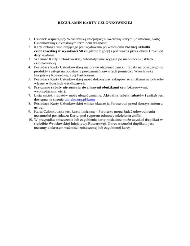 REGULAMIN KARTY CZŁONKOWSKIEJ 1. Członek wspierający Wrocławską Inicjatywę Rowerową otrzymuje imienną Kartę Członkowską z określonym terminem ważności. 2. Karta członka wspierającego jest wydawana po wniesieniu rocznej składki członkowskiej w wysokości 50 zł (płatne z góry) i jest ważna przez okres 1 roku od daty wydania. 3. Ważność Karty Członkowskiej automatycznie wygasa po nieopłaceniu składki członkowskiej. 4. Posiadacz Karty Członkowskiej ma prawo otrzymać zniżki i rabaty na poszczególne produkty i usługi na podstawie porozumień zawartych pomiędzy Wrocławską Inicjatywą Rowerową, a jej Partnerami. 5. Posiadacz Karty Członkowskiej może dokonywać zakupów ze zniżkami na potrzeby własne w ilościach detalicznych. 6. Przyznane rabaty nie sumują się z innymi obniżkami cen (okresowymi, wyprzedażami, etc.). 7. Lista zniżek i rabatów może ulegać zmianie. Aktualna tabela rabatów i zniżek jest dostępna na stronie wir.eko.org.pl/karta 8. Posiadacz Karty Członkowskiej winien okazać ją Partnerowi przed skorzystaniem z usługi. 9. Karta Członkowska jest kartą imienną – Partnerzy mogą żądać udowodnienia tożsamości posiadacza Karty, pod rygorem odmowy udzielenia zniżki. 10. W przypadku zniszczenia lub zagubienia karty posiadacz może uzyskać duplikat w siedzibie Wrocławskiej Inicjatywy Rowerowej. Okres ważności duplikatu jest tożsamy z okresem ważności zniszczonej lub zagubionej karty.