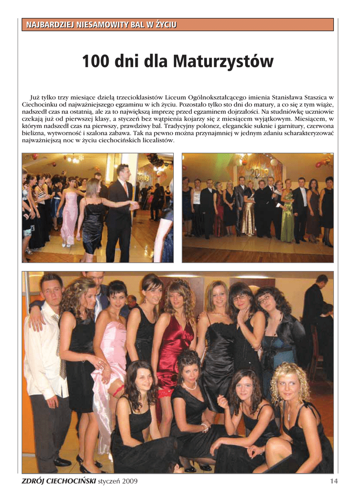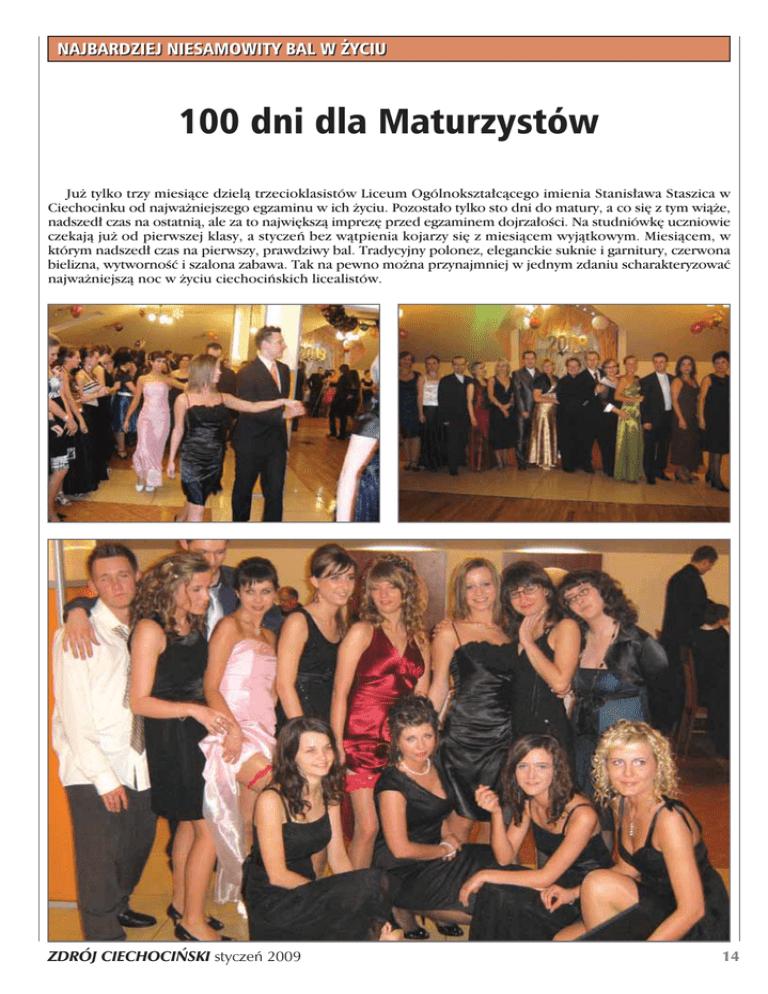 NAJBARDZIEJ NIESAMOWITY BAL W ˚YCIU 100 dni dla Maturzystów Ju˝ tylko trzy miesiàce dzielà trzecioklasistów Liceum Ogólnokszta∏càcego imienia Stanis∏awa Staszica w Ciechocinku od najwa˝niejszego egzaminu w ich ˝yciu. Pozosta∏o tylko sto dni do matury, a co si´ z tym wià˝e, nadszed∏ czas na ostatnià, ale za to najwi´kszà imprez´ przed egzaminem dojrza∏oÊci. Na studniówk´ uczniowie czekajà ju˝ od pierwszej klasy, a styczeƒ bez wàtpienia kojarzy si´ z miesiàcem wyjàtkowym. Miesiàcem, w którym nadszed∏ czas na pierwszy, prawdziwy bal. Tradycyjny polonez, eleganckie suknie i garnitury, czerwona bielizna, wytwornoÊç i szalona zabawa. Tak na pewno mo˝na przynajmniej w jednym zdaniu scharakteryzowaç najwa˝niejszà noc w ˝yciu ciechociƒskich licealistów. ZDRÓJ CIECHOCI¡SKI styczeƒ 2009 14 Anita G∏owacka: - Studniówka to taki dzieƒ w naszym ˝yciu, który zdarza si´ tylko raz. Powinien byç on wyjàtkowy i niepowtarzalny. Sobota, 24 stycznia w∏aÊnie taka by∏a. Panujàca atmosfera jest wr´cz nie do opisanianasze taƒce i zabawy nie mia∏y koƒca. BawiliÊmy si´ znakomicie! Niestety, teraz zosta∏a ju˝ tylko nauka do matury- kolejnego wa˝nego wydarzenia w naszym ˝yciu. Sobota, 24 styczeƒ, godzina 19.00, sala bankietowa „Etna”. Wybi∏a godzina wielkiego wydarzenia. Pe∏ni emocji, ale i te˝ odrobiny niepewnoÊci uczniowie czekali na uroczyste rozpocz´cie tegorocznej studniówki. WÊród goÊci zmartwienie wywo∏a∏ fakt, i˝ balu nie otworzy∏ dyrektor szko∏y, pan Zbigniew Ró˝aƒski. – To naprawd´ wielka szkoda, ˝e Pan Dyrektor nie zaszczyci∏ nas swojà obecnoÊcià i nie wypowiedzia∏ tradycyjnych s∏ów: „poloneza czas zaczàç”- dodaje Mateusz Chrzanowski. Inicjatyw´ jednak przej´li wychowawcy klas trzecich, pani Bogus∏awa Wojno, pani Barbara Barszczewska i pan Andrzej Jaskulski, którzy wspólnymi si∏ami otworzyli t´ niepowtarzalnà imprez´. W rytm poloneza Wojciecha Kilara zataƒczy∏o kilkanaÊcie wspania∏ych par, dzi´ki którym ju˝ od samego poczàtku uroczystoÊç nabra∏a szyku i klasy. Po cz´Êci oficjalnej nadszed∏ czas na szalonà zabaw´. Towarzyszy∏a nam muzyka grana przez zespó∏. MaturzyÊci wraz ze swoimi osobami towarzyszàcymi praktycznie nie opuszczali parkietu, bawiàc si´ kulturalnie i z gracjà. - To prawda, studniówka by∏a imprezà, na której wszyscy zachowywaliÊmy si´ z klasà. Warto dodaç, ˝e jedzenie zachwyca∏o podniebienie ka˝dego goÊcia, a zespó∏ grajàcy pozwala∏ na znakomità zabaw´ zarówno w taƒcach szybkich, jak i wolnych.- stwierdzajà zgodnie Bartosz Chat∏as i Bartosz Wojno. W czasie przerw od taƒca mieliÊmy okazj´ podziwiaç nawzajem swoje pi´kne i eleganckie stroje, które uwiecznione zosta∏y na licznych zdj´ciach. Dla wszystkich studniówka to pierwszy prawdziwy bal, dlatego te˝ uczniowie wyglàdali olÊniewajàco i bardzo oryginalnie. Z wyglàdem zwiàzana jest przecie˝ mnóstwo studniówkowych przesàdów, które rzekomo majà pomóc maturzystom na egzaminie. Podobnie jak polonez, równie stale obowiàzujàcym elementem studniówki sà zwyczaje z nià zwiàzane. TrzecioklasiÊci co roku ÊciÊle przestrzegajà przesàdów, które majà zapewniç im powodzenie. Dziewcz´ta za∏o˝y∏y wi´c czerwonà bielizn´ i podwiàzk´. Wszyscy pami´tajà te˝, ˝e nie mo˝na Êcinaç w∏osów po studniówce, a˝ do matury, 15 a na sam egzamin ch∏opcy na przyk∏ad w∏o˝yç majà ten sam garnitur. Oko∏o godziny 24.00 wychowawcy klas trzecich tradycyjnie zaj´ci byli rozdzielaniem studniówkowego tortu. MieliÊmy tak˝e okazj´ na obejrzenie kabaretu, który przygotowany zosta∏ przez uczniów klasy III c. WÊród wielu opinii maturzystów nie spotka∏am si´ z takà, która wyra˝a∏aby niezadowolenie z zabawy. Pos∏uchajmy wi´c kilku wypowiedzi uczestników sobotniego balu. - Impreza by∏a naprawd´ udana, zabawa do rana, a przy okazji znakomita atmosfera. Bez wàtpienia ciechociƒscy licealiÊci pokazali, jak Êwietnie mo˝na si´ bawiç. Nikt nie zawiód∏. Dobry humor dopisa∏ tak˝e nauczycielom, którzy potrafili przetaƒczyç z nami ca∏à noc. Chwila nie do zapomnienia? Na pewno karaoke w wykonaniu uczniów, a tak˝e urodzinowy taniec naszego kolegi- Kamila Tomczaka, który Êwi´towa∏ swojà „dziewi´tnastk´” w gronie szkolnych przyjació∏ i wychowawczyni. Szkoda, ˝e to tylko jedna taka noc, bo studniówka zlecia∏a niewàtpliwie za szybko. Zdanie Micha∏a potwierdza tak˝e Marta Olszewska, dodajàc:- To prawda, sobotnia noc up∏yn´∏a w niewiarygodnym tempie, w bardzo mi∏ej atmosferze. Zabawa by∏a Êwietna. Uwa˝am, ˝e nie tylko ja, ale i wszyscy dobrze si´ bawili. StworzyliÊmy sobie niesamowity nastrój. Tak jak zamierzaliÊmy, nie by∏o miejsca na zmartwienia zwiàzane z tym, co czeka nas za trzy miesiàce. ZanurzyliÊmy si´ ca∏kowicie w dobrej zabawie. MyÊl´, ˝e nasza studniówka uda∏a si´ w 100% i niczego w niej nie brakowa∏o. Nie mog´ powstrzymaç si´ od powtórzenia zdania, ˝e to wielka szkoda, i˝ zabawa ta trwa∏a tylko jednà noc. Warto tak˝e dodaç, ˝e przewodniczàcy jednej z klas, Mateusz Chrzanowski podkreÊla radoÊç wszystkich uczniów, z faktu, i˝ mogliÊmy na naszym balu goÊciç ksi´dza Zbigniewa Raja, który mimo, ˝e nie jest ju˝ pracownikiem szko∏y, nadal odczuwa z nià szczególnà wi´ê. W bardzo mi∏ej atmosferze min´∏a jedyna i niepowtarzalna noc. Teraz jest ju˝ tylko wspomnieniem, które na pewno przez wiele lat, a mo˝e i nawet ca∏e ˝ycie, b´dzie powraca∏o do nas wszystkich. Bez wàtpieniaciechociƒscy licealiÊci jednog∏oÊnie mogà uznaç studniówk´ 2009 za najbardziej niesamowity bal w ˝yciu. Za sto dni natomiast, prosimy o mocne trzymanie kciuków za nasz egzamin… Daria Der´gowska ZDRÓJ CIECHOCI¡SKI styczeƒ 2009