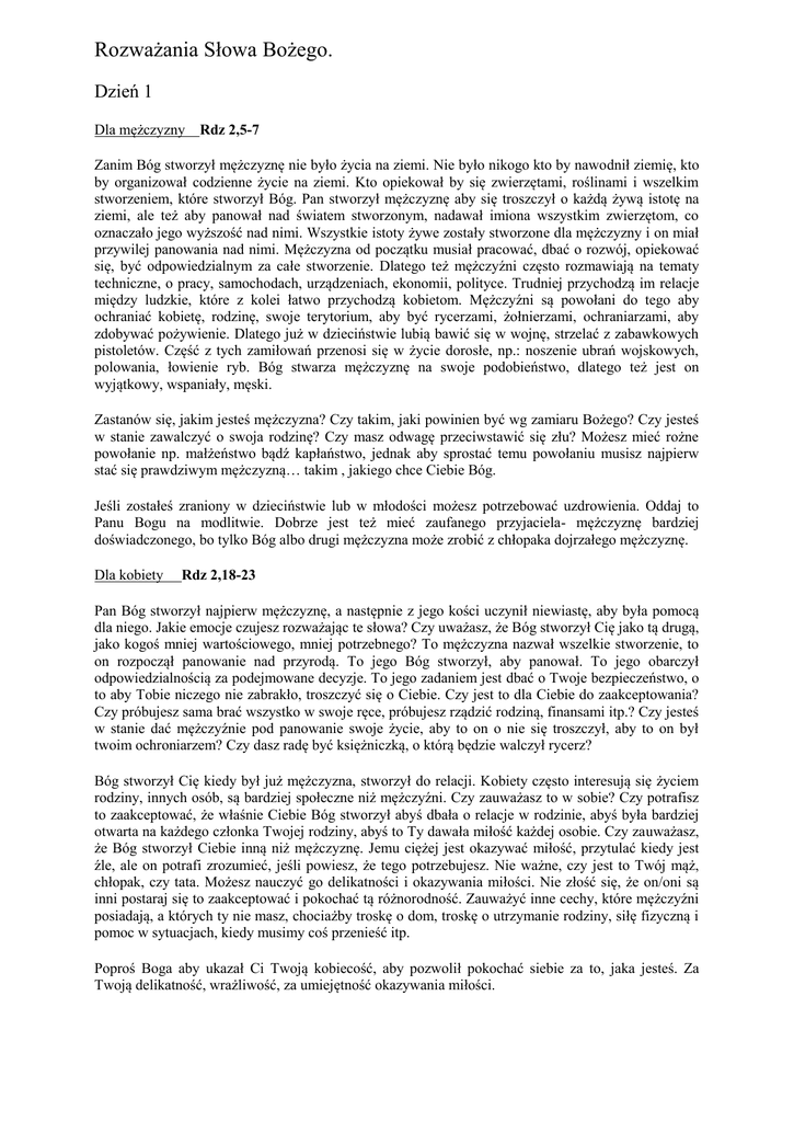 Rozważania Słowa Bożego. Dzień 1 Dla mężczyzny Rdz 2,5-7 Zanim Bóg stworzył mężczyznę nie było życia na ziemi. Nie było nikogo kto by nawodnił ziemię, kto by organizował codzienne życie na ziemi. Kto opiekował by się zwierzętami, roślinami i wszelkim stworzeniem, które stworzył Bóg. Pan stworzył mężczyznę aby się troszczył o każdą żywą istotę na ziemi, ale też aby panował nad światem stworzonym, nadawał imiona wszystkim zwierzętom, co oznaczało jego wyższość nad nimi. Wszystkie istoty żywe zostały stworzone dla mężczyzny i on miał przywilej panowania nad nimi. Mężczyzna od początku musiał pracować, dbać o rozwój, opiekować się, być odpowiedzialnym za całe stworzenie. Dlatego też mężczyźni często rozmawiają na tematy techniczne, o pracy, samochodach, urządzeniach, ekonomii, polityce. Trudniej przychodzą im relacje między ludzkie, które z kolei łatwo przychodzą kobietom. Mężczyźni są powołani do tego aby ochraniać kobietę, rodzinę, swoje terytorium, aby być rycerzami, żołnierzami, ochraniarzami, aby zdobywać pożywienie. Dlatego już w dzieciństwie lubią bawić się w wojnę, strzelać z zabawkowych pistoletów. Część z tych zamiłowań przenosi się w życie dorosłe, np.: noszenie ubrań wojskowych, polowania, łowienie ryb. Bóg stwarza mężczyznę na swoje podobieństwo, dlatego też jest on wyjątkowy, wspaniały, męski. Zastanów się, jakim jesteś mężczyzna? Czy takim, jaki powinien być wg zamiaru Bożego? Czy jesteś w stanie zawalczyć o swoja rodzinę? Czy masz odwagę przeciwstawić się złu? Możesz mieć rożne powołanie np. małżeństwo bądź kapłaństwo, jednak aby sprostać temu powołaniu musisz najpierw stać się prawdziwym mężczyzną… takim , jakiego chce Ciebie Bóg. Jeśli zostałeś zraniony w dzieciństwie lub w młodości możesz potrzebować uzdrowienia. Oddaj to Panu Bogu na modlitwie. Dobrze jest też mieć zaufanego przyjaciela- mężczyznę bardziej doświadczonego, bo tylko Bóg albo drugi mężczyzna może zrobić z chłopaka dojrzałego mężczyznę. Dla kobiety Rdz 2,18-23 Pan Bóg stworzył najpierw mężczyznę, a następnie z jego kości uczynił niewiastę, aby była pomocą dla niego. Jakie emocje czujesz rozważając te słowa? Czy uważasz, że Bóg stworzył Cię jako tą drugą, jako kogoś mniej wartościowego, mniej potrzebnego? To mężczyzna nazwał wszelkie stworzenie, to on rozpoczął panowanie nad przyrodą. To jego Bóg stworzył, aby panował. To jego obarczył odpowiedzialnością za podejmowane decyzje. To jego zadaniem jest dbać o Twoje bezpieczeństwo, o to aby Tobie niczego nie zabrakło, troszczyć się o Ciebie. Czy jest to dla Ciebie do zaakceptowania? Czy próbujesz sama brać wszystko w swoje ręce, próbujesz rządzić rodziną, finansami itp.? Czy jesteś w stanie dać mężczyźnie pod panowanie swoje życie, aby to on o nie się troszczył, aby to on był twoim ochroniarzem? Czy dasz radę być księżniczką, o którą będzie walczył rycerz? Bóg stworzył Cię kiedy był już mężczyzna, stworzył do relacji. Kobiety często interesują się życiem rodziny, innych osób, są bardziej społeczne niż mężczyźni. Czy zauważasz to w sobie? Czy potrafisz to zaakceptować, że właśnie Ciebie Bóg stworzył abyś dbała o relacje w rodzinie, abyś była bardziej otwarta na każdego członka Twojej rodziny, abyś to Ty dawała miłość każdej osobie. Czy zauważasz, że Bóg stworzył Ciebie inną niż mężczyznę. Jemu ciężej jest okazywać miłość, przytulać kiedy jest źle, ale on potrafi zrozumieć, jeśli powiesz, że tego potrzebujesz. Nie ważne, czy jest to Twój mąż, chłopak, czy tata. Możesz nauczyć go delikatności i okazywania miłości. Nie złość się, że on/oni są inni postaraj się to zaakceptować i pokochać tą różnorodność. Zauważyć inne cechy, które mężczyźni posiadają, a których ty nie masz, chociażby troskę o dom, troskę o utrzymanie rodziny, siłę fizyczną i pomoc w sytuacjach, kiedy musimy coś przenieść itp. Poproś Boga aby ukazał Ci Twoją kobiecość, aby pozwolił pokochać siebie za to, jaka jesteś. Za Twoją delikatność, wrażliwość, za umiejętność okazywania miłości. Dzień 2 Rdz 2,18-25 Prośba: o radość z faktu bycia człowiekiem: mężczyzną/kobietą 1. Cóż za dziwne sformułowanie, mówiące o samotności mężczyzny… Przecież przebywał w obecności Boga. A jednak to mu nie wystarczało. A Stwórca widząc tę potrzebę – chce jej zaradzić. To pokazuje, że nikt z nas nie jest powołany do samotności realizującej się jako odseparowanie od ludzi – nawet w imię relacji z Bogiem. Osoby wybierające życie w oblubieńczej relacji z Bogiem nie wykluczają bliskich relacji przyjaźni z innymi ludźmi. Gdyby tak robili… nie byłoby dobrze. 2. Odpowiednia pomoc to taka, która dopełnia potrzebującego tej pomocy w tym, czego mu brakuje. Kobieta jest dopełnieniem mężczyzny, jak mężczyzna jest dopełnieniem kobiety. Bez siebie nawzajem nie mogą rozwinąć pełni swojego człowieczeństwa. Potrzebują siebie nawzajem. Przynieś do Boga swojego współmałżonka/współmałżonkę, przyjaciół płci przeciwnej. Podziękuj Mu za nich. Za co najbardziej chcesz podziękować. A może coś utrudnia dziękczynienie za tę konkretną osobą. Co to jest? Dzień 3 Rdz 2,24-25 Bóg wyraźnie pokazuje w tym fragmencie, że związek małżeński, wszystko zmienia. Kiedy decydujemy się na małżeństwo z naszym wybrankiem, jednocześnie decydujemy, że jest to najważniejsza dla nas osoba. Ważniejsza niż nasi rodzice. Ważniejsza niż nasze dzieci. Łączymy się z drugą osobą tak ściśle, że z dwojga ludzi stajemy się jednością. Ślubujemy sobie miłość, wierność, uczciwość, wchodzimy tak naprawdę cali w przymierze, jakie zawieramy z naszym małżonkiem przed Bogiem. Ten dzień jest wyjątkowy, uroczysty, a pote