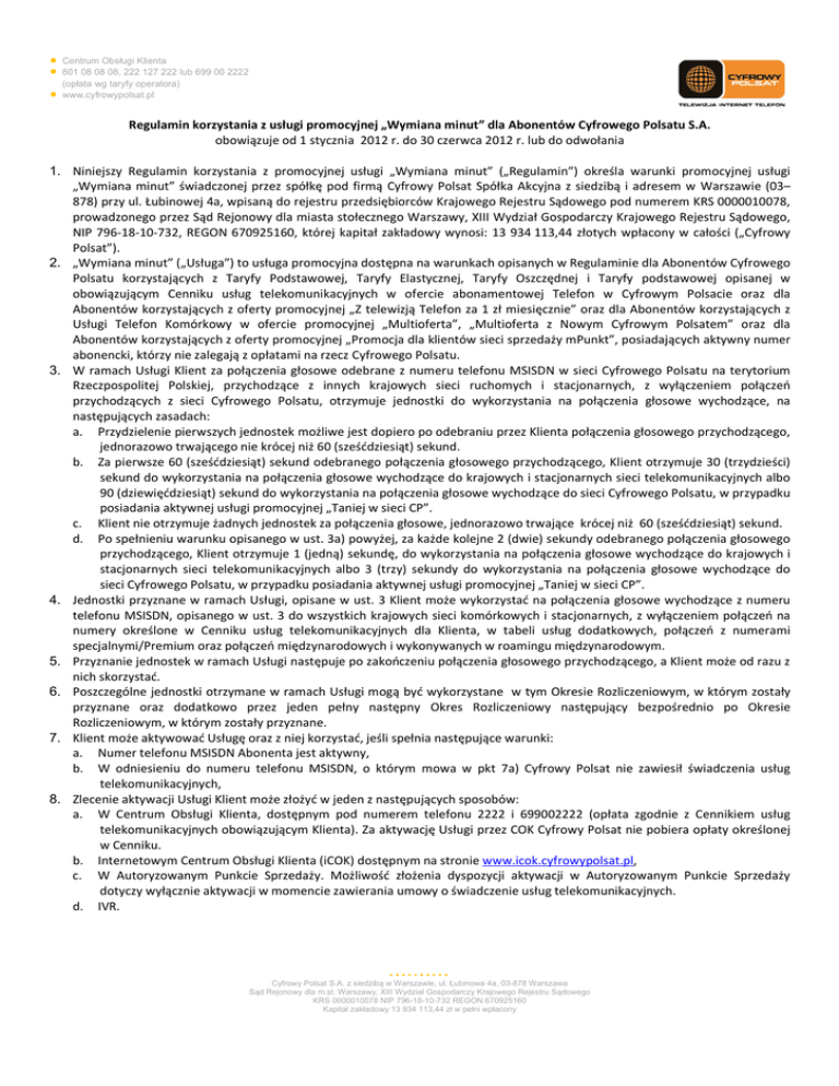 Centrum Obsługi Klienta 801 08 08 08, 222 127 222 lub 699 00 2222 (opłata wg taryfy operatora) www.cyfrowypolsat.pl Regulamin korzystania z usługi promocyjnej „Wymiana minut” dla Abonentów Cyfrowego Polsatu S.A. obowiązuje od 1 stycznia 2012 r. do 30 czerwca 2012 r. lub do odwołania 1. Niniejszy Regulamin korzystania z promocyjnej usługi „Wymiana minut” („Regulamin”) określa warunki promocyjnej usługi „Wymiana minut” świadczonej przez spółkę pod firmą Cyfrowy Polsat Spółka Akcyjna z siedzibą i adresem w Warszawie (03– 878) przy ul. Łubinowej 4a, wpisaną do rejestru przedsiębiorców Krajowego Rejestru Sądowego pod numerem KRS 0000010078, prowadzonego przez Sąd Rejonowy dla miasta stołecznego Warszawy, XIII Wydział Gospodarczy Krajowego Rejestru Sądowego, NIP 796-18-10-732, REGON 670925160, której kapitał zakładowy wynosi: 13 934 113,44 złotych wpłacony w całości („Cyfrowy Polsat”). 2. „Wymiana minut” („Usługa”) to usługa promocyjna dostępna na warunkach opisanych w Regulaminie dla Abonentów Cyfrowego Polsatu korzystających z Taryfy Podstawowej, Taryfy Elastycznej, Taryfy Oszczędnej i Taryfy podstawowej opisanej w obowiązującym Cenniku usług telekomunikacyjnych w ofercie abonamentowej Telefon w Cyfrowym Polsacie oraz dla Abonentów korzystających z oferty promocyjnej „Z telewizją Telefon za 1 zł miesięcznie” oraz dla Abonentów korzystających z Usługi Telefon Komórkowy w ofercie promocyjnej „Multioferta”, „Multioferta z Nowym Cyfrowym Polsatem” oraz dla Abonentów korzystających z oferty promocyjnej „Promocja dla klientów sieci sprzedaży mPunkt”, posiadających aktywny numer abonencki, którzy nie zalegają z opłatami na rzecz Cyfrowego Polsatu. 3. W ramach Usługi Klient za połączenia głosowe odebrane z numeru telefonu MSISDN w sieci Cyfrowego Polsatu na terytorium Rzeczpospolitej Polskiej, przychodzące z innych krajowych sieci ruchomych i stacjonarnych, z wyłączeniem połączeń przychodzących z sieci Cyfrowego Polsatu, otrzymuje jednostki do wykorzystania na połączenia głosowe wychodzące, na następujących zasadach: a. Przydzielenie pierwszych jednostek możliwe jest dopiero po odebraniu przez Klienta połączenia głosowego przychodzącego, jednorazowo trwającego nie krócej niż 60 (sześćdziesiąt) sekund. b. Za pierwsze 60 (sześćdziesiąt) sekund odebranego połączenia głosowego przychodzącego, Klient otrzymuje 30 (trzydzieści) sekund do wykorzystania na połączenia głosowe wychodzące do krajowych i stacjonarnych sieci telekomunikacyjnych albo 90 (dziewięćdziesiąt) sekund do wykorzystania na połączenia głosowe wychodzące do sieci Cyfrowego Polsatu, w przypadku posiadania aktywnej usługi promocyjnej „Taniej w sieci CP”. c. Klient nie otrzymuje żadnych jednostek za połączenia głosowe, jednorazowo trwające krócej niż 60 (sześćdziesiąt) sekund. d. Po spełnieniu warunku opisanego w ust. 3a) powyżej, za każde kolejne 2 (dwie) sekundy odebranego połączenia głosowego przychodzącego, Klient otrzymuje 1 (jedną) sekundę, do wykorzystania na połączenia głosowe wychodzące do krajowych i stacjonarnych sieci telekomunikacyjnych albo 3 (trzy) sekundy do wykorzystania na połączenia głosowe wychodzące do sieci Cyfrowego Polsatu, w przypadku posiadania aktywnej usługi promocyjnej „Taniej w sieci CP”. 4. Jednostki przyznane w ramach Usługi, opisane w ust. 3 Klient może wykorzystać na połączenia głosowe wychodzące z numeru telefonu MSISDN, opisanego w ust. 3 do wszystkich krajowych sieci komórkowych i stacjonarnych, z wyłączeniem połączeń na numery określone w Cenniku usług telekomunikacyjnych dla Klienta, w tabeli usług dodatkowych, połączeń z numerami specjalnymi/Premium oraz połączeń międzynarodowych i wykonywanych w roamingu międzynarodowym. 5. Przyznanie jednostek w ramach Usługi następuje po zakończeniu połączenia głosowego przychodzącego, a Klient może od razu z nich skorzystać. 6. Poszczególne jednostki otrzymane w ramach Usługi mogą być wykorzystane w tym Okresie Rozliczeniowym, w którym zostały przyznane oraz dodatkowo przez jeden pełny następny Okres Rozliczeniowy następujący bezpośrednio po Okresie Rozliczeniowym, w którym zostały przyznane. 7. Klient może aktywować Usługę oraz z niej korzystać, jeśli spełnia następujące warunki: a. Numer telefonu MSISDN Abonenta jest aktywny, b. W odniesieniu do numeru telefonu MSISDN, o którym mowa w pkt 7a) Cyfrowy Polsat nie zawiesił świadczenia usług telekomunikacyjnych, 8. Zlecenie aktywacji Usługi Klient może złożyć w jeden z następujących sposobów: a. W Centrum Obsługi Klienta, dostępnym pod numerem telefonu 2222 i 699002222 (opłata zgodnie z Cennikiem usług telekomunikacyjnych obowiązującym Klienta). Za aktywację Usługi przez COK Cyfrowy Polsat nie pobiera opłaty określonej w Cenniku. b. Internetowym Centrum Obsługi Klienta (iCOK) dostępnym na stronie www.icok.cyfrowypolsat.pl, c. W Autoryzowanym Punkcie Sprzedaży. Możliwość złożenia dyspozycji aktywacji w Autoryzowanym Punkcie Sprzedaży dotyczy wyłącznie aktywacji w momencie zawierania umowy o świadczenie usług telekomunikacyjnych. d. IVR. Cyfrowy Polsat S.A. z siedzibą w Warszawie, ul. Łubinowa 4a, 03-878 Warszawa Sąd Rejonowy dla m.st. Warszawy, XIII Wydział Gospodarczy Krajowego Rejestru Sądowego KRS 0000010078 NIP 796-18-10-732 REGON 670925160 Kapitał zakładowy 13 934 113,44 zł w pełni wpłacony Centrum Obsługi Klienta 801 08 08 08, 222 127 222 lub 699 00 2222 (opłata wg taryfy operatora) www.cyfrowypolsat.pl 9. Zlecenie dezaktywacji (wyłączenia) Usługi Klient może złożyć w jeden z następujących sposobów: a. W Centrum Obsługi Klienta, dostępnym pod numerem telefonu 2222 i 699002222 (opłata zgodnie z Cennikiem usług telekomunikacyjnych obowiązującym Klienta). Za dezaktywację Usługi przez COK Cyfrowy Polsat nie pobier