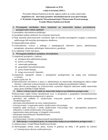 Ogłoszenie nr 8/16 z dnia 6 kwietnia 2016 r. Prezydent Miasta Kędzierzyn-Koźle ogłasza nabór na wolne stanowisko inspektora ds. zbywania gruntów niezabudowanych oraz pierwokupu w Wydziale Gospodarki Nieruchomościami i Planowania Przestrzennego Urzędu Miasta Kędzierzyn-Koźle 1. Wymagania niezbędne, które kandydat na stanowisko będące przedmiotem postępowania winien spełniać: 1) posiadanie obywatelstwa polskiego; 2) posiadanie pełnej zdolności do czynności prawnych; 3) brak skazania prawomocnym wyrokiem sądu za umyślne przestępstwo ścigane z oskarżenia publicznego lub umyślne przestępstwo skarbowe; 4) nieposzlakowana opinia; 5) wykształcenie wyższe z jednego z następujących zakresów: prawo, administracja, zarządzanie, ekonomia, politologia, budownictwo, geodezja; 6) co najmniej 3-letni staż pracy. 2. Wymagania dodatkowe pożądane od kandydata: 1) znajomość przepisów z zakresu: a) postępowania administracyjnego, b) prawa cywilnego, c) samorządu gminnego, d) gospodarki nieruchomościami, e) prawa budowlanego, f) ksiąg wieczystych i hipoteki; 2) znajomość topografii miasta i umiejętność posługiwania się mapą oraz orientacja w terenie; 3) prawo jazdy kat. B; 4) doświadczenie zawodowe w pracy w administracji na stanowisku obejmującym zakres zadań zbieżny z zakresem wykonywanym na stanowisku będącym przedmiotem naboru; 5) stan zdrowia pozwalający na wykonywanie czynności objętych zakresem zadań stanowiska pracy poza siedzibą Urzędu Miasta. 3. Zakres wykonywanych zadań na stanowisku będącym przedmiotem postępowania: Wykonywanie zadań Gminy określonych m.in. w przepisach o gospodarce nieruchomościami w zakresie prowadzenia postępowań w sprawie: - sprzedaży lub oddania w użytkowanie wieczyste gruntów w trybie przetargowym i bezprzetargowym; - zbywania nieruchomości na rzecz cudzoziemców; - rozwiązywania i wygaszania umów użytkowania wieczystego; - ustalenia opłat rocznych z tytułu użytkowania wieczystego oraz sporządzania przypisów należności z tytułu użytkowania wieczystego; - regulowania stanu prawnego w księgach wieczystych; - obciążania nieruchomości służebnościami; - prawa pierwokupu; - wywłaszczania i zwrotu wywłaszczonych nieruchomości. 4. Informacja o warunkach pracy na stanowisku będącym przedmiotem postępowania: 1) miejsce pracy: Urząd Miasta Kędzierzyn-Koźle; 2) obowiązująca norma czasu pracy wynosi 8 godziny na dobę i 40 godzin na tydzień w 3 miesięcznym okresie rozliczeniowym; 3) zastrzega się wolę zatrudnienia wybranego kandydata na okres próbny nie przekraczający 3 miesięcy w celu praktycznego sprawdzenia umiejętności i doświadczenia zawodowego pracownika; 4) jeżeli wybrany kandydat podejmie po raz pierwszy pracę na stanowisku urzędniczym, zostanie skierowany do służby przygotowawczej kończącej się egzaminem; na umotywowany wniosek osoby kierującej komórką organizacyjną, Prezydent Miasta może zwolnić wybranego kandydata z obowiązku odbywania służby przygotowawczej, z zastrzeżeniem konieczności poddania takiego kandydata egzaminowi. 5. Dokumenty wymagane w ofertach pracy składanych przez kandydatów: 1) życiorys zawodowy zawierający wykaz wszystkich dotychczasowych miejsc pracy kandydata z wyszczególnieniem stażu pracy w tych miejscach oraz przebieg nauki z wyszczególnieniem wszystkich ukończonych szkół i uczelni; 2) list motywacyjny; 3) kopia lub odpis dokumentów potwierdzających: a) wykształcenie (dyplom ukończenia szkoły), b) staż pracy (np. świadectw pracy), c) posiadane kwalifikacje i umiejętności (uprawnień, dyplomów, zaświadczeń itp.), d) niepełnosprawność, w przypadku kandydatów, którzy zamierzają skorzystać z uprawnienia do pierwszeństwa do zatrudnienia na stanowiskach urzędniczych, z wyłączeniem kierowniczych stanowisk urzędniczych; 4) oświadczenie o niekaralności za umyślne przestępstwa ścigane z oskarżenia publicznego lub umyślne przestępstwa skarbowe (wybrany kandydat zobowiązany będzie do przedłożenia zaświadczenia o niekaralności wydanego przez Krajowy Rejestr Karny); 5) oświadczenie o posiadaniu przez kandydata pełni praw publicznych. pobierz druk oświadczeń » Załączone: list motywacyjny i życiorys powinny być opatrzone następującą klauzulą: „Wyrażam zgodę na: 1) przetwarzanie moich danych osobowych zawartych w ofercie pracy, 2) przeprowadzenie wywiadu środowiskowego w dotychczasowych miejscach mojej pracy i nauki w celu potwierdzenia spełniania warunku posiadania przeze mnie nieposzlakowanej opinii, dla potrzeb procesu naboru na stanowisko inspektora ds. zbywania gruntów niezabudowanych oraz pierwokupu w Wydziale Gospodarki Nieruchomościami i Planowania Przestrzennego Urzędu Miasta Kędzierzyn-Koźle prowadzonego zgodnie z przepisami ustawy z dnia 21 listopada 2008 r. o pracownikach samorządowych (Dz.U. z 2014 r. poz. 1202); 6) komisja powołana do zaopiniowania kandydatów na stanowisko inspektora ds. zbywania gruntów niezabudowanych oraz pierwokupu w Wydziale Gospodarki Nieruchomościami i Planowania Przestrzennego Urzędu Miasta Kędzierzyn-Koźle uprawniona będzie do ewentualnego żądania dostarczenia brakujących lub uzupełnienia dokumentów złożonych w ofercie pracy w trakcie trwania procesu naboru. Administratorem podanych danych osobowych jest Gmina Kędzierzyn-Koźle, z siedzibą ul. Grzegorza Piramowicza 32, 47-200 Kędzierzyn-Koźle. Dane będą przetwarzane zgodnie z ustawą z dnia 29 sierpnia 1997 r. o ochronie danych osobowych (Dz.U. z 2014 r. poz. 1182 z późn. zm.) w celu prowadzenia procesu naboru. Każda osoba ma prawo dostępu do treści swoich danych oraz ich poprawiania. 6. Przebieg postępowania: Etap pierwszy: 1) ofertę pracy zawierającą wymagane dokumenty należy składać w kopercie z dopiskiem „Oferta pracy - inspektor ds. zbywania gruntów niezabudowanych oraz pierwokupu w Wydziale Gospodarki Nieruchomościami i Planowania Prze