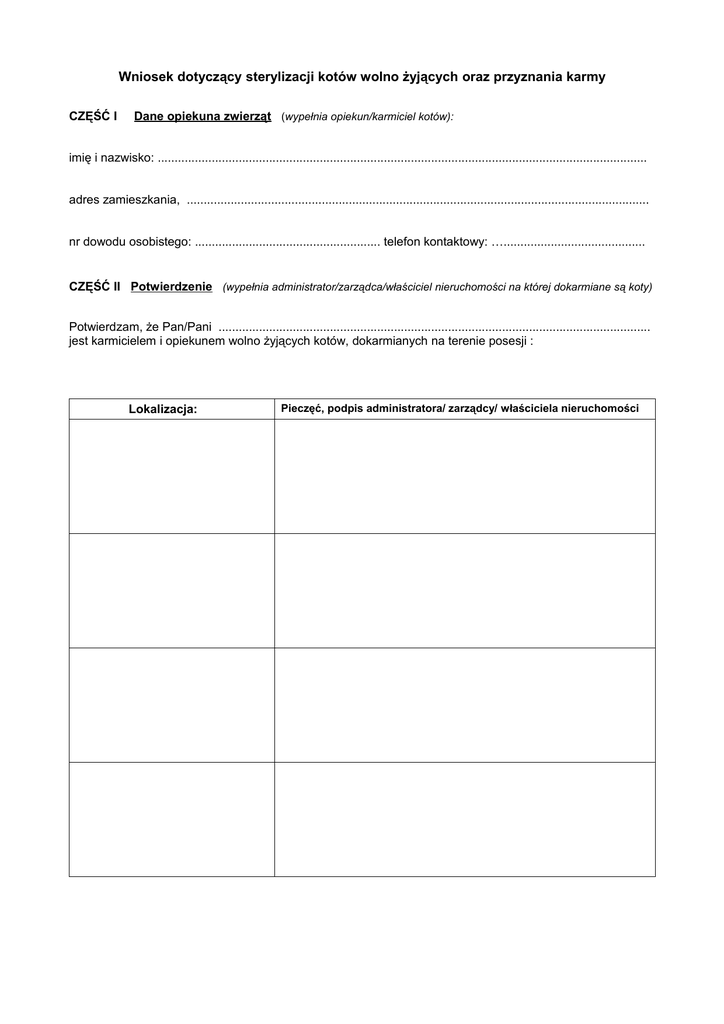 Wniosek dotyczący sterylizacji kotów wolno żyjących oraz przyznania karmy CZĘŚĆ I Dane opiekuna zwierząt (wypełnia opiekun/karmiciel kotów): imię i nazwisko: ................................................................................................................................................. adres zamieszkania, ......................................................................................................................................... nr dowodu osobistego: ....................................................... telefon kontaktowy: ….......................................... CZĘŚĆ II Potwierdzenie (wypełnia administrator/zarządca/właściciel nieruchomości na której dokarmiane są koty) Potwierdzam, że Pan/Pani ................................................................................................................................ jest karmicielem i opiekunem wolno żyjących kotów, dokarmianych na terenie posesji : Lokalizacja: Pieczęć, podpis administratora/ zarządcy/ właściciela nieruchomości CZĘŚĆ III (wypełnia opiekun/ karmiciel kotów): Proszę o pomoc w postaci karmy dla dokarmianych przeze mnie wolno żyjących kotów: Ilość kotów Miejsce dokarmiania zwierząt: CZĘŚĆ IV (wypełnia opiekun/ karmiciel kotów): Proszę o bezpłatną sterylizację kotów wolno żyjących: Ilość sztuk Płeć (jeśli jest znana) Miejsce przebywania zwierzęcia Jednocześnie zobowiązuję się do dostarczenia i odbioru wysterylizowanego zwierzęcia z lecznicy weterynaryjnej po odbyciu rekonwalescencji. W przypadku braku możliwości dostarczenia i odbioru zwierzęcia z przyczyn niezależnych ode mnie sposób dostarczenia i odbioru zwierzęcia uzgodnię z administratorem/zarządcą/ właścicielem nieruchomości oraz lekarzem przeprowadzającym zabieg ............................................................................ podpis opiekuna zwierząt CZĘŚĆ V (wypełnia pracownik Wydziału Ochrony Środowiska Urzędu Miasta Lublin) Opinia komisji: W dniu …......................................................... przyznano ................................... opakowań karmy. W dniu …......................................................... przyznano ................................... opakowań karmy. W dniu …......................................................... przyznano ................................... opakowań karmy. W dniu …......................................................... przyznano ................................... skierowań na sterylizację o numerach: …................................................................................................................................................. W dniu …......................................................... przyznano ................................... skierowań na sterylizację o numerach: …................................................................................................................................................. W dniu …......................................................... przyznano ................................... skierowań na sterylizację o numerach: ….................................................................................................................................................