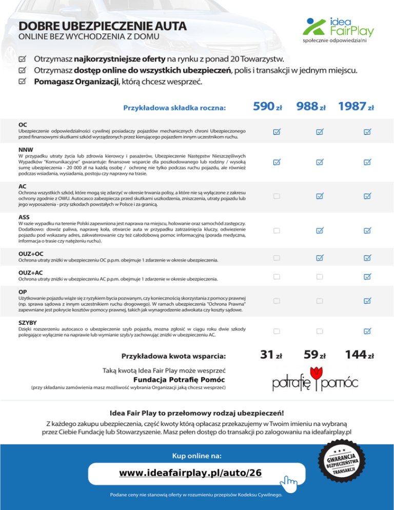 DOBRE UBEZPIECZENIE AUTA ONLINE BEZ WYCHODZENIA Z DOMU Otrzymasz najkorzystniejsze oferty na rynku z ponad 20 Towarzystw. Otrzymasz dostęp online do wszystkich ubezpieczeń, polis i transakcji w jednym miejscu. Pomagasz Organizacji, którą chcesz wesprzeć. Przykładowa składka roczna: 590 zł 988 zł 1987 zł OC Ubezpieczenie odpowiedzialności cywilnej posiadaczy pojazdów mechanicznych chroni Ubezpieczonego przed finansowymi skutkami szkód wyrządzonych przez kierującego pojazdem innym uczestnikom ruchu. NNW W przypadku utraty życia lub zdrowia kierowcy i pasażerów, Ubezpieczenie Następstw Nieszczęśliwych Wypadków "Komunikacyjne" gwarantuje: finansowe wsparcie dla poszkodowanego lub rodziny / wysoką sumę ubezpieczenia - 20 000 zł na każdą osobę / ochronę nie tylko podczas ruchu pojazdu, ale również podczas wsiadania, wysiadania, postoju czy naprawy na trasie. AC Ochrona wszystkich szkód, które mogą się zdarzyć w okresie trwania polisy, a które nie są wyłączone z zakresu ochrony zgodnie z OWU. Autocasco zabezpiecza przed skutkami uszkodzenia, zniszczenia, utraty pojazdu lub jego wyposażenia - przy szkodach powstałych w Polsce i za granicą. ASS W razie wypadku na terenie Polski zapewniona jest naprawa na miejscu, holowanie oraz samochód zastępczy. Dodatkowo: dowóz paliwa, naprawę koła, otwarcie auta w przypadku zatrzaśnięcia kluczy, odwiezienie pojazdu pod wskazany adres, zakwaterowanie czy też całodobową pomoc informacyjną (porada medyczna, informacja o trasie czy natężeniu ruchu). OUZ+OC Ochrona utraty zniżki w ubezpieczeniu OC p.p.m. obejmuje 1 zdarzenie w okresie ubezpieczenia. OUZ+AC Ochrona utraty zniżki w ubezpieczeniu AC p.p.m. obejmuje 1 zdarzenie w okresie ubezpieczenia. OP Użytkowanie pojazdu wiąże się z ryzykiem bycia pozwanym, czy koniecznością skorzystania z pomocy prawnej (np. sprawa sądowa z innym uczestnikiem ruchu drogowego). W ramach ubezpieczenia "Ochrona Prawna" zapewniane jest pokrycie kosztów pomocy prawnej, takich jak wynagrodzenie adwokata czy koszty sądowe. SZYBY Dzięki rozszerzeniu autocasco o ubezpieczenie szyb pojazdu, mozna zgłosić w ciągu roku dwie szkody polegające wyłącznie na naprawie lub wymianie szyb/y zachowując zniżki w ubezpieczeniu AC. Przykładowa kwota wsparcia: 31 zł 59 zł 144 zł Taką kwotą Idea Fair Play może wesprzeć Fundacja Potrafię Pomóc (przy składaniu zamówienia masz możliwość wybrania Organizacji jaką chcesz wesprzeć) Idea Fair Play to przełomowy rodzaj ubezpieczeń! Z każdego zakupu ubezpieczenia, część kwoty którą opłacasz przekazujemy w Twoim imieniu na wybraną przez Ciebie Fundację lub Stowarzyszenie. Masz pełen dostęp do transakcji po zalogowaniu na ideafairplay.pl Kup online na: www.ideafairplay.pl/auto/26 Podane ceny nie stanowią oferty w rozumieniu przepisów Kodeksu Cywilnego.