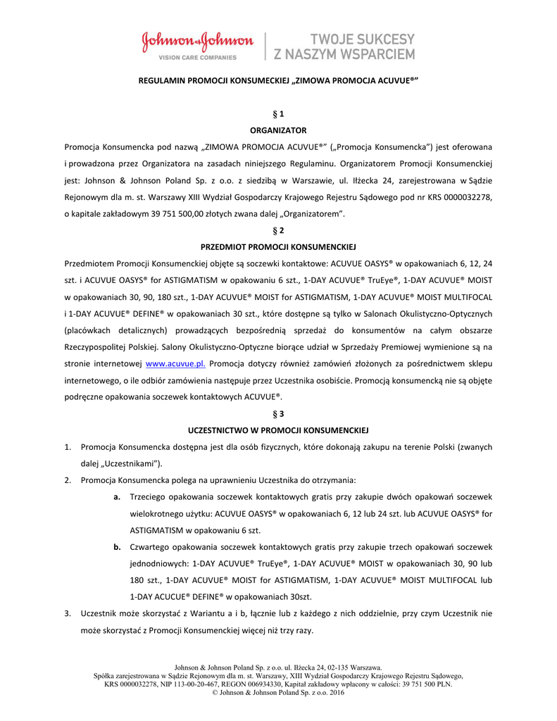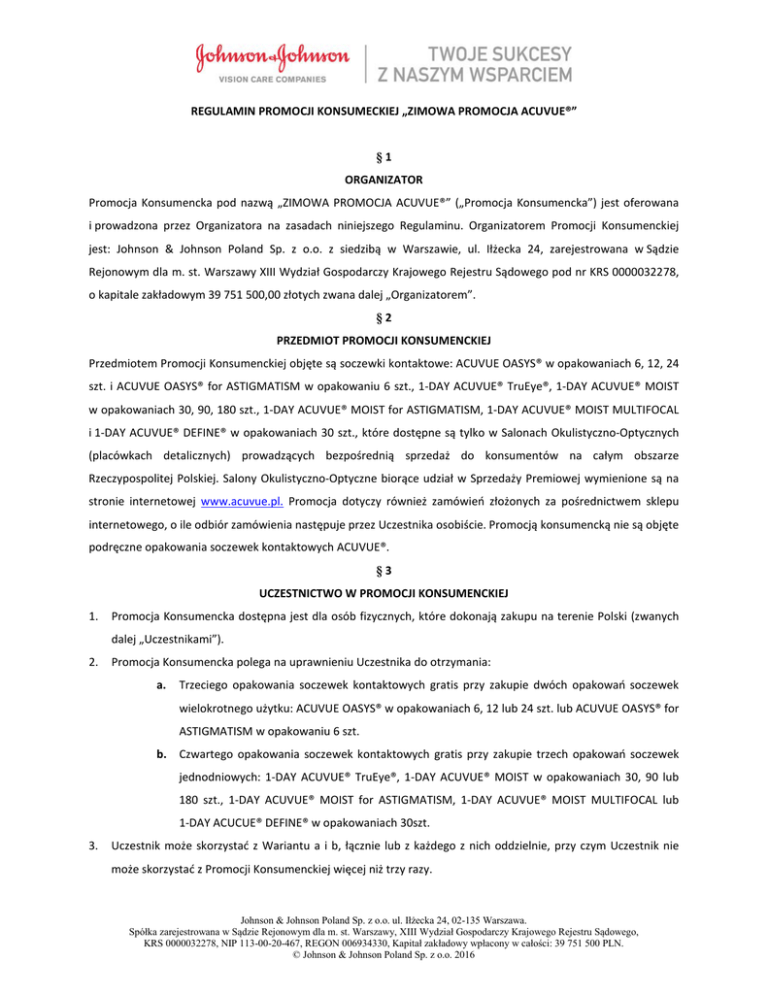 REGULAMIN PROMOCJI KONSUMECKIEJ „ZIMOWA PROMOCJA ACUVUE®” §1 ORGANIZATOR Promocja Konsumencka pod nazwą „ZIMOWA PROMOCJA ACUVUE®” („Promocja Konsumencka”) jest oferowana i prowadzona przez Organizatora na zasadach niniejszego Regulaminu. Organizatorem Promocji Konsumenckiej jest: Johnson & Johnson Poland Sp. z o.o. z siedzibą w Warszawie, ul. Iłżecka 24, zarejestrowana w Sądzie Rejonowym dla m. st. Warszawy XIII Wydział Gospodarczy Krajowego Rejestru Sądowego pod nr KRS 0000032278, o kapitale zakładowym 39 751 500,00 złotych zwana dalej „Organizatorem”. §2 PRZEDMIOT PROMOCJI KONSUMENCKIEJ Przedmiotem Promocji Konsumenckiej objęte są soczewki kontaktowe: ACUVUE OASYS® w opakowaniach 6, 12, 24 szt. i ACUVUE OASYS® for ASTIGMATISM w opakowaniu 6 szt., 1-DAY ACUVUE® TruEye®, 1-DAY ACUVUE® MOIST w opakowaniach 30, 90, 180 szt., 1-DAY ACUVUE® MOIST for ASTIGMATISM, 1-DAY ACUVUE® MOIST MULTIFOCAL i 1-DAY ACUVUE® DEFINE® w opakowaniach 30 szt., które dostępne są tylko w Salonach Okulistyczno-Optycznych (placówkach detalicznych) prowadzących bezpośrednią sprzedaż do konsumentów na całym obszarze Rzeczypospolitej Polskiej. Salony Okulistyczno-Optyczne biorące udział w Sprzedaży Premiowej wymienione są na stronie internetowej www.acuvue.pl. Promocja dotyczy również zamówień złożonych za pośrednictwem sklepu internetowego, o ile odbiór zamówienia następuje przez Uczestnika osobiście. Promocją konsumencką nie są objęte podręczne opakowania soczewek kontaktowych ACUVUE®. §3 UCZESTNICTWO W PROMOCJI KONSUMENCKIEJ 1. Promocja Konsumencka dostępna jest dla osób fizycznych, które dokonają zakupu na terenie Polski (zwanych dalej „Uczestnikami”). 2. Promocja Konsumencka polega na uprawnieniu Uczestnika do otrzymania: a. Trzeciego opakowania soczewek kontaktowych gratis przy zakupie dwóch opakowań soczewek wielokrotnego użytku: ACUVUE OASYS® w opakowaniach 6, 12 lub 24 szt. lub ACUVUE OASYS® for ASTIGMATISM w opakowaniu 6 szt. b. Czwartego opakowania soczewek kontaktowych gratis przy zakupie trzech opakowań soczewek jednodniowych: 1-DAY ACUVUE® TruEye®, 1-DAY ACUVUE® MOIST w opakowaniach 30, 90 lub 180 szt., 1-DAY ACUVUE® MOIST for ASTIGMATISM, 1-DAY ACUVUE® MOIST MULTIFOCAL lub 1-DAY ACUCUE® DEFINE® w opakowaniach 30szt. 3. Uczestnik może skorzystać z Wariantu a i b, łącznie lub z każdego z nich oddzielnie, przy czym Uczestnik nie może skorzystać z Promocji Konsumenckiej więcej niż trzy razy. Johnson & Johnson Poland Sp. z o.o. ul. Iłżecka 24, 02-135 Warszawa. Spółka zarejestrowana w Sądzie Rejonowym dla m. st. Warszawy, XIII Wydział Gospodarczy Krajowego Rejestru Sądowego, KRS 0000032278, NIP 113-00-20-467, REGON 006934330, Kapitał zakładowy wpłacony w całości: 39 751 500 PLN. © Johnson & Johnson Poland Sp. z o.o. 2016 4. Warunkiem skorzystania przez Uczestnika z Promocji Konsumenckiej jest każdorazowe wypełnienie kuponu promocyjnego dla danej transakcji zakupowej (dalej „Kupon Promocyjny) oraz udzielenie zgody na przetwarzanie jego danych osobowych przez Organizatora na potrzeby realizacji Promocji Konsumenckiej. §4 CZAS TRWANIA PROMOCJI KONSUMENCKIEJ 1. Promocja Konsumencka rozpoczyna się dnia 12.12.2016 r. i trwa do dnia 28.02.2017 r. lub wyczerpania zapasów Kuponów Promocyjnych. 2. Regulamin Promocji wraz z załącznikami dostępny jest w siedzibie Organizatora. §5 ZASIĘG TERYTORIALNY PROMOCJI KONSUMENCKIEJ Promocja Konsumencka prowadzona jest na obszarze terytorium Rzeczypospolitej Polskiej. §6 REKLAMACJE 1. Wszelkie reklamacje dotyczące sposobu przeprowadzenia Promocji Konsumenckiej mogą być zgłaszane przez cały czas trwania Promocji Konsumenckiej, nie później jednak niż w terminie do dnia 30.03.2017 r. (decyduje data stempla pocztowego). Reklamacje należy zgłaszać na piśmie i przesyłać listem poleconym na adres: Johnson & Johnson Poland Sp. z o.o. Vision Care, ul. Iłżecka 24, 02-135 Warszawa z dopiskiem „REKLAMACJA”. 2. Forma pisemna reklamacji zastrzeżona jest pod rygorem nieważności. 3. Reklamacja powinna zawierać: 4. a. imię, nazwisko i dokładny adres Uczestnika, ewentualnie nr telefonu kontaktowego, b. dokładny opis i powód reklamacji, c. podpis Uczestnika. Reklamacje rozpatrywane będą w terminie 14 dni od ich otrzymania, przez 3 osobową Komisję powołaną przez Organizatora. 5. Komisja rozpatrywać będzie reklamacje Uczestników na podstawie niniejszego Regulaminu. 6. Decyzja Komisji w przedmiocie reklamacji jest ostateczna i wiążąca. 7. Uczestnik zostanie powiadomiony o decyzji Komisji listem poleconym na adres podany w reklamacji w terminie 14 dni od daty rozpatrzenia reklamacji. §7 DANE OSOBOWE Johnson & Johnson Poland Sp. z o.o. ul. Iłżecka 24, 02-135 Warszawa. Spółka zarejestrowana w Sądzie Rejonowym dla m. st. Warszawy, XIII Wydział Gospodarczy Krajowego Rejestru Sądowego, KRS 0000032278, NIP 113-00-20-467, REGON 006934330, Kapitał zakładowy wpłacony w całości: 39 751 500 PLN. © Johnson & Johnson Poland Sp. z o.o. 2016 1. Administratorem danych osobowych Uczestników zgromadzonych w związku z ich udziałem w Promocji Konsumenckiej jest Organizator, tj. Johnson & Johnson Poland Sp. z o.o. z siedzibą w Warszawie, ul. Iłżecka 24. 2. Przetwarzanie danych osobowych Uczestników odbywa się zgodnie z ustawą z dnia 29 sierpnia 1997 r. o ochronie danych osobowych (t.j. Dz. U. z 2016 r., poz. 922). 3. Organizator będzie przetwarzał dane osobowe Uczestników na potrzeby realizacji Promocji Konsumenckiej, w szczególności w celu weryfikacji spełnienia przez Uczestnika warunków udziału wskazanych w § 3 niniejszego Regulaminu oraz faktu otrzymania przez niego gratisowego opakowania soczewek kontaktowych i w celu rozpatrywania ewentualnych reklamacji w zakresie sposobu przeprowadzenia Promocji Konsumenckiej. 4. Podanie danych osobowych jest dobrowolne, ale niezbędne do skorzystania Promocji Konsumenckiej. Uczestnikowi
