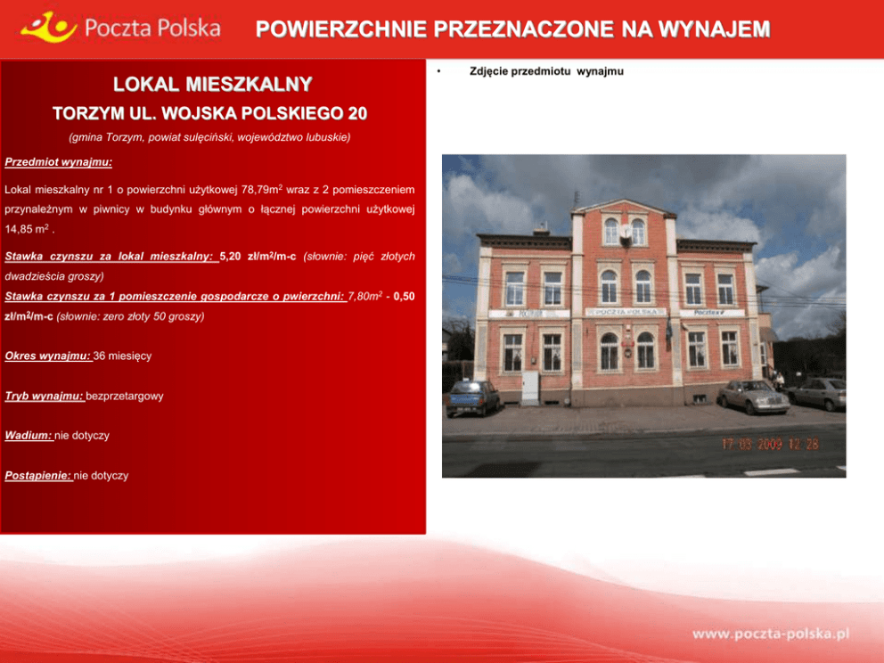 POWIERZCHNIE PRZEZNACZONE NA WYNAJEM LOKAL MIESZKALNY TORZYM UL. WOJSKA POLSKIEGO 20 (gmina Torzym, powiat sulęciński, województwo lubuskie) Przedmiot wynajmu: Lokal mieszkalny nr 1 o powierzchni użytkowej 78,79m2 wraz z 2 pomieszczeniem przynależnym w piwnicy w budynku głównym o łącznej powierzchni użytkowej 14,85 m2 . Stawka czynszu za lokal mieszkalny: 5,20 zł/m2/m-c (słownie: pięć złotych dwadzieścia groszy) Stawka czynszu za 1 pomieszczenie gospodarcze o pwierzchni: 7,80m2 - 0,50 zł/m2/m-c (słownie: zero złoty 50 groszy) Okres wynajmu: 36 miesięcy Tryb wynajmu: bezprzetargowy Wadium: nie dotyczy Postąpienie: nie dotyczy • Zdjęcie przedmiotu wynajmu Kliknij i zlokalizuj na mapie Opis przedmiotu wynajmu: Pokoje nr 1, 2, 3 Lokal mieszkalny usytuowany jest na I piętrze i poddaszu, budynku stanowiącego własność Poczty Polskiej S.A. składa się z 4 izb, o łącznej powierzchni użytkowej 78,79 m², w tym powierzchni pokoi 54,43 m² (1 pokój 22,52 m², 2 pokój 19,45 m² , 3 pokój 12,46 m²), kuchni 10,67 m², łazienki 6,39 m², wc 1,08 m², przedpokój 0,64 m² , korytarz 5,58 m². Lokal wyposażony jest w instalacje: elektryczną, wodną (miejską), kanalizacyjną (miejską), system centralnego ogrzewania – własna kotłownia gazowa Niezależnie od czynszu Najemca będzie ponosił opłaty za : •powierzchnię dodatkową 0,50 zł/m² x 7,80m2 = 3,90 zł miesięcznie netto, •centralne ogrzewanie w formie zaliczki miesięcznie w wysokości:3,23zł/m2 netto x 78,79m3/m2 =254,49zł netto + podatek VAT (wg obowiązującej stawki), •dostarczanie wody zimnej (według odczytu wodomierzy/2,75 zł/m3 netto x …..m3 = …… zł netto + podatek VAT (wg obowiązującej stawki), •odprowadzanie ścieków (według odczytu wodomierzy /4,58zł/m3 netto x ……m3 = …….. zł netto + podatek VAT(wg obowiązującej stawki , •energia elektryczna,odbiór odpadów stałych w ramach samodzielnie podpisanych umów z usługodawcami, •brak bieżącej ciepłej wody. Wytworzenie we własnym zakresie •Kuchnia, Łazienka,wc, Opis nieruchomości: Miejscowość Torzym Ulica, nr budynku Wojska Polskiego 20 Powierzchnia budynku, w których zlokalizowany jest przedmiot wynajmu 484,48m2 Nr działki ewidencyjnej, obręb 96, 0073Torzym Księga wieczysta, Sąd Rejonowy, Nr Wydziału GW1U/00016053/8 prowadzona przez Sąd Rejonowy w Sulęcinie Wydział Ksiąg Wieczystych Stan prawny gruntu Użytkowanie wieczyste stanowiące własność Poczty Polskiej S.A. Lokalizacja i dostępność komunikacyjna: Nieruchomość położona jest w Torzymiu, obręb Torzym przy ul. Wojska Polskiego 20 – w centrum miasta – w odległości około 5km od wjazdu na autostradę A2. Od północy i zachodu działka graniczy z nieruchomościami zabudowanymi budynkami mieszkalnymi,, od południa z droga krajową. Od strony wschodniej z ogrodem. Wzdłuż ulicy Wojska Polskiego dominuje zabudowa zwarta – budynki prywatne i użyteczności publicznej. Miejscowość dobrze skomunikowana z miastem powiatowym Sulęcin. • Mapa sytuacyjna miejscowości Opis nieruchomości: Nieruchomość zabudowana jest : budynkiem głównym i budynkiem gospodarczym •Zdjęcia budynków •Zdjęcia nieruchomości OBWIESZCZENIE O KONKURSIE OFERT NA NAJEM CZĘŚCI NIERUCHOMOŚCI Wynajmujący: POCZTA POLSKA S.A. z siedzibą w Warszawie, 00-940 Warszawa, ul. Rodziny Hiszpańskich 8 Prowadzący konkurs ofert: Poczta Polska S.A., Pion Infrastruktury Obszar Operacyjny ds. Nieruchomości w Poznaniu, ul. Głogowska 17, 60-943 Poznań. Miejsce składania ofert: Poczta Polska S.A. Pion Infrastruktury Obszar Operacyjny ds. Nieruchomości w Poznaniu, ul. Jagiellończyka 4, 66-400 Gorzów Wlkp. pokój nr 207 ogłasza konkurs ofert. Przedmiot najmu: Łączna powierzchnia użytkowa lokalu mieszkalnego wynosi – 78,79 m2. W pomieszczeniach lokalu zamontowane są grzejniki konwektorowe, płytowe. Stolarka okienna plastikowa i drewniana, oszklenie pełne. Drzwi wejściowe drewniane w stanie dobrym. Podłogi – w pokojach podłoga drewniana –deski sosnowe pokryte wykładziną w łazience płytki ceramiczne w stanie dobrym. Otynkowanie ścian i sufitów w stanie dobrym. Lokal wyposażony w instalacje: elektryczną, wodno-kanalizacyjną, wentylacyjną, centralnego ogrzewania z lokalnej kotłowni gazowej – wszystkie instalacje są sprawne. Ogólny stan techniczny lokalu dobry. Charakterystyka nieruchomości: Nieruchomość znajduje się w centrum miasta. W sąsiedztwie nieruchomości znajduje się zabudowa usługowo-handlowa, mieszkalna. Na parterze budynku znajduje się Urząd Pocztowy Torzym, na I piętrze inny lokal mieszkalny. Minimalna stawka czynszu netto: 5,20 zł/m2/m-c (słownie: pięć i 20/100 złotych) za 1 metr kwadratowy powierzchni mieszkalnej, 0,50 zł/m2/m-c (słownie: zero i 50/100 złotych) z za 1 metr kwadratowy dla 1pomieszczenia gospodarczego o łącznej powierzchni 7,80m2 Postąpienia: nie dotyczy Wadium: nie dotyczy Termin składania ofert: bez ograniczeń czasowych Warunkiem przystąpienia do konkursu ofert jest: 1. Złożenie przez Oferenta pisemnej oferty zawierającej nazwę i adres oferenta, stawkę czynszu netto za 1 metr kwadratowy pow. lokalu mieszkalnego. 2. Ofertę należy przesłać w zamkniętej kopercie na adres: Poczta Polska S.A. Pion Infrastruktury, Obszar Operacyjny ds. Nieruchomości w Poznaniu Dział Administrowania Nieruchomościami i Konserwacji, ul. Jagiellończyka 4, 66-400 Gorzów Wlkp., pokój nr 207 z dopiskiem „Oferta – wynajem lokalu mieszkalnego w Torzym’ Okres wiązania ofert wynosi 2 miesiące od dnia złożenia oferty. Informacje na temat powierzchni oraz termin oględzin pomieszczeń można uzgodnić w dni powszednie w godz. od 07.30 do 15.30 po uprzednim kontakcie z pracownikiem merytorycznym – p. Franciszkiem Szymańczuk tel. 95 7210227, kom. 502 016 149, 502 016 066). POCZTA POLSKA S.A. ZASTRZEGA SOBIE PRAWO UNIEWAŻNIENIA PRZETARGU W KAŻDYM CZASIE BEZ PODANIA PRZYCZYN I 
