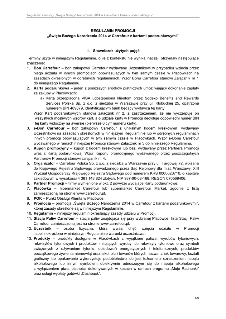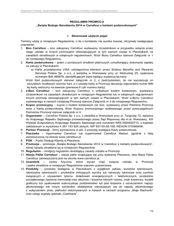 Regulamin Promocji „Święta Bożego Narodzenia 2014 w Carrefour z kartami podarunkowymi” REGULAMIN PROMOCJI „Święta Bożego Narodzenia 2014 w Carrefour z kartami podarunkowymi” I. Słowniczek użytych pojęć Terminy użyte w niniejszym Regulaminie, o ile z kontekstu nie wynika inaczej, otrzymały następujące znaczenie: 1. Bon Carrefour – bon zakupowy Carrefour wydawany Uczestnikowi w przypadku wzięcia przez niego udziału w innych promocjach obowiązujących w tym samym czasie w Placówkach na zasadach określonych w odrębnych regulaminach. Wzór Bonu Carrefour stanowi Załącznik nr 1 do niniejszego Regulaminu. 2. Karta podarunkowa – jeden z poniższych środków płatniczych umożliwiający dokonanie zapłaty za zakupy w Placówkach: a) Karta przedpłacona VISA udostępniona klientom przez Sodexo Benefits and Rewards Services Polska Sp. z o.o. z siedzibą w Warszawie przy ul. Kłobuckiej 25, opatrzona numerem BIN 469879, identyfikującym bank będący wydawcą tej karty Wzór Kart podarunkowych stanowi załącznik nr 2, z zastrzeżeniem, że nie wyczerpuje on wszystkich możliwych wzorów kart, a o udziale karty w Promocji decyduje odpowiedni numer BIN tej karty widoczny na awersie (pierwsze 6 cyfr numeru karty). 3. e-Bon Carrefour – bon zakupowy Carrefour z unikalnym kodem kreskowym, wydawany Uczestnikowi na zasadach określonych w niniejszym Regulaminie lub w odrębnych regulaminach innych promocji obowiązujących w tym samym czasie w Placówkach. Wzór e-Bonu Carrefour wydawanego w ramach niniejszej Promocji stanowi Załącznik nr 3 do niniejszego Regulaminu. 4. Kupon promocyjny – kupon z kodem kreskowym lub bez, wydawany przez Partnera Promocji wraz z Kartą podarunkową. Wzór Kuponu promocyjnego wydawanego przez poszczególnych Partnerów Promocji stanowi załącznik nr 4. 5. Organizator – Carrefour Polska Sp. z o.o. z siedzibą w Warszawie przy ul. Targowej 72, wpisana do Krajowego Rejestru Sądowego prowadzonego przez Sąd Rejonowy dla m.st. Warszawy, XIII Wydział Gospodarczy Krajowego Rejestru Sądowego pod numerem KRS 0000020710, o kapitale zakładowym w wysokości 4 361 143 824 złotych, NIP 937-00-08-168, REGON 070569406. 6. Partner Promocji – firmy wymienione w pkt. 2 powyżej wydające Karty podarunkowe. 7. Placówka – hipermarket Carrefour lub supermarket Carrefour Market, zgodnie z listą zamieszczoną na stronie www.carrefour.pl. 8. POK – Punkt Obsługi Klienta w Placówce. 9. Promocja – promocja „Święta Bożego Narodzenia 2014 w Carrefour z kartami podarunkowymi”, której zasady określone są w niniejszym Regulaminie. 10. Regulamin – niniejszy regulamin określający zasady udziału w Promocji. 11. Stacja Paliw Carrefour – stacja paliw znajdująca się przy wybranej Placówce, lista Stacji Paliw Carrefour zamieszczona jest na stronie www.carrefour.pl. 12. Uczestnik – osoba fizyczna, która wyrazi chęć wzięcia udziału w Promocji i spełni określone w niniejszym Regulaminie warunki uczestnictwa. 13. Produkty – produkty dostępne w Placówkach z wyjątkiem paliwa, wyrobów tytoniowych, rekwizytów tytoniowych i produktów imitujących wyroby lub rekwizyty tytoniowe oraz symboli związanych z używaniem tytoniu, doładowań energetycznych i telefonicznych, produktów początkowego żywienia niemowląt oraz alkoholu i towarów których nazwa, znak towarowy, kształt graficzny lub opakowanie wykorzystuje podobieństwo lub jest tożsame z oznaczeniem napoju alkoholowego lub innym symbolem obiektywnie odnoszącym się do napoju alkoholowego z wyłączeniem piwa, płatności dokonywanych w kasach w ramach programu „Moje Rachunki” oraz usługi wypłaty gotówki „Cashback”. 1/9 Regulamin Promocji „Święta Bożego Narodzenia 2014 w Carrefour z kartami podarunkowymi” II. Zasady ogólne 1. Promocja obowiązuje w Placówkach w okresie od dnia 2 listopada 2014 roku do dnia 31 stycznia 2015 roku. 2. W ramach Promocji Uczestnik za zakup Produktów dokonany przy użyciu Karty podarunkowej w okresie trwania Promocji może otrzymać premię w postaci e-bonu Carrefour. 3. Promocja odbywać się będzie zgodnie z jej Regulaminem. Prawa i obowiązki Organizatora oraz Uczestników określone są wyłącznie w niniejszym Regulaminie oraz we właściwych przepisach prawa. 4. Wszelkie informacje o Promocji dostępne w materiałach reklamowych mają jedynie charakter informacyjny. III. Warunki otrzymania premii w postaci e-Bonu Carrefour 1. Warunkiem otrzymania przez Uczestnika premii w postaci e-Bonu Carrefour jest spełnienie łącznie poniższych warunków: a) dokonanie w Placówce w okresie obowiązywania Promocji zakupu Produktów o łącznej wartości przewyższającej lub równej 100 złotych brutto po uwzględnieniu rabatów naliczanych bezpośrednio przy kasie; b) przekazanie kasjerowi Kuponu promocyjnego z kodem kreskowym w trakcie skanowania produktów przez kasjera – nie dotyczy Kart podarunkowych wymienionych w punkcie I.2.a) i b); c) dokonanie płatności za Produkty środkiem płatniczym w postaci Karty podarunkowej na kwotę przewyższającą lub równą 100 złotych brutto. 2. Wartość otrzymanego e-Bonu Carrefour w ramach niniejszej Promocji uzależniona jest od ostatecznej kwoty zapłaconej Kartą podarunkową za zakup Produktów i przyznawana jest według następującego schematu: w przypadku zakupu Produktów za kwotę od 100,00 złotych brutto do 149,99 złotych brutto – e-Bon Carrefour o wartości 10,00 złotych brutto; w przypadku zakupu Produktów za kwotę od 150,00 złotych brutto do 199,99 złotych brutto – e-Bon Carrefour o wartości 15,00 złotych brutto; w przypadku zakupu Produktów za kwotę od 200,00 złotych brutto do 249,99 złotych brutto – e-Bon Carrefour o wartości 20,00 złotych brutto; w przypadku zakupu Produktów za kwotę od 250,00 złotych brutto do 299,99 złotych brutto – e-Bon Carrefour o wartości 25,00 złotych brutto; w przypadku zakupu Produktów za kwotę od 300,00