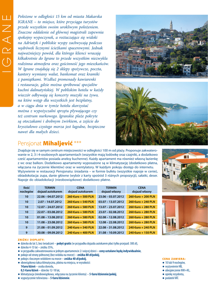 IGRANE Położone w odległości 15 km od miasta Makarska IGRANE – to miejsce, które przyciąga turystów przede wszystkim swoim urokliwym położeniem. Znaczne oddalenie od głównej magistrali zapewnia spokojny wypoczynek, a roztaczające się widoki na Adriatyk i pobliskie wyspy zachwycają podczas wędrówek licznymi ścieżkami spacerowymi. Jednak najważniejszy powód, dla którego klienci wracają kilkakrotnie do Igrane to przede wszystkim niezwykła rodzinna atmosfera oraz gościnność jego mieszkańców. W Igrane znajdują się 2 sklepy spożywcze, poczta, kantory wymiany walut, bankomat oraz kramiki z pamiątkami. Wzdłuż promenady kawiarenki i restauracje, gdzie można spróbować specjałów kuchni dalmatyńskiej. W pobliskim hotelu w każdy wieczór odbywają się koncerty muzyki na żywo, na które wstęp dla wszystkich jest bezpłatny, a w ciągu dnia w tymże hotelu skorzystać można z wypożyczalni sprzętu pływającego czy też centrum nurkowego. Igranskie plaże pokryte są otoczakami i drobnym żwirkiem, a zejście do kryształowo czystego morza jest łagodne, bezpieczne nawet dla małych dzieci. Pensjonat Mihaljević *** Znajduje się w samym centrum miejscowości w odległości 100 m od plaży. Proponuje zakwaterowanie w 2, 3 i 4-osobowych apartamentach (wszystkie mają lodówkę oraz czajniki, a dodatkowo cześć apartamentów posiada aneksy kuchenne). Każdy apartament ma również własną łazienkę z wc oraz balkon. Dodatkowo apartamenty wyposażone są w klimatyzację (dodatkowo płatna, włączana na życzenie klientów) oraz w wentylatory. W każdym pokoju dostęp do internetu. Wyżywienie w restauracji Pensjonatu: śniadania – w formie bufetu (wszystkie napoje w cenie), obiadokolacja: zupa, danie główne (wybór z karty spośród 3 różnych propozycji), sałatki, deser. Napoje do obiadokolacji (nieobowiązkowe) dodatkowo płatne. Ilość noclegów TERMIN dojazd autokarem CENA dojazd autokarem TERMIN dojazd własny CENA dojazd własny 10 22.06 – 04.07.2012 260 €uro + 500 PLN 23.06 – 03.07.2012 260 €uro + 200 PLN 10 2.07 – 14.07.2012 260 €uro + 540 PLN 03.07 – 13.07.2012 260 €uro + 240 PLN 10 12.07 – 24.07.2012 260 €uro + 580 PLN 13.07 – 23.07.2012 260 €uro + 280 PLN 10 22.07 – 03.08.2012 260 €uro + 580 PLN 23.07 – 02.08.2012 260 €uro + 280 PLN 10 01.08 – 13.08.2012 260 €uro + 580 PLN 02.08 – 12.08.2012 260 €uro + 280 PLN 10 11.08 – 23.08.2012 260 €uro + 580 PLN 12.08 – 22.08.2012 260 €uro + 280 PLN 9 21.08 – 01.09.2012 240 €uro + 540 PLN 22.08 – 31.08.2012 240 €uro + 240 PLN 9 30.08 – 09.09.2012 240 €uro + 400 PLN 31.08 – 10.09.2012 240 €uro + 150 PLN ZNIŻKI/ DOPŁATY: ●● dziecko do lat 3, bez świadczeń – pobyt gratis (w przypadku dojazdu autokarem płaci tylko przejazd: 300 zł), ●● dziecko 4-13 lat – zniżka 35%, ●● w przypadku zakwaterowania w jednym apartamencie 2 i więcej dzieci – ceny ustalane będą indywidualnie, ●● pokoje od strony północnej (bez widoku na morze) – zniżka 80 zł/pokój, ●● pokoje z bocznym widokiem na morze – zniżka 40 zł/pokój, ●● obowiązkowa taksa klimatyczna, płatna na miejscu, w wysokości: 1€uro/dzień – osoba dorosła, 0,5 €uro/dzień – dziecko 12-18 lat, ●● klimatyzacja (nieobowiązkowa, włączana na życzenie klienta) – 5 €uro/dziennie/pokój, ●● wypożyczenie telewizora – 5 €uro/dziennie. CENA ZAWIERA: ●● 10 lub 9 noclegów, ●● wyżywienie HB, ●● ubezpieczenie NW+KL, ●● opiekę rezydenta, ●● podatek VAT.